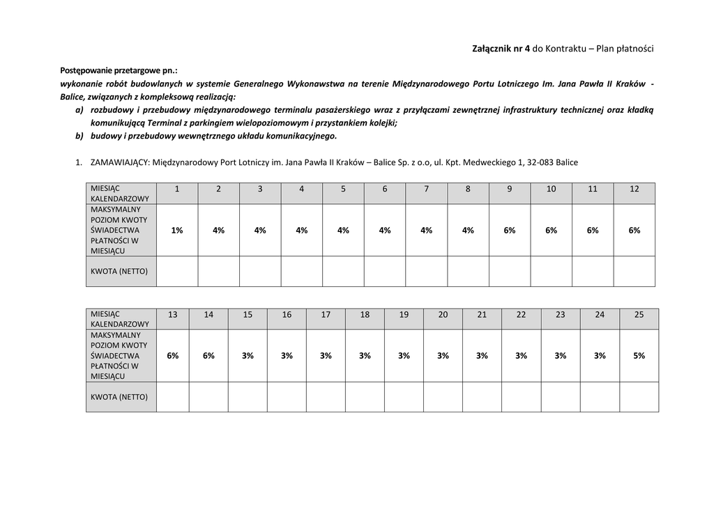 Załącznik nr 4 do Kontraktu – Plan płatności Postępowanie przetargowe pn.: wykonanie robót budowlanych w systemie Generalnego Wykonawstwa na terenie Międzynarodowego Portu Lotniczego Im. Jana Pawła II Kraków Balice, związanych z kompleksową realizacją: a) rozbudowy i przebudowy międzynarodowego terminalu pasażerskiego wraz z przyłączami zewnętrznej infrastruktury technicznej oraz kładką komunikującą Terminal z parkingiem wielopoziomowym i przystankiem kolejki; b) budowy i przebudowy wewnętrznego układu komunikacyjnego. 1. ZAMAWIAJĄCY: Międzynarodowy Port Lotniczy im. Jana Pawła II Kraków – Balice Sp. z o.o, ul. Kpt. Medweckiego 1, 32-083 Balice MIESIĄC KALENDARZOWY MAKSYMALNY POZIOM KWOTY ŚWIADECTWA PŁATNOŚCI W MIESIĄCU 1 2 3 4 5 6 7 8 9 10 11 12 1% 4% 4% 4% 4% 4% 4% 4% 6% 6% 6% 6% KWOTA (NETTO) MIESIĄC KALENDARZOWY MAKSYMALNY POZIOM KWOTY ŚWIADECTWA PŁATNOŚCI W MIESIĄCU KWOTA (NETTO) 13 14 15 16 17 18 19 20 21 22 23 24 25 6% 6% 3% 3% 3% 3% 3% 3% 3% 3% 3% 3% 5%