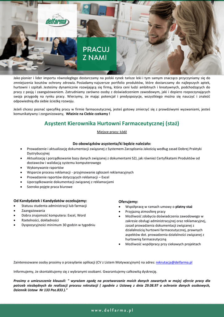 Jako pionier i lider importu równoległego dostarczamy na polski rynek tańsze leki i tym samym znacząco przyczyniamy się do zmniejszenia kosztów ochrony zdrowia. Posiadamy najszersze portfolio produktów, które dostarczamy do najlepszych aptek, hurtowni i szpitali. Jesteśmy dynamicznie rozwijającą się firmą, która ceni ludzi ambitnych i kreatywnych, podchodzących do pracy z pasją i zaangażowaniem. Zatrudniamy zarówno osoby z doświadczeniem zawodowym, jaki i dopiero rozpoczynających swoja przygodę na rynku pracy. Wierzymy, że mając potencjał i predyspozycje, wszystkiego można się nauczyć i znaleźć odpowiednią dla siebie ścieżkę rozwoju. Jeżeli chcesz poznać specyfikę pracy w firmie farmaceutycznej, jesteś gotowy zmierzyć się z prawdziwymi wyzwaniami, jesteś komunikatywny i zorganizowany, Właśnie na Ciebie czekamy ! Asystent Kierownika Hurtowni Farmaceutycznej (staż) Miejsce pracy: Łódź Do obowiązków asystenta/ki będzie należało: Prowadzenie i aktualizację dokumentacji związanej z Systemem Zarządzania Jakością według zasad Dobrej Praktyki Dystrybucyjnej Aktualizację i porządkowanie bazy danych związanej z dokumentami SZJ, jak również Certyfikatami Produktów od dostawców i walidacją systemu komputerowego Wykonywanie raportów Wsparcie procesu reklamacji - przyjmowanie zgłoszeń reklamacyjnych Prowadzenie raportów dotyczących reklamacji – Excel Uporządkowanie dokumentacji związanej z reklamacjami Szeroko pojęte praca biurowe Od Kandydatek i Kandydatów oczekujemy: Statusu studenta administracji lub farmacji Zaangażowania Dobra znajomość komputera: Excel, Word Rzetelności, dokładności Dyspozycyjności minimum 30 godzin w tygodniu Oferujemy: Współpracę w ramach umowy o płatny staż Przyjazną atmosferę pracy Możliwość zdobycia doświadczenia zawodowego w zakresie obsługi administracyjnej oraz reklamacyjnej, zasad prowadzenia dokumentacji związanej z działalnością hurtowni farmaceutycznej, prawnych aspektów dot. prowadzenia działalności związanej z hurtownią farmaceutyczną Możliwość współpracy przy ciekawych projektach Zainteresowane osoby prosimy o przesyłanie aplikacji (CV z Listem Motywacyjnym) na adres: [email protected] Informujemy, że skontaktujemy się z wybranymi osobami. Gwarantujemy całkowitą dyskrecję. Prosimy o umieszczenie klauzuli: " wyrażam zgodę na przetwarzanie moich danych zawartych w mojej ofercie pracy dla potrzeb niezbędnych do realizacji procesu rekrutacji ( zgodnie z Ustawą z dnia 29.08.97 o ochronie danych osobowych, Dziennik Ustaw Nr 133 Poz.833 )."