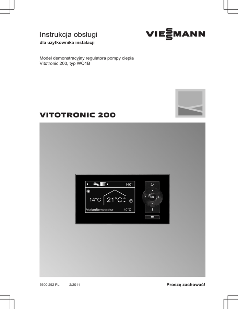 Instrukcja obsługi VIESMANN dla użytkownika instalacji Model demonstracyjny regulatora pompy ciepła Vitotronic 200, typ WO1B VITOTRONIC 200 5600 292 PL 2/2011 Proszę zachować! Wskazówki bezpieczeństwa Dla własnego bezpieczeństwa Prosimy o dokładne przestrzeganie wskazówek bezpieczeństwa w celu wykluczenia ryzyka utraty zdrowia oraz powstania szkód materialnych. Objaśnienia do wskazówek bezpieczeństwa Niebezpieczeństwo Niefachowo przeprowadzone prace przy instalacji mogą doprowadzić do wypadków zagrażających życiu. Prace na podzespołach elektrycznych mogą być wykonywane tylko przez wykwalifikowany personel. Niebezpieczeństwo Ten znak ostrzega przed niebezpieczeństwem zranienia. Uwaga Ten znak ostrzega przed stratami materialnymi i zanieczyszczeniem środowiska. Zachowanie w razie pożaru Wskazówka Tekst oznaczony słowem Wskazówka zawiera dodatkowe informacje. Niebezpieczeństwo W przypadku wystąpienia otwartego ognia istnieje niebezpieczeństwo poparzenia. ■ Wyłączyć urządzenie. ■ Używać tylko atestowanych gaśnic klasy pożarowej ABC. Przeznaczenie Niniejsza instrukcja obsługi skierowana jest do osób obsługujących instalację. Urządzenie nie może być użytkowane przez osoby (włączając dzieci) o ograniczonych zdolnościach zdolnościach rozpoznania zagrożenia, a także przez osoby nie posiadające wystarczającej wiedzy i/lub doświadczenia, chyba że będą one nadzorowane przez osobę odpowiedzialną za ich bezpieczeństwo bądź otrzymają od niej odpowiednie instrukcje dotyczące użytkowania urządzenia. 2 Wymogi dotyczące kotłowni ! Uwaga Nieodpowiednie warunki otoczenia mogą spowodować uszkodzenie instalacji i zagrozić bezpieczeństwu eksploatacji. ■ Zapewnić temperaturę otoczenia między 0ºC a 35ºC. ■ Unikać zanieczyszczenia powietrza przez chlorowcoalkany (znajdujące się np. w farbach, rozpuszczalnikach i środkach czystości). ■ Unikać długotrwałej, wysokiej wilgotności powietrza (np. wskutek częstego suszenia prania). 5600 292 PL ! Wskazówki bezpieczeństwa Dla własnego bezpieczeństwa (ciąg dalszy) Elementy dodatkowe, części zamienne i szybko zużywające się Uwaga Elementy, które nie zostały sprawdzone w połączeniu z instalacją, mogą spowodować jej uszkodzenie lub zakłócić prawidłowe funkcjonowanie. Montażu lub wymiany może dokonywać tylko firma specjalistyczna. 5600 292 PL ! 3 Spis treści Spis treści Informacje wstępne Opis urządzeń...................................................................................................... Podłączanie do zasilania...................................................................................... ■ Podłączanie do gniazda sieciowego................................................................. ■ Podłączanie do komputera lub laptopa............................................................. Regulator jest wstępnie ustawiony....................................................................... 5 5 5 6 6 Informacje dot. obsługi Pierwsze uruchomienie........................................................................................ Obsługa................................................................................................................ ■ Wyświetlanie wersji oprogramowania............................................................... ■ Generowanie zgłoszenia usterki....................................................................... 8 8 9 9 Załącznik Przegląd menu..................................................................................................... 10 5600 292 PL Wykaz haseł........................................................................................................ 12 4 Informacje wstępne Opis urządzeń Model demonstracyjny regulatora pompy ciepła Vitotronic 200, typ WO1B daje możliwość symulacji obsługi wymienionych dalej instalacji grzewczych z pompą ciepła: Pompa ciepła ■ Pompa ciepła solanka/woda, dwustopniowa ■ Zintegrowany moduł komunikacyjny LON ■ 3-drogowy zawór przełączny „Ogrzewani/podgrzew wody użytkowej” Instalacja grzewcza ze schematem instalacji 10 ■ 1 obieg grzewczy bez mieszacza (OG1) ■ 2 obiegi grzewcze z mieszaczem (OG2, OG3) ■ Zewnętrzna wytwornica ciepła do ogrzewania i podgrzewu wody użytkowej (eksploatacja dwusystemowa) ■ Brak przepływowego podgrzewacza wody grzewczej ■ Buforowy podgrzewacz wody grzewczej ■ Pojemnościowy podgrzewacz wody z wbudowanym u góry czujnikiem temperatury i systemem zasilania podgrzewacza ■ Podgrzew wody użytkowej przez kolektory słoneczne, regulator systemów solarnych Vitosolic 100 ■ Pompa cyrkulacyjna wody użytkowej ■ Brak basenu ■ Funkcja chłodzenia „natural cooling” ■ Chłodzenie przez oddzielny obieg chłodzenia, np. klimakonwektor Podłączanie do zasilania Podłączanie do gniazda sieciowego 5600 292 PL ■ Stosować wyłącznie dostarczony zasilacz wtykowy z przyłączem USB oraz przewód łączący USB. ■ Napięcie zasilania 100 do 240 V/50 do 60 Hz 5 Informacje wstępne Podłączanie do zasilania (ciąg dalszy) Podłączanie do komputera lub laptopa ■ Stosować wyłącznie przewód łączący USC. ■ Przyłącze USB musi być przystosowane do poboru prądu o wartości min. 500 mA. Dokumentacja komputera/laptopa Regulator jest wstępnie ustawiony Wskazówka Nazwy obiegów grzewczych zostały dopasowane wyłącznie w języku „niemieckim”. W pozostałych językach stosuje się oznaczenia standardowe: „Obieg grzewczy 1”, „Obieg grzewczy 2”, „Obieg grzewczy 3” lub „Obieg chłodzenia OCH” Stany robocze Podzespoły instalacji Pompa ciepła Sprężarka, pompa ciepła 1. stopień Sprężarka, pompa ciepła 2. stopień Pompa pierwotna, pompa ciepła 1. stopień Pompa pierwotna, pompa ciepła 2. stopień Eksploatacja grzewcza*1 Pompa wtórna, pompa ciepła 1. stopień Pompa wtórna, pompa ciepła 2. stopień Pompa obiegu grzewc