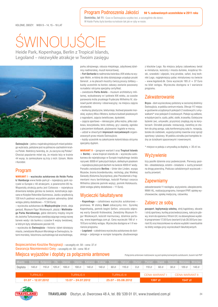 Program Podnoszenia Jakości 98 % zadowolonych uczestników w 2011 roku Dominika, lat 11: Czas w Świnoujściu szybko leci, a szczególnie dla dzieci. W Haide Parku była bomba na kolosie tak jak w ryby w nosie. KOLONIE, OBOZY: WIEK 9 – 14, 15 – 18 LAT ŚWINOUJŚCIE Heide Park, Kopenhaga, Berlin z Tropical Islands, Legoland – niezwykłe atrakcje w Twoim zasięgu Świnoujście – jedno z najatrakcyjniejszych miast polskiego wybrzeża, położone jest na północno-zachodnim krańcu Polski. Niektórzy twierdzą, że „tu zaczyna się Polska”. Chociaż popularnie mówi się, że miasto leży w krainie 44 wysp, to zamieszkane są trzy z nich: Uznam, Wolin i Karsibór. Program WARIANT I – wycieczka autokarowa do Heide Parku k/ Hamburga www.heide-park.pl – największy park rozrywki w Europie z 40 atrakcjami, o powierzchni 85 ha. Wspaniałą atrakcją parku jest Colossos – największa drewniana kolejka górska na świecie, konstrukcja zapisana w Księdze Rekordów Guinnessa. Jazda z prędkością 120 km/h podnosi wszystkim poziom adrenaliny (bilet wstępu płatny dodatkowo – 17,50 Euro); – wycieczka autokarowa do Międzyzdrojów (molo, aleja gwiazd, Muzeum Figur Woskowych, plaża) i Wolińskiego Parku Narodowego, gdzie dotrzemy między innymi do Jeziorka Turkusowego zawdzięczającego swoją nazwę barwie wody i do bunkra z czasów II wojny światowej, w którym były składowane pociski V3; – wycieczka do Świnoujścia – historia i dzień dzisiejszy miasta, zwiedzanie Muzeum Morskiego w Świnoujściu, latarni morskiej, falochronu zachodniego lub wschodniego, parku zdrojowego, ratusza miejskiego, zabytkowej dzielnicy nadmorskiej, muszli koncertowej; – Fort Gerharda to nadmorska twierdza z XIX wieku na wyspie Wolin, w której do dnia dzisiejszego urzęduje pruski Generał , a na placach musztry ćwiczą pruscy żołdacy – każdy uczestnik na koniec zabawy zostanie pasowany na kadeta i otrzyma specjalny certyfikat; – zwiedzanie Fortu Anioła – muzeum architektury militarnej, wybudowany w I połowie XIX wieku, za czasów panowania króla pruskiego Fryderyka Wilhelma IV, stanowił punkt obronny i obserwacyjny; na miejscu zajęcia strzeleckie; – konkursy plastyczne, teleturnieje, festiwal piosenki morskiej, wybory Miss i Mistera, konkurs budowli piaskowych z nagrodami, zajęcia świetlicowe, dyskoteki; – zajęcia sportowo – rekreacyjne: piłka nożna, piłka siatkowa, koszykówka, tenis stołowy, gry i zawody, ognisko z pieczeniem kiełbasek, plażowanie i kąpiele w morzu; – udział w otwartych imprezach rozrywkowych organizowanych przez miasto Świnoujście; – każdy uczestnik na zakończenie kolonii/obozu otrzyma specjalny dyplom. z klocków Lego. Na miejscu jedyny zabawkowy świat w miniaturze, kościoły i miasta duńskie, krajobraz fiński, szwedzki i alpejski, kraj piratów, safari, kraj techniki Lego, najpiękniejszy pałac miniaturowy na świecie – www.legoland.dk. Cena wycieczki 185 zł + 37 Euro na bilet wstępu. Wycieczka dostępna w I wariancie programu. Zakwaterowanie Bryza – dom wycieczkowy położony w zacisznej dzielnicy Świnoujścia, w pobliżu centrum miasta. Oferuje 117 miejsc w gustownie urządzonych pokojach 2 osobowych z umywalkami* oraz pokojach 3 osobowych. Pokoje są zadbane, w każdym jest tv, szafa, półki, stolik, krzesełka. Estetyczne łazienki (wc, umywalki, prysznice) znajdują się na korytarzach. Ośrodek posiada: restaurację, świetlicę ze stołem do ping-ponga, salę konferencyjną salę tv, recepcję, boisko do siatkówki, wypożyczalnię rowerów oraz sprzęt sportowy i plażowy. W pobliżu ośrodka jest kompleks leśny ze ścieżkami spacerowymi i rowerowymi. * miejsce w pokoju z umywalką za dopłatą + 30 zł/ os. WARIANT II – (program wariant I oraz Tropical Islands + Berlin) – www.tropical-islands.de – wycieczka autokarowa do największego w Europie tropikalnego świata rozrywki: 8000 m2 pokrytych białym, delikatnym piaskiem – największa plaża pod dachem na świecie 4000 m2 wody. Ponadto zwiedzanie Berlina – Unter den Linden, wyspa Muzeów, brama brandenburska, reichstag, plac Wielkiej Gwiazdy (Kolumna Zwycięstwa), plac Poczdamski z fragmentami muru berlińskiego, kościół Pamięci cesarza Wilhelma (obecnie pomnik wojny), pomnik Holokaustu. (bilet wstępu płatny dodatkowo – 11 Euro). Wycieczki fakultatywne – Kopenhaga – całodniowa wycieczka autokarowo – promowa. W stolicy Danii zobaczymy min.: Syrenkę Kopenhaską, pomnik bogini Gefion, uroczysta odprawę warty Gwardii Królewskiej. Zwiedzimy Muzeum Figur Woskowych, kościół marmurowy, dzielnice portową. www.kopenhaga.com.pl. Cena wycieczki 190 zł + 10 Euro na bilety wstępu. Wycieczka dostępna w I i II wariancie programu; – Legoland – całodniowa wycieczka autokarowa do duńskiego – jedynego w europie lunaparku zbudowanego Wyżywienie trzy posiłki dziennie oraz podwieczorek. Pierwszy posiłek – obiadokolacja, ostatni – śniadanie + suchy prowiant na drogę powrotną. Podczas całodziennych wycieczek – suchy prowiant. Zapewniamy zakwaterowanie 11 noclegów, wyżywienie, ubezpieczenie, NNW i KL, realizację programu, transport PKP, opiekę wychowawców, opiekę medyczną, ratownika. Zabierz ze sobą paszport, legitymację szkolną, strój kąpielowy, obuwie i strój sportowy, kurtkę przeciwdeszczową, nakrycie głowy, krem do opalania z filtrem UV, na obowiązkowe wydatki programowe 17,50 Euro (wariant I) lub 28,50 Euro (wariant II) oraz kieszonkowe na własne wydatki i ewentualnie na bilety wstępu przy wycieczkach fakultatywnych. Bezpieczeństwo Kosztów Rezygnacji – szczegóły str. 58 – cena: 37 zł Gwarancja Niezmienności Ceny – szczegóły str. 58 – cena: 90 zł Miejsca wyjazdów i dopłaty za połączenia antenowe Miasto Dopłata Białystok Bydgoszcz 140 zł 110 zł Połączenia antenowe realizowane są pod opieką konwojenta autobusem, busem lub PKP Ełk Gdańsk Gdynia Katowice Kraków Koszalin K