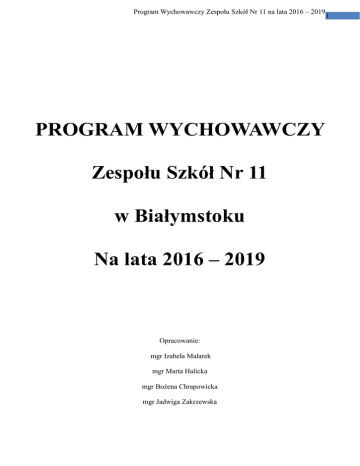 Program Wychowawczy Zespołu Szkół Nr 11 na lata 2016 – 2019 PROGRAM WYCHOWAWCZY Zespołu Szkół Nr 11 w Białymstoku Na lata 2016 – 2019 Opracowanie: mgr Izabela Malarek mgr Marta Halicka mgr Bożena Chrapowicka mgr Jadwiga Zakrzewska 1 Program Wychowawczy Zespołu Szkół Nr 11 na lata 2016 – 2019 2 I. WSTĘP 1. Ogólne założenia wychowawczo-profilaktyczne. Najważniejszym aspektem w życiu dziecka z upośledzeniem umysłowym jest zaspokajanie jego potrzeb fizycznych i psychicznych co stanowi podstawowy warunek jego rozwoju. Ważne miejsce w pracy z dziećmi zajmuje rozwijanie umiejętności komunikowania się, nauka samodzielności, zdobywanie i poszerzanie wiedzy o otaczającym świecie. Wychowanie w szkole ma na celu wszechstronny rozwój osobowy ucznia w wymiarze intelektualnym, psychicznym, społecznym, zdrowotnym, estetycznym, moralnym i duchowym. Praca wychowawcza to zgodne współdziałanie uczniów, nauczycieli, rodziców, pracowników szkoły, które prowadzi do osiągania celów wychowania zawartych w szkolnym programie wychowawczym. Wychowawcy klas oraz zespołów edukacyjno-terapeutycznych, rewalidacyjno-wychowawczych, w szczególności organizują i koordynują działania wobec powierzonych ich opiece uczniów. 2. Podstawy prawne: – Powszechna Deklaracja Praw Człowieka z 10 grudnia 1948 r. – Europejska Konwencja o Ochronie Praw Człowieka i Podstawowych Wolności z 4 listopada 1950r. – Deklaracja Praw Dziecka z 1959 r. – Konwencja o Prawach Dziecka Narodów Zjednoczonych z 20 listopada 1989 r. – Konstytucja Rzeczypospolitej Polskiej z 1997 r. (art. 48, 53, 70) – Ustawa o systemie oświaty z 7.09.1991 r. (art. 1, 5, 33, 34a, 40) – Ustawa z 26.01.1982 r. Karta Nauczyciela (art. 6) – Program Polityki Prorodzinnej Państwa z 17.11.1998 r. – Rozporządzenie MEN z 15.02.1999 r. w sprawie ramowego statutu szkoły publicznej (§2.1,§ 2.2) – Rozporządzenie MEN z 15.02.1999 r. w sprawie podstawy programowej kształcenia ogólnego - Ustawa o wychowaniu w trzeźwości i przeciwdziałaniu alkoholizmowi z dnia 26 października 1982 r. (tekst jednolity - Dz. U. z 2002r. Nr 147, poz.1231; Dz. U. z 2007r. Nr 70, poz. 473). - Ustawa o przeciwdziałaniu narkomanii z dnia 29 lipca 2005 r. (Dz.U. z 2005r. Nr 179, poz. 1485 z późniejszymi zmianami: Dz. U. z 2006r. Nr 7 poz. 47 i 48; Dz. U. z 2006r Nr 66 poz. 469; Nr 120 poz. 826). - Ustawa o postępowaniu w sprawach nieletnich z dnia 26 października 1982 r. (tekst jednolity: Dz.U. z 2002 r. Nr 11, poz. 109 z późniejszymi zmianami) - Ustawa o ochronie zdrowia przed następstwami używania tytoniu i wyrobów tytoniowych z dnia 9 listopada 1995 r. (tekst jednolity: Dz.U. Nr 10. z 1996 r., poz. 55 z późniejszymi zmianami: 1997r. Nr 88, poz. 554 i Nr 121, poz. 770; 1999 r. Nr 96, poz.1107; 2003 r. Nr 229, poz. 2274). - Ustawa o zmianie ustawy o ochronie zdrowia psychicznego z dnia 23 lipca 2008r. (Dz. U. z 2008r. Nr 180 poz. 1108). Ustawie o ochronie zdrowia psychicznego z dnia 19 sierpnia 1994 r. (Dz.U. Nr 111, poz. 535; z późniejszymi zmianami - Dz.U. Nr 113, poz. 731 z 1997 r., Dz.U. Nr 141, poz. 1183 z 2005 r.). - Ustawa o przeciwdziałaniu przemocy w rodzinie z dnia 29 lipca 2005 r. (Dz.U. Nr 180, poz. 1493). -Rozporządzenie Ministra Edukacji Narodowej z dnia 18 sierpnia 2015r. w sprawie zakresu i form prowadzenia w szkołach i placówkach systemu oświaty działalności wychowawczej, edukacyjnej, informacyjnej i profilaktycznej w celu przeciwdziałania narkomanii. – Ramowy Statut szkoły – Podstawa Programowa kształcenia ogólnego, –Podstawa Programowa kształcenia ogólnego dla uczniów z upośledzeniem umysłowym w stopniu Program Wychowawczy Zespołu Szkół Nr 11 na lata 2016 – 2019 3 umiarkowanym lub znacznym w szkołach podstawowych i gimnazjach, –Ramowy Program Wychowawczy Miasta Białegostoku. 3. Opis funkcjonowania szkoły: W skład Zespołu Szkół Nr 11 w Białymstoku wchodzą: Szkoła Podstawowa Nr 17 oraz Publiczne Gimnazjum Nr 21. Kadra pedagogiczna oraz pracownicy szkoły dokładają wszelkich starań aby stworzyć uczniom warunki niezbędne do zapewnienia komfortu psychicznego, poczucia bezpieczeństwa i akceptacji, nawiązania pozytywnego kontaktu emocjonalnego. Każdego roku dokonywana jest wielospecjalistyczna ocena poziomu funkcjonowania ucznia. Na jej podstawie opracowywany jest Indywidualny Program Edukacyjno-Terapeutyczny dla każdego ucznia. W swojej pracy nauczyciele oraz pracownicy szkoły duży nacisk kładą na tworzenie sytuacji wychowawczych u uczniów umożliwiających doświadczanie relacji społecznych, przygotowanie do pełnienia ról społecznych, wzmacnianie pozytywnych przeżyć związanych z pełnionymi rolami. W toku codziennych zajęć tworzone są sytuacje uczenia incydentalnego i wykorzystywane sytuacje życiowe do rozwijania umiejętności komunikacyjnych uczniów, czynności związanych z samoobsługą oraz budzenie chęci pomocy innym. 4. Wizja szkoły: Wizja Szkoły- szkoła nowoczesna, specjalistyczna, bezpieczna, otwarta na potrzeby uczniów. Ma na celu wszechstronny rozwój uczniów od najmłodszych lat ( intelektualny, społeczny, zdrowotny, duchowy) realizowany we współpracy z rodzicami. Szkoła wprowadza nowoczesne metody terapii i aktywizuje uczniów. Indywidualizuje pracę edukacyjną, terapeutyczną i wychowawczą. Wyposaża uczniów w wiedzę i umiejętności potrzebne do dalszej edukacji, przygotowuje do samodzielnego życia. Szkoła współpracuje ze środowiskiem lokalnym realizując swoje zadania i cele. 5. Wzór absolwenta Szkoły Podstawowej Nr 17 w Białymstoku oraz Publicznego Gimnazjum Nr 21 w Białymstoku: Działania wychowawcze nauczycieli i rodziców powinny zmierzać do osiągnięcia przez dziecko pełnej dojrzałości fizycznej, psychicznej, społecznej i duchowej. Uczeń kończący Szkołę Podstawową Nr 17 lub Publiczne Gimnazjum Nr 21 powinien w najwyższym możliwym zakresie uzyskać niezależność od innych os