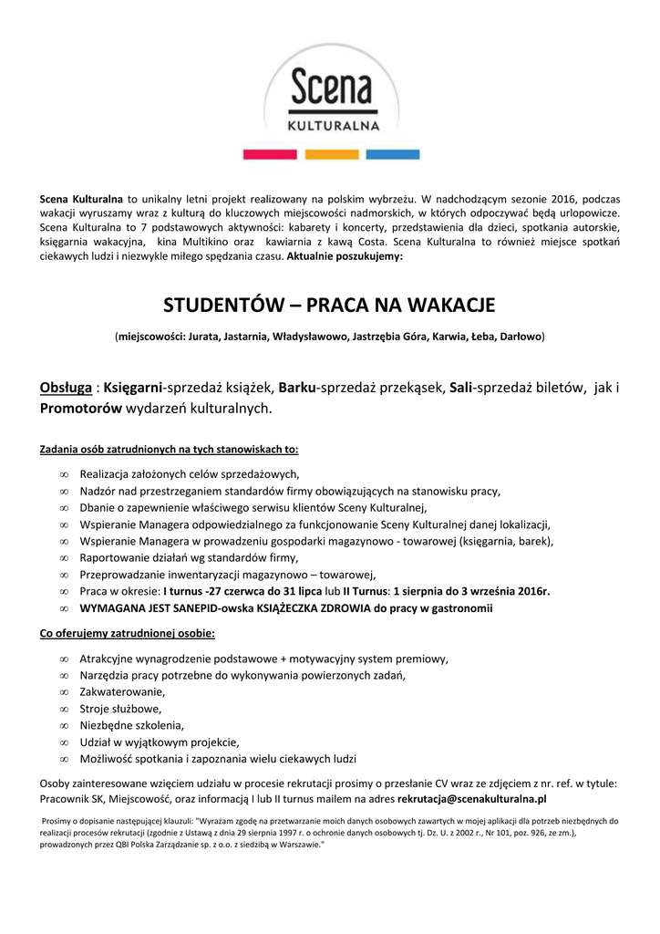 Scena Kulturalna to unikalny letni projekt realizowany na polskim wybrzeżu. W nadchodzącym sezonie 2016, podczas wakacji wyruszamy wraz z kulturą do kluczowych miejscowości nadmorskich, w których odpoczywać będą urlopowicze. Scena Kulturalna to 7 podstawowych aktywności: kabarety i koncerty, przedstawienia dla dzieci, spotkania autorskie, księgarnia wakacyjna, kina Multikino oraz kawiarnia z kawą Costa. Scena Kulturalna to również miejsce spotkań ciekawych ludzi i niezwykle miłego spędzania czasu. Aktualnie poszukujemy: STUDENTÓW – PRACA NA WAKACJE (miejscowości: Jurata, Jastarnia, Władysławowo, Jastrzębia Góra, Karwia, Łeba, Darłowo) Obsługa : Księgarni-sprzedaż książek, Barku-sprzedaż przekąsek, Sali-sprzedaż biletów, jak i Promotorów wydarzeń kulturalnych. Zadania osób zatrudnionych na tych stanowiskach to: • • • • • • • • • Realizacja założonych celów sprzedażowych, Nadzór nad przestrzeganiem standardów firmy obowiązujących na stanowisku pracy, Dbanie o zapewnienie właściwego serwisu klientów Sceny Kulturalnej, Wspieranie Managera odpowiedzialnego za funkcjonowanie Sceny Kulturalnej danej lokalizacji, Wspieranie Managera w prowadzeniu gospodarki magazynowo - towarowej (księgarnia, barek), Raportowanie działań wg standardów firmy, Przeprowadzanie inwentaryzacji magazynowo – towarowej, Praca w okresie: I turnus -27 czerwca do 31 lipca lub II Turnus: 1 sierpnia do 3 września 2016r. WYMAGANA JEST SANEPID-owska KSIĄŻECZKA ZDROWIA do pracy w gastronomii Co oferujemy zatrudnionej osobie: • • • • • • • Atrakcyjne wynagrodzenie podstawowe + motywacyjny system premiowy, Narzędzia pracy potrzebne do wykonywania powierzonych zadań, Zakwaterowanie, Stroje służbowe, Niezbędne szkolenia, Udział w wyjątkowym projekcie, Możliwość spotkania i zapoznania wielu ciekawych ludzi Osoby zainteresowane wzięciem udziału w procesie rekrutacji prosimy o przesłanie CV wraz ze zdjęciem z nr. ref. w tytule: Pracownik SK, Miejscowość, oraz informacją I lub II turnus mailem na adres [email protected] Prosimy o dopisanie następującej klauzuli: "Wyrażam zgodę na przetwarzanie moich danych osobowych zawartych w mojej aplikacji dla potrzeb niezbędnych do realizacji procesów rekrutacji (zgodnie z Ustawą z dnia 29 sierpnia 1997 r. o ochronie danych osobowych tj. Dz. U. z 2002 r., Nr 101, poz. 926, ze zm.), prowadzonych przez QBI Polska Zarządzanie sp. z o.o. z siedzibą w Warszawie."