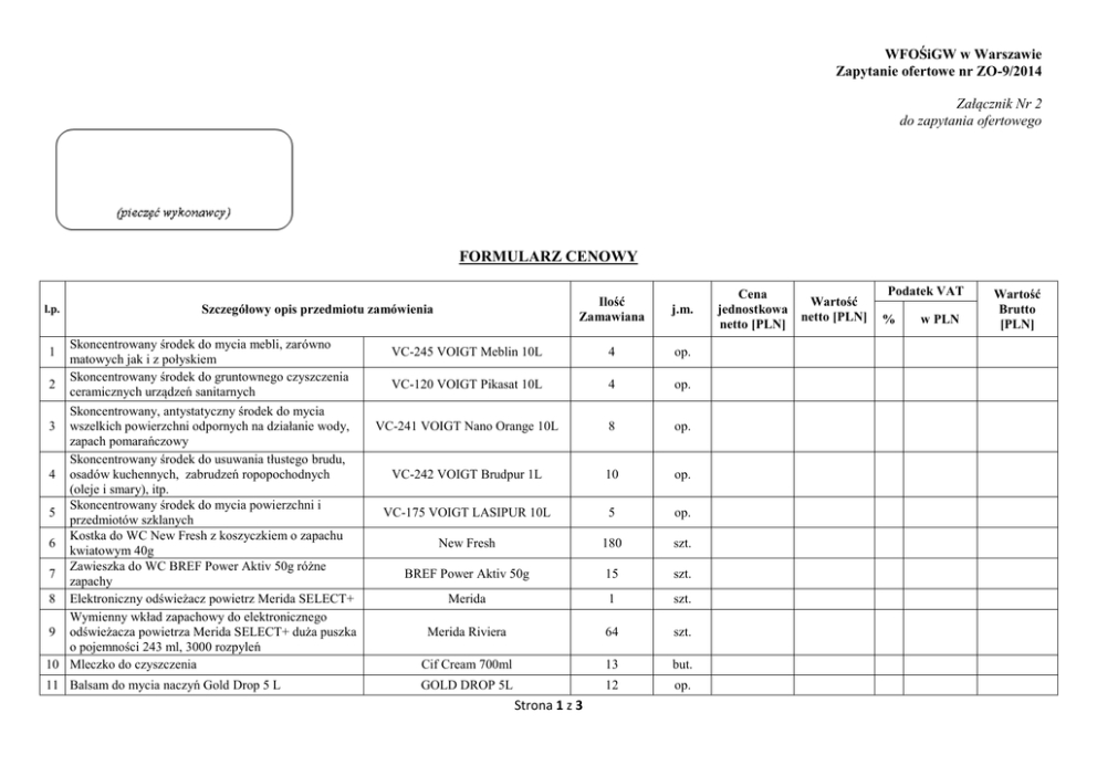 WFOŚiGW w Warszawie Zapytanie ofertowe nr ZO-9/2014 Załącznik Nr 2 do zapytania ofertowego FORMULARZ CENOWY l.p. 1 2 Ilość Zamawiana j.m. VC-245 VOIGT Meblin 10L 4 op. VC-120 VOIGT Pikasat 10L 4 op. VC-241 VOIGT Nano Orange 10L 8 op. VC-242 VOIGT Brudpur 1L 10 op. VC-175 VOIGT LASIPUR 10L 5 op. New Fresh 180 szt. BREF Power Aktiv 50g 15 szt. Merida 1 szt. Merida Riviera 64 szt. Cif Cream 700ml 13 but. GOLD DROP 5L 12 op. Szczegółowy opis przedmiotu zamówienia Skoncentrowany środek do mycia mebli, zarówno matowych jak i z połyskiem Skoncentrowany środek do gruntownego czyszczenia ceramicznych urządzeń sanitarnych Skoncentrowany, antystatyczny środek do mycia wszelkich powierzchni odpornych na działanie wody, zapach pomarańczowy Skoncentrowany środek do usuwania tłustego brudu, 4 osadów kuchennych, zabrudzeń ropopochodnych (oleje i smary), itp. Skoncentrowany środek do mycia powierzchni i 5 przedmiotów szklanych Kostka do WC New Fresh z koszyczkiem o zapachu 6 kwiatowym 40g Zawieszka do WC BREF Power Aktiv 50g różne 7 zapachy 8 Elektroniczny odświeżacz powietrz Merida SELECT+ Wymienny wkład zapachowy do elektronicznego 9 odświeżacza powietrza Merida SELECT+ duża puszka o pojemności 243 ml, 3000 rozpyleń 10 Mleczko do czyszczenia 3 11 Balsam do mycia naczyń Gold Drop 5 L Strona 1 z 3 Cena jednostkowa netto [PLN] Wartość netto [PLN] Podatek VAT % w PLN Wartość Brutto [PLN] WFOŚiGW w Warszawie Zapytanie ofertowe nr ZO-9/2014 Zmywak kuchenny gąbka 6 szt. w opakowaniu o minimalnych wymiarach: 9 x 6,5 x 4 cm. Worek na śmieci LDPE 120L od 20 do 30 sztuk w 13 rolce lub więcej Worek na śmieci LDPE 160L od 10 do 30 sztuk w 14 rolce lub więcej 15 Worek na śmieci 60L 50 sztuk w rolce 12 Zmywak kuchenny gąbka duża Monique 20 op. 100 rolka 100 rolka 80 rolka 16 Worek na śmieci 35L 50 sztuk w rolce 150 rolka 17 Worki do odkurzacza Profi 2 17L 20 szt. inter mop 10 szt. inter mop 15 szt. TTS 2 szt. 15 szt. 2 szt. CLEAN 12 szt. Merida 16 op. Mydło w pianie Merida Bali Plus 64 op. Attis 7 op. BIELINKA 2 op. 5 szt. 18 op. 15 szt. 120 szt. 18 19 20 21 22 23 24 25 26 Mop sznurkowy 350 g do mycia na mokro i wilgotno do wszystkich rodzajów posadzek Mop płaski (kieszeniowy) 40 cm do mycia na mokro i wilgotno do wszystkich rodzajów posadzek Stelaż do mopa oczkowego płaskiego Speedy 40 cm model TTS866/5 Mop płaski (2 oczka) mikrofaza 40 cm pasujący do stelaża model TTS866/5 Kij pasujący do Mopa GOSIA mikrofibra z gąbką szorującą Mop GOSIA mikrofibra z gąbką szorującą Dozownik do mydła w pianie MERIDA TOP z niebieskim okienkiem DF3TN Mydło w pianie, jednorazowy wkład z pompką o pojemności 700 g pasujący do dozowników marki MERIDAD F3TN Mydło w płynie Attis mleko i miód 5 L 27 Wybielacz BIELINKA AS 5 L 28 Mop sznurkowy bawełniany 250/300g 29 Rękawice nitrylowe rozmiar: "L" 100 sztuk w opakowaniu, niejałowe Rękawice nitrylowe rozmiar "L" 100 szt. w op. 30 Ścierka do podłogi (szara) 60x80 cm Ścierka do kurzu uniwersalna wykonana z wiskozy i 31 polipropylenu przybliżone wymiary: 380 mm x 320 mm Strona 2 z 3 WFOŚiGW w Warszawie Zapytanie ofertowe nr ZO-9/2014 Zestaw ściereczek z mikrofibry Jan Niezbędny 5 szt. w opakowaniu o wymiarach 30 x 30 cm. Na zestaw 32 składa się: ściereczka do kuchni i łazienki, szyb i luster, kurzu, naczyń oraz silnych zabrudzeń Jan Niezbędny 35 op. Ręcznik papierowy ZZ WEPA SMART No 276080 kolor: śnieżnobiały wymiary 23 x 23 cm WEPA 96 karton Papier toaletowy jumbo Grasant Cliro 52875: 2 warstwowy, makulaturowy, białość 75%, gofrowany, 34 wymiary rolki: szerokość rolki: 9/10 cm, średnica rolki 18/20 cm, długość 135 m CLIRO 52875 695 rolka 33 RAZEM Strona 3 z 3