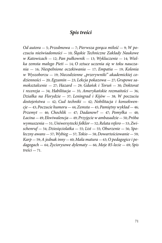 Spis treści Od autora — 5; Przedmowa — 7; Pierwsza gorąca miłość — 9; W poczuciu nieświadomości — 10; Śląskie Techniczne Zakłady Naukowe w Katowicach — 12; Pan pułkownik — 13; Wykluczenie — 14; Wielka zemsta małego Pieti — 14; O sztuce uczenia się w toku nauczania — 16; Niespełnione oczekiwania — 17; Empatia — 19; Kolonia w Wyszoborzu — 19; Niecodzienne „przerywniki” akademickiej codzienności — 20; Egzamin — 23; Lekcja pokazowa — 27; Grupowe samokształcenie — 27; Hazard — 29; Gdańsk i Toruń — 30; Doktorat i recenzja — 34; Habilitacja — 35; Amerykańskie rozmaitości — 36; Działka na Florydzie — 37; Leningrad i Kijów — 38; W poczuciu dostojeństwa — 42; Cud techniki — 42; Nobilitacja i konsekwencje — 43; Poczucie humoru — 44; Zemsta — 45; Pamiętny wykład — 46; Przemyt — 46; Chochlik — 47; Dadanow? — 47; Pomyłka — 48; Łacina — 49; Ekwiwalencja — 49; Przyjęcie w ambasadzie — 50; Próba wymuszenia — 51; Uniwersytecki folklor — 52; Relata refero — 53; Zwischenruf — 54; Dziesięciolatka — 55; List — 55; Oburzenie — 56; Społeczny awans — 57; Wybieg — 57; Tokio — 58; Dowartościowanie — 59; Karp — 59; A jednak inny — 60; Mała matura — 63; O pedagogice i pedagogach — 64; Życiorysowe dylematy — 66; Moje 85-lecie — 69; Spis treści — 71. 71