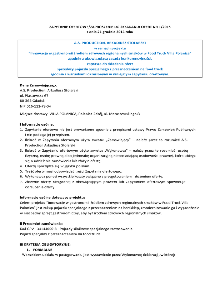 ZAPYTANIE OFERTOWE/ZAPROSZENIE DO SKŁADANIA OFERT NR 1/2015 z dnia 21 grudnia 2015 roku A.S. PRODUCTION, ARKADIUSZ STOLARSKI w ramach projektu “Innowacje w gastronomii źródłem zdrowych regionalnych smaków w Food Truck Villa Polanica” zgodnie z obowiązującą zasadą konkurencyjności, zaprasza do składania ofert sprzedaży pojazdu specjalnego z przeznaczeniem na food truck zgodnie z warunkami określonymi w niniejszym zapytaniu ofertowym. Dane Zamawiającego: A.S. Production, Arkadiusz Stolarski ul. Piastowska 67 80-‐363 Gdańsk NIP 616-‐111-‐79-‐34 Miejsce dostawy: VILLA POLANICA, Polanica-‐Zdrój, ul. Matuszewskiego 8 I Informacje ogólne: 1. Zapytanie ofertowe nie jest prowadzone zgodnie z przepisami ustawy Prawo Zamówień Publicznych i nie podlega jej przepisom. 2. Ilekroć w Zapytaniu ofertowym użyto zwrotu: „Zamawiający” – należy przez to rozumieć A.S. Production Arkadiusz Stolarski 3. Ilekroć w Zapytaniu ofertowym użyto zwrotu: „Wykonawca” – należy przez to rozumieć: osobę fizyczną, osobę prawną albo jednostkę organizacyjną nieposiadającą osobowości prawnej, która ubiega się o udzielenie zamówienia lub złożyła ofertę. 4. Ofertę sporządza się w języku polskim. 5. Treść oferty musi odpowiadać treści Zapytania ofertowego. 6. Wykonawca ponosi wszystkie koszty związane z przygotowaniem i złożeniem oferty. 7. Złożenie oferty niezgodnej z obowiązującym prawem lub Zapytaniem ofertowym spowoduje odrzucenie oferty. Informacje ogólne dotyczące projektu: Celem projektu “Innowacje w gastronomii źródłem zdrowych regionalnych smaków w Food Truck Villa Polanica” jest zakup pojazdu specjalnego z przeznaczeniem na bar/sklep, zmodernizowanie go i wyposażenie w niezbędny sprzęt gastronomiczny, aby był źródłem zdrowych regionalnych smaków. II Przedmiot zamówienia: Kod CPV -‐ 34144000-‐8 -‐ Pojazdy silnikowe specjalnego zastosowania Pojazd specjalny z przeznaczeniem na food truck. III KRYTERIA OBLIGATORYJNE: 1. FORMALNE -‐ Warunkiem udziału w postępowaniu jest wystawienie przez Wykonawcę deklaracji, w której: a) Wykonawca określi pochodzenie pojazdu, b) Wykonawca potwierdzi, że pojazd nie był w okresie poprzednich 7 lat współfinansowany z pomocy UE lub w ramach dotacji z krajowych środków publicznych; -‐ Warunkiem udziału w postępowaniu jest możliwość załączenia dokumentacji fotograficznej i technicznej ze specyfikacją oferowanego pojazdu w celu wykonania przez Zamawiającego oceny funkcjonalności; -‐ Warunkiem udziału w postępowaniu jest możliwość dostarczenia pojazdu do Gdańska, ul. Piastowska 67 do dnia 15 stycznia 2016 roku; -‐ Warunkiem udziału w postępowaniu jest niepowiązanie Wykonawcy z Zamawiającym osobowo ani kapitałowo, w szczególności poprzez: a) uczestnictwo w spółce jako wspólnik spółki cywilnej lub spółki osobowej; b) posiadanie udziałów lub co najmniej 10% akcji; c) pełnienie funkcji członka organu nadzorczego lub zarządzającego, prokurenta, pełnomocnika; d) pozostawanie w związku małżeńskim, w stosunku pokrewieństwa lub powinowactwa w linii prostej, pokrewieństwa lub powinowactwa w linii bocznej do drugiego stopnia lub w stosunku przysposobienia, opieki lub kurateli. -‐ Cena musi zawierać wszystkie niezbędne koszty Wykonawcy. 2. TECHNICZNE Pojazd musi spełniać poniższe parametry: -‐ rodzaj pojazdu: pojazd specjalny -‐ przeznaczenie: sklep/bar -‐ używany, ale nie straszy niż 30 lat, -‐ pojemność silnika 2000-‐2500 cm, -‐ obudowę o wymiarach zewnętrznych przynajmniej: 280cm(długość)x220cm(szerokość)x210cm(wysokość) -‐ liczba miejsc: 2 -‐ inne parametry: podnoszone 1/3 burty obudowy po jednej stronie pojazdu -‐ sprawny, zadbany, posiadający ważne badania techniczne IV Informacje administracyjne: Forma składania ofert: Oferty na formularzu będącym załącznikiem nr 1 do niniejszego zapytania ofertowego wraz z załącznikami można składać osobiście w VILLA POLANICA (Polanica-‐Zdrój, ul. Matuszewskiego 8) lub wysłać skan podpisanego formularza pocztą elektroniczną na adres [email protected] Oferty złożone na innym formularzu, ale zawierające wszystkie wymagane informacje i oświadczenia, nie zostaną odrzucone. V Termin składania ofert: Nieprzekraczalny termin składania ofert upływa 5 stycznia 2016 roku o godzinie 12.00. VI Osobą wyznaczoną do kontaktu jest: Grzegorz Kopij; tel.: +48 784 255 255; e-‐mail: [email protected] VII Kryteria wyboru najkorzystniejszej oferty: najkorzystniejszej oferty 1. Cena łączna netto (podana w PLN) 50 pkt Punkty kryterium będą przyznawane wg następującej formuły: C = (C min/ C r) x 50 pkt Gdzie: C – ilość punktów przyznana ofercie C min – cena minimalna w zbiorze C r – cena oferty rozpatrywanej 2. Funkcjonalność 50 pkt Punkty kryterium będą przyznawane wg następującej formuły: F = (F r / F max) x 50 pkt Gdzie: F – ilość punktów przyznana ofercie F r – funkcjonalność oferty rozpatrywanej F max – funkcjonalność maksymalna w zbiorze Łączna ilość punktów 0-‐100 pkt VIII Informacje dotyczące umowy i realizacji zamówienia: − Na wezwanie Zamawiającego lub innych organów kontrolnych, Wykonawca niezwłocznie zapewni wgląd do wszelkich dokumentów związanych z realizacją niniejszego zapytanie ofertowego; − Zamawiający zastrzega sobie możliwość zmiany warunków umowy zawartej w wyniku przeprowadzonego niniejszego postępowania o udzielenie zamówienia publicznego i jednocześnie daje taką możliwość Wykonawcy, jedynie w zakresie: terminu dostawy (maksymalne wydłużenie tego terminu o 10 dni kalendarzowych); pojemności silnika (do 3000cm); − Zamawiający zastrzega sobie możliwość zmiany warunków postępowania, lub odwołania go bez podania przyczyny i pozostawienia bez rozpatrzenia oferty niezgodnej z wymogami niniejszego zapytania; − Zamawiający nie jest zobowiązany do uzasadnieni