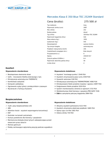 Mercedes Klasa E 350 Blue TEC 252KM Standard Cena (brutto): 275 500 zł Typ nadwozia long Pojemność silnika (ccm) 2987 Moc silnika 252 Rodzaj paliwa diesel Typ silnika 350 Blue TEC 252KM Pojemność bagażnika (litry) 540 Masa własna (kg.) 1955 Ładowność (kg.) 545 Klasa/segment wyższa średnia Typ skrzyni biegów automatyczna Prędkość maksymalna (km/h) 245 Częstotliwość przeglądu (km.) Brak danych Przyspieszenie (s.) 6 Opony 245/45 R17 Zużycie paliwa (l/100km.) 6.4 Pojemność zbiornika paliwa (litry) 59 Liczba drzwi 4 Komfort Wyposażenie standardowe Wyposażenie dodatkowe ✓ Bezstopniowe otwieranie drzwi ✕ Asystent "martwego punktu" 2540 PLN ✓ Isofix - mocowanie fotelika dziecięcego z tyłu ✕ Asystent utrzymywania pasa ruchu 2540 PLN ✓ Klimatyzacja automatyczna THERMATIC ✕ Dywaniki welurowe 536 PLN ✓ Komfortowe wskaźniki ✕ Klimatyzacja automatyczna THERMOTRONIC 4065 PLN ✓ Komputer pokładowy ✕ Klimatyzowane fotele przednie (nawiew i ogrzew.) 6097 PLN ✓ Ogrzewanie szyby tylnej z przełącznikiem czasowym ✕ Podgrzewane fotele przednie 1919 PLN ✓ Wycieraczki z funkcją zmywania ✕ System monitorowania ciśnienia w oponach 1722 PLN ✕ Wielokonturowy fotel kierowcy i pasażera PRE-SAFE 7226 ✕ Zdalne PLN zamykanie pokrywy bagażnika 2964 PLN Bezpieczeństwo Wyposażenie standardowe Wyposażenie dodatkowe ✓ 3-pkt. pasy bezpieczeństwa (x5) ✕ Aktywny asystent parkowania 4121 PLN ✓ ABS ✕ Asystent utrzymania właściwej prędkości 1665 PLN ✓ Attention Assist - asystent wspomagania koncentracji ✕ Opony typu run-flat 1581 PLN ✓ ESP ✕ Osłona silnika 734 PLN ✓ Kontroler na konsoli centralnej\n ✓ Kurtyny powietrzne dla kierowcy i pasażera\n ✓ Mechaniczna blokada drzwi tylnych zabezpieczająca przed otwarciem przez dzieci\n ✓ Montaż gaśnicy\n ✓ Pedały zachowujące optymalną pozycję podczas wypadku\n ✓ 1 PRE-SAFE\n 2 ✓ System wspomagający gwałtowne hamowanie (BAS)\n ✓ Trójkąt ostrzegawczy\n ✓ Tylne światła przeciwmgłowe\n ✓ Układ antypoślizgowy (ASR)\n ✓ Wzmocnienia boczne\n ✓ Zabezpieczenie wnętrza pojazdu\n Dodatki Wyposażenie standardowe Wyposażenie dodatkowe ✓ 3-lamelowa osłona chłodnicy w kolorze szarym ✕ Aktywny asystent utrzymania pasa ruchu 2540 PLN ✓ 4-ramienne, wielofunkcyjne koło kierownicy ✕ Becker Map Pilot 4912 PLN ✓ 5 zagłówków indywidualnie regulowanych ✕ Becker Map Pilot - przygotowanie 1919 PLN ✓ ADAPTIVE BRAKE z funkcją HOLD ✕ COMAND Online 14961 PLN ✓ Alarm antywłamaniowy (EDW) ✕ COMAND Online ze zmieniarką DVD 16654 PLN ✓ Apteczka ✕ Dach szklany 6351 PLN ✓ Asystent świateł przednich ✕ EASY-PACK - system organizowania przestrzeni bagażnika ✓ Audio 20 CD ✕ Górna część deski rozdzielczej obszyta skórą ARTICO 3387 ✓ Automatyczna skrzynia biegów (7) ✕ Hak holowniczy 5024 PLN ✓ Centralny zamek z blokadą od wewnątrz ✕ ILS - Dynamiczne reflektory w technologii LED 8186 PLN ✓ DIRECT CONTROL - podwozie ✕ InCar Hotspot - router Wi-Fi 2823 PLN ✓ DIRECT SELECT Elektroniczna regulacja ✕ Kamera 360° 3952 PLN ✓ display with TFT technology ✕ Kamera cofania 2258 PLN ✓ Dzwignia zmiany begów DIRECT SELECT ✕ KEYLESS-GO 4460 PLN ✓ Dźwignia zmiany biegów w skórze ✕ Ogrzewanie postojowe 7734 PLN ✓ EASY-PACK Rear sill protector ✕ Opony zimowe (zamiast letnich) 1101 PLN ✓ Elektryczne sterowanie szyb (x4) ✕ Pilot radioodtwarzacza lub systemu COMAND 677 PLN ✓ Filtr cząstek stałych ✕ Podgrzewane dysze spryskiwaczy szyby przedniej 960 PLN ✓ Fully electrically adjustable front seats ✕ Podświetlane listwy progowe w przednich drzwiach 3218 PLN ✓ Hamulec postojowy ✕ Podwójny uchwyt na kubek 367 PLN ✓ Immobilizer ✕ Pogrzewane fotele tylne 1919 PLN ✓ Lusterka zewnętrzne podgrzewane i elek. regulowane ✕ Popielniczka 254 PLN ✓ Map pockets ✕ Poprzeczki do mocowania bagażników dachowych 1129 PLN ✓ Mechaniczna regulacja kierownicy w pionie ✕ Przygotowanie do montażu telefonu komórkowego 2202 PLN ✓ Mocowanie ładunku w przestrzeni bagażowej ✕ Radio Audio 20 ze zmieniarką 1694 PLN ✓ Obrotomierz ✕ Składane oparcie tylnej kanapy 2456 PLN ✓ Oświetlenie dolnej przestrzeni wnętrza ✕ SPLITVIEW 5645 PLN ✓ Oświetlenie przy wysiadaniu i św. odblaskowe ✕ Sportowa kierownica z elementami dekoracyjnymi 3331 PLN ✓ Oświetlenie wnętrza Ambiente z regul. natężenia ✕ System automatycznego regulowania świateł drogowych 565 ✓ Ozdobna listwa przyokienna, czarny, z połyskiem ✕ System dźwiękowy Harman/Kardon Logic7 4742 PLN ✓ Pakiet oświetlenia wnętrza pojazdu ✕ System multimedialny z tyłu pojazdu 11009 PLN ✓ Pakiet zabezpieczenia pojazdu ✕ System multimedialny z tyłu pojazdu z ekranem 4742 PLN ✓ Poduksza powietrzna kierowcy i pasażera ✕ System nagłaśniający Bang & Olufsen BeoSound AMG 932 PLN PLN PLN 23429 PLN ✓ Poduszka powietrzna chroniąca kolana ✕ System rozpoznawania fotelika dziecięcego (AKSE) 282 PLN ✓ 3 Podłokietnik ze schowkiem ✕ 4 Wielofunkcyjne podgrzewane koło kierownicy 1468 PLN 5 ✓ Power steering ✕ Worek na narty 1073 PLN ✓ Przyciemniane światła tylne i 3. światło stopu ✕ Zawieszenie o zwiększonym prześwicie 339 PLN ✓ Reflektory bazujące na technologii LED ✕ Zbiornik paliwa o zwiększonej pojemności (80 litrów) 565 ✓ Regulacja położenia reflektorów ✕ Zdalne PLN otwieranie drzwi garażowych 1270 PLN ✓ Schowek w podłokietniku ✕ Zintegrowane foteliki dziecięce (tylna kanapa) 1553 PLN ✓ Sidebag ✕ Złącze multimedialne 1242 PLN ✓ Stalowe listwy progowe\n ✓ Sun visors\n ✓ Światła do czytania w lusterku\n ✓ Sygnał ostrzeg. przy zaciągniętym ham. postojowym\n ✓ System aktywnego serwisowania pojazdu - Assyst\n ✓ System ostrzegający o spadku ciśnienia w oponach\n ✓ Szyby izotermiczne\n ✓ TEMPOMAT z systemem ogran. prędkości SPEEDTRONIC\n ✓ Tirefit\n ✓ Trzecie światło st