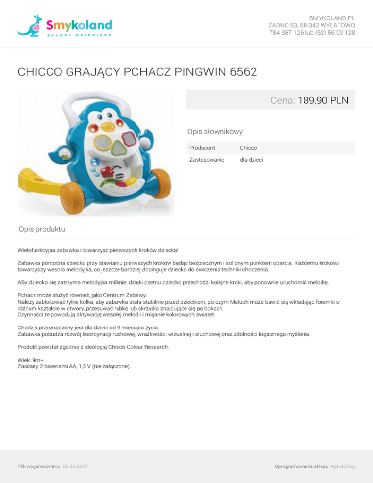 SMYKOLAND.PL ŻABNO 53, 88-342 WYLATOWO 784 387 126 lub (52) 56 99 128 CHICCO GRAJĄCY PCHACZ PINGWIN 6562 Cena: 189,90 PLN Opis słownikowy Producent Chicco Zastosowanie dla dzieci Opis produktu Wielofunkcyjna zabawka i towarzysz pierwszych kroków dziecka! Zabawka pomocna dziecku przy stawianiu pierwszych kroków będąc bezpiecznym i solidnym punktem oparcia. Każdemu krokowi towarzyszy wesoła melodyjka, co jeszcze bardziej dopinguje dziecko do ćwiczenia techniki chodzenia. ABy dziecko się zatrzyma melodyjka milknie, dzięki czemu dziecko przechodzi kolejne kroki, aby ponownie uruchomić melodię. Pchacz może służyć również, jako Centrum Zabawy. Należy zablokować tylne kółka, aby zabawka stała stabilnie przed dzieckiem, po czym Maluch może bawić się wkładając foremki o różnym kształcie w otwory, przesuwać rybkę lub skrzydła znajdujące się po bokach. Czynności te powodują aktywację wesołej melodii i miganie kolorowych świateł. Chodzik przeznaczony jest dla dzieci od 9 miesiąca życia. Zabawka pobudza rozwój koordynacji ruchowej, wrażliwości wizualnej i słuchowej oraz zdolności logicznego myślenia. Produkt powstał zgodnie z ideologią Chicco Colour Research. Wiek: 9m+ Zasilany 2 bateriami AA, 1,5 V (nie załączone). Plik wygenerowano: 08-03-2017 Powered by TCPDF (www.tcpdf.org) Oprogramowanie sklepu: AptusShop