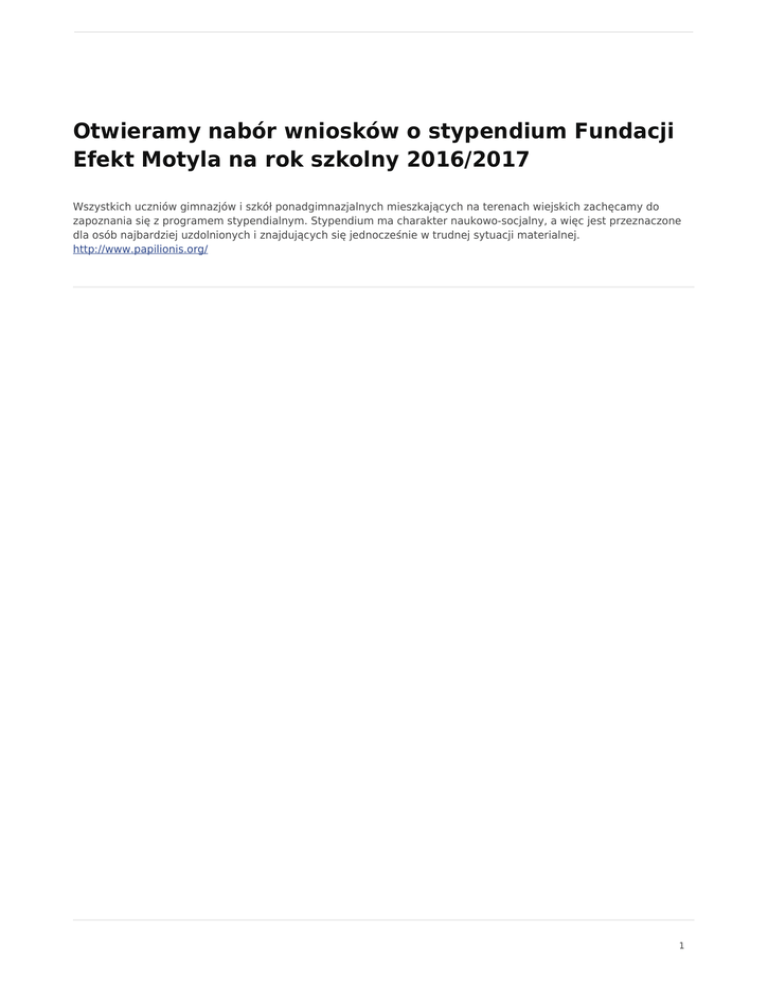 Otwieramy nabór wniosków o stypendium Fundacji Efekt Motyla na rok szkolny 2016/2017 Wszystkich uczniów gimnazjów i szkół ponadgimnazjalnych mieszkających na terenach wiejskich zachęcamy do zapoznania się z programem stypendialnym. Stypendium ma charakter naukowo-socjalny, a więc jest przeznaczone dla osób najbardziej uzdolnionych i znajdujących się jednocześnie w trudnej sytuacji materialnej. http://www.papilionis.org/ 1