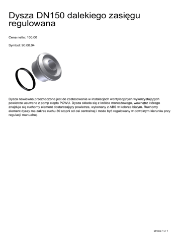 Dysza DN150 dalekiego zasięgu regulowana Cena netto: 100,00 Symbol: 90.00.04 Dysza nawiewna przeznaczona jest do zastosowania w instalacjach wentylacyjnych wykorzystujących powietrze usuwane z pomp ciepła PCWU. Dysza składa się z króćca montażowego, wewnątrz którego znajduje się ruchomy element dostarczający powietrze, wykonany z ABS w kolorze białym. Ruchomy element dyszy ma zakres ruchu 30 stopni od osi centralnej i może być regulowany w dowolnym kierunku przy regulacji manualnej. strona 1 z 1