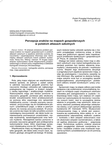 Polski Przegląd Kartograficzny Tom 41, 2009, nr 1, s. 17–27 Wiesława Żyszkowska Zakład Kartografii Uniwersytetu Wrocławskiego [email protected] Percepcja znaków na mapach gospodarczych w polskich atlasach szkolnych Zarys treści. W artykule omówiono problem percepcji znaków na mapach gospodarczych w polskich atlasach szkolnych w aspekcie zdolności uczniów do rozumienia i zapamiętywania informacji oraz różnic między atlasami szkolnymi trzech polskich wydawnictw: Nowa Era, Wiking i Demart. W drugiej części artykułu wykorzystano wyniki eksperymentu przeprowadzonego w ramach pracy magisterskiej w Zakładzie Kartografii Uniwersytu Wrocławskiego. Słowa kluczowe: kartografia szkolna, percepcja map, mapy gospodarcze 1. Wprowadzenie Rola, jaką mapa odgrywa we współczesnym świecie sprawia, że jednym z zadań szkoły w zakresie nauczania geografii powinno być nauczenie młodego człowieka jak najlepszego posługiwania się mapami, w ścisłym związku z nauką logicznego i analitycznego myślenia. Wykorzystanie mapy jest bardzo pomocne w nauczaniu geografii, ponieważ jako skuteczny środek wizualizowania treści przekazywanych za pomocą słów wspomaga ono sprawność intelektualną ucznia i utrwala poznaną rzeczywistość, przyczyniając się do kształtowania jas nych i prawidłowych pojęć, a także w pewnym stopniu do rozwoju poczucia estetyki. W procesie uczenia się mapa nie tylko przybliża uczniom niedostępną rzeczywistość, ale także budzi zainteresowanie poznawanym przedmiotem, rozwija wyobraźnię, spostrzegawczość oraz twórcze myślenie. Niewątpliwie bardzo pomocne w procesie nauczania geografii jest profesjonalne wykorzystanie mapy, które wspomaga sprawność intelektualną ucznia (M. Pulinowa 1996). Współcześnie mapy są integralną częścią nie tylko geografii, ale także wielu innych nauk, np. historii, geologii, etnografii lub biologii. W dzisiej- szym świecie każdy człowiek spotyka się z mapami przeglądając codzienną prasę, w której mapa jest graficznym ujęciem wielu współczesnych problemów społecznych i gospodarczych (P. Pitura, W. Zalewski 2003). Dlatego też dobór zakresu treści map w atlasach szkolnych oraz metod kartograficznej prezentacji powinien być bardzo starannie przemyślany i dostosowany do potrzeb i możliwości ucznia. Stopień tego dostosowania decyduje o pragmatycznym aspekcie sprawności mapy, a więc jej postrzeganiu i rozumieniu zawartej na niej informacji. Aby spełniać te złożone funkcje, mapa szkolna musi być w szczególny sposób podporządkowana psychologicznym podstawom odbioru wrażeń wzrokowych i pracy umysłowej. Sprawność mapy na etapie odbioru jest ściśle związana z jej czytelnością i zrozumiałością, bowiem im mniejsza część umysłowych zdolności człowieka jest zaangażowana w czytanie i interpretację treści mapy, tym większa ich część może być wykorzystana do tworzenia i rozumienia nowych treści. Jest to szczególnie istotne właśnie w przypadku map szkolnych, które powinny stanowić podstawę aktywnego zdobywania wiedzy, a tym samym efektywnego sposobu kształcenia (W. Ostrowski 1974). Skuteczność funkcjonowania mapy w szkole jest uwarunkowana jej czytelnością, która zależy m. in. od zastosowania odpowiedniej wielkości znaków i kontrastu z tłem (stopień widoczności) oraz ich złożoności (stopień rozróżnialności), a także od ogólnej złożoności graficznej i pojęciowej mapy. Konstrukcja systemu znaków powinna zatem uwzględniać zdolność rozróżniania kolorów i kształtów znaków oraz możliwość kojarzenia symboli z przedstawianym za ich pomocą zjawiskiem. 18 Wiesława Żyszkowska Niezależnie od sytuacji i celu w jakim mapy są używane, odbiór mapy jest związany z procesem percepcji, która polega na przetwarzaniu informacji wizualnej, odnoszącej się do trzech podstawowych aspektów przedstawianej rzeczywistości: rozmieszczenia, właściwości oraz struktury zjawisk. Informacje zawarte w znakach mapy mogą być odbierane w różny sposób i na różnym poziomie w zależności od zadania, jakiemu służy wykorzystanie map. W zależności od tego, który z aspektów przestrzennych jest przedmiotem odbioru mapy, można wyróżnić trzy grupy zadań, różniących się szczegółowością uzyskanej informacji i złożonością procesów przetwarzania informacji wzrokowej (J. Bertin 1967, J. Olson 1976). Najprostszym zadaniem jest określenie występowania obiektów na mapie. Zadanie to jest realizowane poprzez identyfikację znaku, a więc spostrzeżenie i odróżnienie go od innych znaków. Wiąże się więc ono z przypisaniem znakom konkretnego znaczenia i określeniem cech obiektów, które są zakodowane w znakach kartograficznych. Kolejne zadanie obejmuje określanie relacji, łączących obiekty na mapie. Oprócz spostrzeżenia następuje tu również identyfikacja różnic między znakami, w tym różnic położenia, wielkości, barwy, kształtu itp. Zdolność do oceny relacji między znakami zależy od stopnia złożoności, a przede wszystkim od liczby znaków na mapie, ich zróżnicowania oraz od odległości między poszczególnymi znakami (W. Żyszkowska 1993). W pierwszym przypadku odbiór mapy dotyczy informacji szczegółowej, o niewielkim stopniu przetworzenia (S. Bonin 1989). Przy identyfikacji jednego znaku lub jednego typu znaków uruchomiona zostaje pamięć sensoryczna (ikoniczna) oraz krótkotrwała, która przechowuje niewielką ilość informacji przez krótki czas, jednak dzięki niskiemu stopniowi przetworzenia identyfikacja przebiega szybko i jest stosunkowo wierna. W zadaniach polegających na określaniu relacji przestrzennych odbiór mapy wymaga identyfikowania większej liczby znaków, o większym zakresie zróżnicowania lub relacji między znakami. W tym przypadku pamięć ikoniczna i krótkotrwała nie wystarczają do objęcia wszystkich pozycji koniecznych do takiej operacji myślowej. Kon