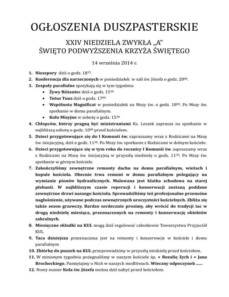 OGŁOSZENIA DUSZPASTERSKIE XXIV NIEDZIELA ZWYKŁA „A” ŚWIĘTO PODWYŻSZENIA KRZYŻA ŚWIĘTEGO 14 września 2014 r. 1. Nieszpory dziś o godz. 1815. 2. Konferencja dla narzeczonych w poniedziałek w sali św. Józefa o godz. 2000. 3. Zespoły parafialne spotykają się w tym tygodniu: Żywy Różaniec dziś o godz. 1530 Totus Tuus dziś o godz. 1700 Wspólnota Magnificat w poniedziałek na Mszy św. o godz. 1800. Po Mszy św. spotkanie w domu parafialnym. Koło Misyjne w sobotę o godz. 1530 4. Chłopców, którzy pragną być ministrantami Ks. Leszek zaprasza na spotkanie w najbliższą sobotę o godz. 1000 przed kościołem. 5. Dzieci przygotowujące się do I Komunii św. zapraszamy wraz z Rodzicami na Mszę św. inicjacyjną, dziś o godz. 1130. Po Mszy św. spotkanie z Rodzicami w dolnym kościele. 6. Dzieci przygotowujące się w tym roku do rocznicy I Komunii św. zapraszamy wraz z Rodzicami na Mszę św. inicjacyjną w przyszłą niedzielę o godz. 11 30. Po Mszy św. spotkanie w górnym kościele. 7. Zakończyliśmy zewnętrzne remonty dachu na domu parafialnym, wieżach i kopule kościoła. Obecnie trwa remont w domu parafialnym polegający na wymianie pionów hydraulicznych. Malowana jest klatka schodowa na starej plebanii. W najbliższym czasie reperacji i konserwacji zostaną poddane zewnętrzne drzwi naszego kościoła. Sprowadziliśmy też profesjonalne przenośne nagłośnienie, używane podczas zewnętrznych uroczystości kościelnych. Zbliża się także sezon grzewczy. Bardzo serdecznie prosimy, aby wrócić do tradycji tac w drugą niedzielę miesiąca, przeznaczonych na remonty i konserwację obiektów sakralnych. 8. Miesięczne składki na KUL mogą dziś regulować członkowie Towarzystwa Przyjaciół KUL 9. Taca dzisiejsza przeznaczona jest na remonty i konserwacje w kościele i domu parafialnym 10. Zbiórkę do puszek na KUL przeprowadzimy w przyszłą niedzielę przed kościołem. 11. W minionym tygodniu pożegnaliśmy w naszym kościele śp. + Rozalię Zych i + Jana Brochockiego. Pamiętajmy o Nich w naszych modlitwach. Wieczny odpoczynek ...... 12. Nowy numer Koła św. Józefa można dziś nabyć przed kościołem.