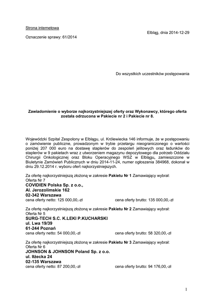 Strona internetowa Elbląg, dnia 2014-12-29 Oznaczenie sprawy: 61/2014 Do wszystkich uczestników postępowania Zawiadomienie o wyborze najkorzystniejszej oferty oraz Wykonawcy, którego oferta została odrzucona w Pakiecie nr 2 i Pakiecie nr 8. Wojewódzki Szpital Zespolony w Elblągu, ul. Królewiecka 146 informuje, że w postępowaniu o zamówienie publiczne, prowadzonym w trybie przetargu nieograniczonego o wartości poniżej 207 000 euro na dostawę staplerów do zespoleń jelitowych oraz ładunków do staplerów w 9 pakietach wraz z utworzeniem magazynu depozytowego dla potrzeb Oddziału Chirurgii Onkologicznej oraz Bloku Operacyjnego WSZ w Elblągu, zamieszczone w Biuletynie Zamówień Publicznych w dniu 2014-11-24, numer ogłoszenia 384968, dokonał w dniu 29.12.2014 r. wyboru ofert najkorzystniejszych. Za ofertę najkorzystniejszą złożoną w zakresie Pakietu Nr 1 Zamawiający wybrał: Oferta Nr 7 COVIDIEN Polska Sp. z o.o., Al. Jerozolimskie 162 02-342 Warszawa cena oferty netto: 125 000,00,-zł cena oferty brutto: 135 000,00,-zł Za ofertę najkorzystniejszą złożoną w zakresie Pakietu Nr 2 Zamawiający wybrał: Oferta Nr 5 SURG-TECH S.C. K.LEKI P.KUCHARSKI ul. Lwa 19/39 61-244 Poznań cena oferty netto: 54 000,00,-zł cena oferty brutto: 58 320,00,-zł Za ofertę najkorzystniejszą złożoną w zakresie Pakietu Nr 3 Zamawiający wybrał: Oferta Nr 6 JOHNSON & JOHNSON Poland Sp. z o.o. ul. Iłżecka 24 02-135 Warszawa cena oferty netto: 87 200,00,-zł cena oferty brutto: 94 176,00,-zł 1 Za ofertę najkorzystniejszą złożoną w zakresie Pakietu Nr 4 Zamawiający wybrał: Oferta Nr 7 COVIDIEN Polska Sp. z o.o. Al. Jerozolimskie 162 02-342 Warszawa cena oferty netto: 128 736,20,-zł cena oferty brutto: 139 035,10, -zł Za ofertę najkorzystniejszą złożoną w zakresie Pakietu Nr 5 Zamawiający wybrał: Oferta Nr 2 SUN- MED Spółka Cywilna ul. Franciszkańska 104/112 91- 845 Łódź cena oferty netto: 36 320,00,-zł cena oferty brutto: 39 225,60,-zł Za ofertę najkorzystniejszą złożoną w zakresie Pakietu Nr 6 Zamawiający wybrał: Oferta Nr 7 COVIDIEN Polska Sp. z o.o. Al. Jerozolimskie 162 02-342 Warszawa cena oferty netto: 47 271,84,-zł cena oferty brutto: 51 053,59,-zł Za ofertę najkorzystniejszą złożoną w zakresie Pakietu Nr 7 Zamawiający wybrał: Oferta Nr 1 Viomedical Sp. z o.o. ul. Mielczarskiego 3 02-798 Warszawa cena oferty netto: 21 540,00, -zł cena oferty brutto: 23 263,20,-zł Za ofertę najkorzystniejszą złożoną w zakresie Pakietu Nr 8 Zamawiający wybrał: Oferta Nr 5 SURG-TECH S.C. K.LEKI P.KUCHARSKI ul. Lwa 19/39 61-244 Poznań cena oferty netto: 36 000,00-zł cena oferty brutto: 38 880,00-zł Za ofertę najkorzystniejszą złożoną w zakresie Pakietu Nr 9 Zamawiający wybrał: Oferta Nr 5 SURG-TECH S.C. K.LEKI P.KUCHARSKI ul. Lwa 19/39 61-244 Poznań cena oferty netto: 55 300,00, -zł cena oferty brutto: 59 724,00,-zł Zamawiający dokonał wyboru ofert z największą liczbą punktów otrzymanych wg kryteriów określonych w SIWZ – cena 100%. 2 Zamawiający działając zgodnie z art. 92 ust.1 pkt.1 Ustawy Prawo zamówień publicznych podaje nazwy (firmy), siedziby i adresy wykonawców, którzy złożyli oferty wraz ze streszczeniem oceny i porównaniem złożonych ofert, wraz z punktacją przyznaną ofertom w kryterium ceny i łączną punktację: W zakresie Pakietu Nr 1: Oferta Nr 7 COVIDIEN Polska Sp. z o.o., Al. Jerozolimskie 162, 02-342 Warszawa Cena 100 pkt. x 3 =300 pkt. x 100% = 300 pkt. W zakresie Pakietu Nr 2: Oferta Nr 5 SURG-TECH S.C. K.LEKI P.KUCHARSKI, ul. Lwa 19/39, 61-244 Poznań Cena 100 pkt. x 3 =300 pkt. x 100% = 300 pkt. Oferta Nr 1 Viomedical Sp. z o.o., ul. Mielczarskiego 3, 02-798 Warszawa Oferta niepodlegająca ocenie W zakresie Pakietu Nr 3: Oferta Nr 6 JOHNSON & JOHNSON Poland Sp. z o.o., ul. Iłżecka 24, 02-135 Warszawa Cena 100 pkt. x 3 =300 pkt. x 100% = 300 pkt. W zakresie Pakietu Nr 4 Oferta Nr 7 COVIDIEN Polska Sp. z o.o., Al. Jerozolimskie 162, 02-342 Warszawa Cena 100 pkt. x 3 =300 pkt. x 100% = 300 pkt. W zakresie Pakietu Nr 5 Oferta Nr 1 Viomedical Sp. z o.o., ul. Mielczarskiego 3, 02-798 Warszawa Cena 49,49 pkt. x 3 = 149,82 pkt. x 100% = 149,82 pkt. Oferta Nr 2 SUN- MED Spółka Cywilna, ul. Franciszkańska 104/112, 91- 845 Łódź Cena 100 pkt. x 3 = 300 pkt. x 100% = 300 pkt. Oferta Nr 3 Meditrade Poland Sp. z o.o., ul.Okopowa 56 kl. A, 01- 042 Warszawa Cena 72,06 pkt. x 3 = 216,18 pkt. x 100% = 216,18 pkt. Oferta Nr 4 EFmed Sp. z o.o., ul. Marynarki Polskiej 100, 80-557 Gdańsk Cena 77,73 pkt. x 3 = 233,19 pkt. x 100% = 233,19 pkt. Oferta Nr 5 SURG-TECH S.C. K.LEKI P.KUCHARSKI, ul. Lwa 19/39, 61-244 Poznań Cena 73,16 pkt. x 3 = 219,50 pkt. x 100% = 219,50 pkt. 3 Oferta Nr 6 JOHNSON & JOHNSON Poland Sp. z o.o., ul. Iłżecka 24, 02-135 Warszawa Cena 67,01pkt. x 3 = 201,03 pkt. x 100% = 201,03 pkt. Oferta Nr 7 COVIDIEN Polska Sp. z o.o., Al. Jerozolimskie 162, 02-342 Warszawa Cena 60,53 pkt. x 3 = 181,59 pkt. x 100% = 181,59 pkt. W zakresie Pakietu Nr 6 Oferta Nr 7 COVIDIEN Polska Sp. z o.o., Al. Jerozolimskie 162, 02-342 Warszawa Cena 100 pkt. x 3 = 300 pkt. x 100% = 300 pkt. W zakresie Pakietu Nr 7 Oferta Nr 1 Viomedical Sp. z o.o., ul. Mielczarskiego 3, 02-798 Warszawa Cena 100 pkt. x 3 = 300 pkt. x 100% = 300 pkt. Oferta Nr 2 SUN- MED Spółka Cywilna, ul. Franciszkańska 104/112, 91- 845 Łódź Cena 92,52 pkt. x 3 = 277,56 pkt. x 100% = 277,56pkt. Oferta Nr 4 EFmed Sp. z o.o., ul. Marynarki Polskiej 100, 80-557 Gdańsk Cena 46,33 pkt. x 3 = 138,99 pkt. x 100% = 138,99 pkt. Oferta Nr 5 SURG-TECH S.C. K.LEKI P.KUCHARSKI, ul. Lwa 19/39, 61-244 Poznań Cena 40,33 pkt. x 3 = 120,99 pkt. x 100% = 120,99 pkt. Oferta Nr 6 JOHNSON & JOHNSON Poland Sp. z o.o., ul. Iłżecka 24, 02-135 Warszawa Cena 29,91pkt. x 3 = 89,73 pkt. x 100% = 89,73 pkt. Oferta Nr 7 COVIDIEN Polska Sp. z o.o., Al. Jerozolimskie 162, 02-342 Warszawa Cena 51,28 pkt. x 3 = 153,84 pkt. x 100% = 153,84 pkt. W zakresie Pakietu Nr