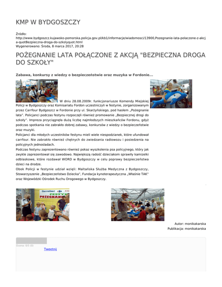 KMP W BYDGOSZCZY Źródło: http://www.bydgoszcz.kujawsko-pomorska.policja.gov.pl/kb1/informacje/wiadomosci/13900,Pozegnanie-lata-polaczone-z-akcj a-quotBezpieczna-droga-do-szkolyquot.html Wygenerowano: Środa, 8 marca 2017, 20:28 POŻEGNANIE LATA POŁĄCZONE Z AKCJĄ "BEZPIECZNA DROGA DO SZKOŁY" Zabawa, konkursy z wiedzy o bezpieczeństwie oraz muzyka w Fordonie... W dniu 28.08.2009r. funkcjonariusze Komendy Miejskiej Policji w Bydgoszczy oraz Komisariatu Fordon uczestniczyli w festynie, zorganizowanym przez Carrfour Bydgoszcz w Fordonie przy ul. Skarżyńskiego, pod hasłem „Pożegnanie lata”. Policjanci podczas festynu rozpoczęli również promowanie „Bezpiecznej drogi do szkoły”. Impreza przyciągnęła dużą liczbę najmłodszych mieszkańców Fordonu, gdyż podczas spotkania nie zabrakło dobrej zabawy, konkursów z wiedzy o bezpieczeństwie oraz muzyki. Policjanci dla młodych uczestników festynu mieli wiele niespodzianek, które ufundował carrfour. Nie zabrakło również chętnych do zwiedzania radiowozu i posiedzenia na policyjnych jednosladach. Podczas festynu zaprezentowano również pokaz wyszkolenia psa policyjnego, który jak zwykle zaprezentował się zawodowo. Największą radość dzieciakom sprawiły kamizelki odblaskowe, które rozdawał WORD w Bydgoszczy w celu poprawy bezpieczeństwa dzieci na drodze. Obok Policji w festynie udział wzięli: Maltańska Służba Medyczna z Bydgoszczy, Stowarzyszenie „Bezpieczeństwo Dziecka”, Fundacja kynoterapeutyczna „Właśnie TAK” oraz Wojewódzki Ośrodek Ruchu Drogowego w Bydgoszczy. Autor: monikakarska Publikacja: monikakarska Ocena: 0/5 (0) Tweetnij
