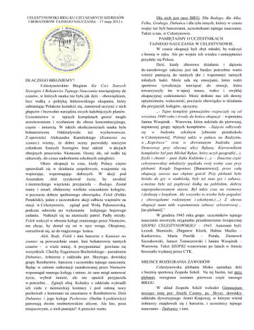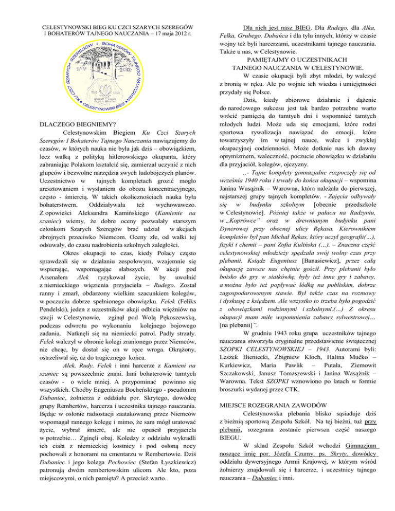 CELESTYNOWSKI BIEG KU CZCI SZARYCH SZEREGÓW I BOHATERÓW TAJNEGO NAUCZANIA – 17 maja 2012 r. DLACZEGO BIEGNIEMY? Celestynowskim Biegiem Ku Czci Szarych Szeregów I Bohaterów Tajnego Nauczania nawiązujemy do czasów, w których nauka nie była jak dziś – obowiązkiem, lecz walką z polityką hitlerowskiego okupanta, który zabraniając Polakom kształcić się, zamierzał uczynić z nich głupców i bezwolne narzędzia swych ludobójczych planów. Uczestnictwo w tajnych kompletach grozić mogło aresztowaniem i wysłaniem do obozu koncentracyjnego, często - śmiercią. W takich okolicznościach nauka była bohaterstwem. Oddziaływała też wychowawczo. Z opowieści Aleksandra Kamińskiego (Kamienie na szaniec) wiemy, że dobre oceny pozwalały starszym członkom Szarych Szeregów brać udział w akcjach zbrojnych przeciwko Niemcom. Oceny złe, od walki tej odsuwały, do czasu nadrobienia szkolnych zaległości. Okres okupacji to czas, kiedy Polacy często sprawdzali się w działaniu zespołowym, wzajemnie się wspierając, wspomagając słabszych. W akcji pod Arsenałem Alek ryzykował życie, by uwolnić z niemieckiego więzienia przyjaciela – Rudego. Został ranny i zmarł, obdarzony wielkim szacunkiem kolegów, w poczuciu dobrze spełnionego obowiązku. Felek (Feliks Pendelski), jeden z uczestników akcji odbicia więźniów na stacji w Celestynowie, zginął pod Wolą Pękoszewską, podczas odwrotu po wykonaniu kolejnego bojowego zadania. Natknęli się na niemiecki patrol. Padły strzały. Felek walczył w obronie kolegi zranionego przez Niemców, nie chcąc, by dostał się on w ręce wroga. Okrążony, ostrzeliwał się, aż do tragicznego końca. Alek, Rudy, Felek i inni harcerze z Kamieni na szaniec są powszechnie znani. Inni bohaterowie tamtych czasów - o wiele mniej. A przypominać powinno się wszystkich. Choćby Eugeniusza Bocheńskiego - pseudonim Dubaniec, żołnierza z oddziału por. Skrytego, dowódcę grupy Rembertów, harcerza i uczestnika tajnego nauczania. Będąc w osłonie radiostacji zaatakowanej przez Niemców wspomagał rannego kolegę i mimo, że sam mógł uratować życie, wybrał śmierć, ale nie opuścił przyjaciela w potrzebie… Zginęli obaj. Koledzy z oddziału wykradli ich ciała z niemieckiej kostnicy i pod osłoną nocy pochowali z honorami na cmentarzu w Rembertowie. Dziś Dubaniec i jego kolega Pechowiec (Stefan Łyszkiewicz) patronują dwóm rembertowskim ulicom. Ale kto, poza miejscowymi, o nich pamięta? A przecież warto. Dla nich jest nasz BIEG. Dla Rudego, dla Alka, Felka, Grubego, Dubańca i dla tylu innych, którzy w czasie wojny też byli harcerzami, uczestnikami tajnego nauczania. Także u nas, w Celestynowie. PAMIĘTAJMY O UCZESTNIKACH TAJNEGO NAUCZANIA W CELESTYNOWIE. W czasie okupacji byli zbyt młodzi, by walczyć z bronią w ręku. Ale po wojnie ich wiedza i umiejętności przydały się Polsce. Dziś, kiedy zbiorowe działanie i dążenie do narodowego sukcesu jest tak bardzo potrzebne warto wrócić pamięcią do tamtych dni i wspomnieć tamtych młodych ludzi. Może uda się emocjami, które rodzi sportowa rywalizacja nawiązać do emocji, które towarzyszyły im w tajnej nauce, walce i zwykłej okupacyjnej codzienności. Może dotknie nas ich dawny optymizmem, waleczność, poczucie obowiązku w działaniu dla przyjaciół, kolegów, ojczyzny. „- Tajne komplety gimnazjalne rozpoczęły się od września 1940 roku i trwały do końca okupacji – wspomina Janina Wasążnik – Warowna, która należała do pierwszej, najstarszej grupy tajnych kompletów. - Zajęcia odbywały się w budynku szkolnym [obecnie przedszkole w Celestynowie]. Później także w pałacu na Radzyniu, w „Koprówce” oraz w drewnianym budynku pani Dynerowej przy obecnej ulicy Rękasa. Kierownikiem kompletów był pan Michał Rękas, który uczył geografii(…), fizyki i chemii – pani Zofia Kulińska (…). – Znaczna część celestynowskiej młodzieży spędzała swój wolny czas przy plebanii. Ksiądz Eugeniusz [Banasiewicz], przez całą okupację zawsze nas chętnie gościł. Przy plebanii było boisko do gry w siatkówkę, były też inne gry i zabawy, a można było też popływać łódką na pobliskim, dobrze zagospodarowanym stawie. Był także czas na rozmowy i dyskusję z księdzem. Ale wszystko to trzeba było pogodzić z obowiązkami rodzinnymi i szkolnymi.(…) Z okresu okupacji mam miłe wspomnienia zabawy sylwestrowej… [na plebanii]”. W grudniu 1943 roku grupa uczestników tajnego nauczania stworzyła oryginalne przedstawienie świątecznej SZOPKI CELESTYNOWSKIEJ – 1943. Autorami byli: Leszek Bieniecki, Zbigniew Kloch, Halina Mućko – Kurkiewicz, Maria Pawlik – Putała, Ziemowit Szczakowski, Janusz Tomaszewski i Janina Wasążnik – Warowna. Tekst SZOPKI wznowiono po latach w formie broszurki wydanej przez CTK. MIEJSCE ROZEGRANIA ZAWODÓW Celestynowska plebania blisko sąsiaduje dziś z bieżnią sportową Zespołu Szkół. Na tej bieżni, tuż przy plebanii, rozegrana zostanie pierwsza część naszego BIEGU. W skład Zespołu Szkół wchodzi Gimnazjum noszące imię por. Józefa Czumy, ps. Skryty, dowódcy oddziału dywersyjnego Armii Krajowej, w którym wśród żołnierzy znajdowali się i harcerze, i uczestnicy tajnego nauczania – Dubaniec i inni. TRASA HISTORYCZNA – ULICAMI CELESTYNOWA Druga część BIEGU powiedzie chodnikami celestynowskich ulic, prowadząc do miejsc, które były bezpośrednimi świadkami lub w inny sposób upamiętniają tutejsze tajne nauczanie: ulicą Św. Kazimierza, obok miejsca gdzie stała Koprówka, do skrzyżowania z ulicą Michała Rękasa, dalej ulicą Regucką do jej skrzyżowania z ulicą Wrzosową, gdzie jest Szkoła Podstawowa im. Batalionu ZOŚKA, a w niej w szczególny sposób upamiętnia się harcerzy Grup Szturmowych Szarych Szeregów, spośród których wielu brało udział w akcji uwolnienia hitlerowskich więźniów na stacji w Celestynowie (Zośka, Felek),