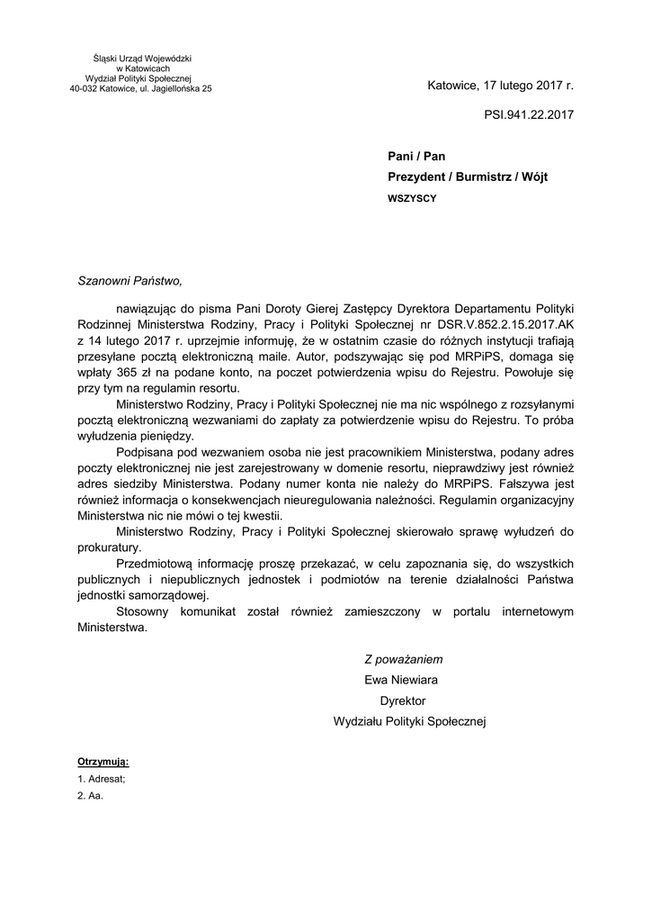 Śląski Urząd Wojewódzki w Katowicach Wydział Polityki Społecznej 40-032 Katowice, ul. Jagiellońska 25 Katowice, 17 lutego 2017 r. PSI.941.22.2017 Pani / Pan Prezydent / Burmistrz / Wójt WSZYSCY Szanowni Państwo, nawiązując do pisma Pani Doroty Gierej Zastępcy Dyrektora Departamentu Polityki Rodzinnej Ministerstwa Rodziny, Pracy i Polityki Społecznej nr DSR.V.852.2.15.2017.AK z 14 lutego 2017 r. uprzejmie informuję, że w ostatnim czasie do różnych instytucji trafiają przesyłane pocztą elektroniczną maile. Autor, podszywając się pod MRPiPS, domaga się wpłaty 365 zł na podane konto, na poczet potwierdzenia wpisu do Rejestru. Powołuje się przy tym na regulamin resortu. Ministerstwo Rodziny, Pracy i Polityki Społecznej nie ma nic wspólnego z rozsyłanymi pocztą elektroniczną wezwaniami do zapłaty za potwierdzenie wpisu do Rejestru. To próba wyłudzenia pieniędzy. Podpisana pod wezwaniem osoba nie jest pracownikiem Ministerstwa, podany adres poczty elektronicznej nie jest zarejestrowany w domenie resortu, nieprawdziwy jest również adres siedziby Ministerstwa. Podany numer konta nie należy do MRPiPS. Fałszywa jest również informacja o konsekwencjach nieuregulowania należności. Regulamin organizacyjny Ministerstwa nic nie mówi o tej kwestii. Ministerstwo Rodziny, Pracy i Polityki Społecznej skierowało sprawę wyłudzeń do prokuratury. Przedmiotową informację proszę przekazać, w celu zapoznania się, do wszystkich publicznych i niepublicznych jednostek i podmiotów na terenie działalności Państwa jednostki samorządowej. Stosowny komunikat został również zamieszczony w portalu internetowym Ministerstwa. Z poważaniem Ewa Niewiara Dyrektor Wydziału Polityki Społecznej Otrzymują: 1. Adresat; 2. Aa.