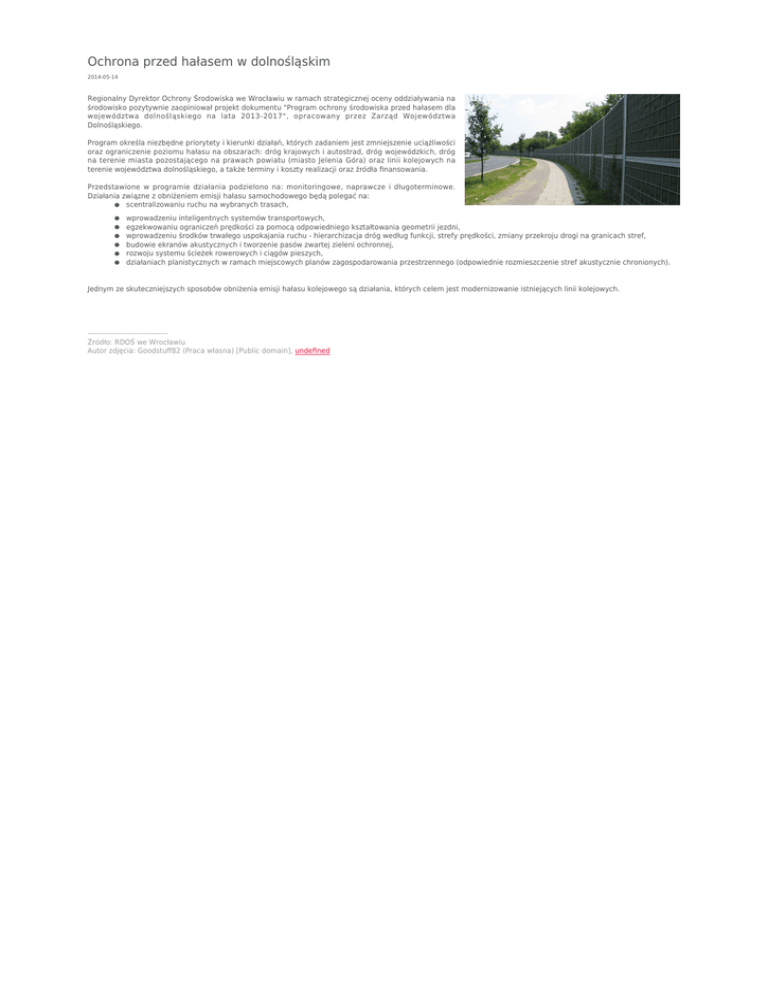 Ochrona przed hałasem w dolnośląskim 2014-05-14 Regionalny Dyrektor Ochrony Środowiska we Wrocławiu w ramach strategicznej oceny oddziaływania na środowisko pozytywnie zaopiniował projekt dokumentu "Program ochrony środowiska przed hałasem dla województwa dolnośląskiego na lata 2013-2017", opracowany przez Zarząd Województwa Dolnośląskiego. Program określa niezbędne priorytety i kierunki działań, których zadaniem jest zmniejszenie uciążliwości oraz ograniczenie poziomu hałasu na obszarach: dróg krajowych i autostrad, dróg wojewódzkich, dróg na terenie miasta pozostającego na prawach powiatu (miasto Jelenia Góra) oraz linii kolejowych na terenie województwa dolnośląskiego, a także terminy i koszty realizacji oraz źródła finansowania. Przedstawione w programie działania podzielono na: monitoringowe, naprawcze i długoterminowe. Działania związne z obniżeniem emisji hałasu samochodowego będą polegać na: scentralizowaniu ruchu na wybranych trasach, wprowadzeniu inteligentnych systemów transportowych, egzekwowaniu ograniczeń prędkości za pomocą odpowiedniego kształtowania geometrii jezdni, wprowadzeniu środków trwałego uspokajania ruchu - hierarchizacja dróg według funkcji, strefy prędkości, zmiany przekroju drogi na granicach stref, budowie ekranów akustycznych i tworzenie pasów zwartej zieleni ochronnej, rozwoju systemu ścieżek rowerowych i ciągów pieszych, działaniach planistycznych w ramach miejscowych planów zagospodarowania przestrzennego (odpowiednie rozmieszczenie stref akustycznie chronionych). Jednym ze skuteczniejszych sposobów obniżenia emisji hałasu kolejowego są działania, których celem jest modernizowanie istniejących linii kolejowych. -------------------------------Źródło: RDOŚ we Wrocławiu Autor zdjęcia: Goodstuff82 (Praca własna) [Public domain], undefined
