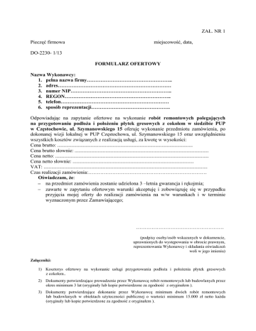ZAŁ. NR 1 Pieczęć firmowa miejscowość, data, DO-2230- 1/13 FORMULARZ OFERTOWY Nazwa Wykonawcy: 1. pełna nazwa firmy………………………………………….. 2. adres………………………………………………………… 3. numer NIP………………………………………………….. 4. REGON…………………………………………………….. 5. telefon……………………………………………………… 6. sposób reprezentacji………………………………………. Odpowiadając na zapytanie ofertowe na wykonanie robót remontowych polegających na przygotowaniu podłoża i położeniu płytek gresowych z cokołem w siedzibie PUP w Częstochowie, ul. Szymanowskiego 15 oferuję wykonanie przedmiotu zamówienia, po dokonanej wizji lokalnej w PUP Częstochowa, ul. Szymanowskiego 15 oraz uwzględnieniu wszystkich kosztów związanych z realizacją usługi, za kwotę w wysokości: Cena brutto: ......................................................................................................... Cena brutto słownie: ........................................................................................................ Cena netto: ....................................................................................................................... Cena netto słownie: .............................................................................................. VAT: ............................................................................................................................... Czas realizacji zamówienia:…………………………………………………………… Oświadczam, że: na przedmiot zamówienia zostanie udzielona 3 –letnia gwarancja i rękojmia; zawarte w zapytaniu ofertowym warunki akceptuję i zobowiązuję się w przypadku przyjęcia mojej oferty do realizacji zamówienia na w/w warunkach i w terminie wyznaczonym przez Zamawiającego; …………………………………………… (podpisy osoby/osób wskazanych w dokumencie, uprawnionych do występowania w obrocie prawnym, reprezentowania Wykonawcy i składania oświadczeń woli w jego imieniu) Załączniki: 1) Kosztorys ofertowy na wykonanie usługi przygotowania podłoża i położenia płytek gresowych z cokołem.. 2) Dokumenty potwierdzające prowadzenie przez Wykonawcę robót remontowych lub budowlanych przez okres minimum 3 lat (oryginały lub kopie potwierdzone za zgodność z oryginałem ). 3) Dokumenty potwierdzające dokonanie przez Wykonawcę minimum dwóch robót remontowych lub budowlanych w obiektach użyteczności publicznej o wartości minimum 15.000 zł netto każda (oryginały lub kopie potwierdzone za zgodność z oryginałem ).