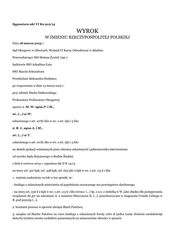 Sygnatura akt VI Ka 910/14 WYROK W IMIENIU RZECZYPOSPOLITEJ POLSKIEJ Dnia 18 marca 2015 r. Sąd Okręgowy w Gliwicach, Wydział VI Karny Odwoławczy w składzie: Przewodniczący SSO Bożena Żywioł. (spr.) Sędziowie SSO Arkadiusz Łata SSO Marcin Schoenborn Protokolant Aleksandra Studniarz po rozpoznaniu w dniu 13 marca 2015 r. przy udziale Marka Dutkowskiego Prokuratora Prokuratury Okręgowej sprawy 1. M. W. syna P. i M., ur. (...) w W. oskarżonego z art. 107§1 kks w zw. z art. 9§2 i 3 kks 2. R. L. syna A. i M., ur. (...) w T. oskarżonego z art. 107§1 kks w zw. z art. 9§2 i 3 kks na skutek apelacji wniesionych przez obrońcę oskarżonych i pełnomocnika interwenienta od wyroku Sądu Rejonowego w Rudzie Śląskiej z dnia 6 czerwca 2014 r. sygnatura akt II K 14/13 na mocy art. 437 kpk, art. 438 kpk, art. 632 pkt 2 kpk w zw. z art. 113 § 1 kks 1. zmienia zaskarżony wyrok w ten sposób, że: - każdego z oskarżonych uniewinnia od popełnienia zarzucanego mu przestępstwa skarbowego, - na mocy art. 230 § 2 kpk w zw. z art. 113 § 1 kks zwraca (...) Sp. z o.o. z siedzibą w W. jako zbędne dla postępowania urządzenie do gry na automacie A. o numerze fabrycznym H. (...), przechowywane w magazynie Urzędu Celnego w R. pod pozycją (...); 2. kosztami procesu w sprawie obciąża Skarb Państwa; 3. zasądza od Skarbu Państwa na rzecz każdego z oskarżonych kwotę 1260 zł (jeden tysiąc dwieście sześćdziesiąt złotych) tytułem zwrotu wydatków poniesionych na ustanowienie obrońcy w sprawie VI Ka 910/14 UZASADNIENIE Sąd Okręgowy uznał, że obie apelacje wywiedzione przez: obrońcę oskarżonych M. W. i R. L. oraz pełnomocnika interwenienta (...) sp. z o. o. od wyroku Sądu Rejonowego w Rudzie Śląskiej z dnia 6 czerwca 2014r. sygn.akt II K 14/13 są zasadne. Podzielenie podniesionych w środkach odwoławczych zarzutów: 1.obrazy prawa materialnego, a to art. 107 § 1 kks w zw. z art. 9 § 3 kks w zw. z art. 6 ust. 1 i 4 ustawy z 19.11.2009r. o grach hazardowych - przez wydanie wyroku skazującego oskarżonych za przestępstwa skarbowe z art. 107 § 1 kks w sytuacji, gdy przepis ten ma charakter blankietowy wymagający uzupełniającego zastosowania art. 14 ust. 1 ugh i art.6 ust.1 i 4 ugh, które jako nienotyfikowane przepisy techniczne, w braku przekazania Komisji Europejskiej projektu ustawy o grach hazardowych / co wymagane jest art. 8 ust.1 dyrektywy nr 98/34/WE Parlamentu Europejskiego i Rady Europy z 2 czerwca 1998r./, nie mogą być zastosowane w tej sprawie, 2.błędu w ustaleniach faktycznych poprzez bezpodstawne przyjęcie, że oskarżeni działali co najmniej z zamiarem ewentualnym urządzania i prowadzenia gier na automatach przy wykorzystaniu urządzenia (...) nr (...), wbrew przepisom ustawy o grach hazardowych, podczas gdy ze zgromadzonego materiału dowodowego, w szczególności wyjaśnień oskarżonego W. i dokumentacji technicznej urządzenia w postaci zaświadczenia producenta, opinii prawnej prof. dr hab. M. C., opinii prof.P. oraz opinii (...) biegłego J. K. wynika, że zarówno oskarżony W., jak i oskarżony L., który wiedzę odnośnie charakteru urządzenia czerpał od oskarżonego W., kierując się informacjami zawartymi we wskazanej dokumentacji, nie mieli zamiaru popełnienia czynu z art. 107 § 1 kks, skutkowało zmianą zaskarżonego wyroku i uniewinnieniem obu oskarżonych, co z kolei stało się podstawą orzeczenia o zwrocie na rzecz interwenienta wspomnianego urządzenia A.. Przepisy ustawy z 19 listopada 2009r. o grach hazardowych, w szczególności art. 14 ust. 1 oraz art. 6 są przepisami technicznymi w rozumieniu dyrektywy 98/34/WE, gdyż wprowadzają warunki mogące mieć istotny wpływ na właściwości lub sprzedaż produktów, a przez to ograniczające wolny przepływ towarów i swobodę świadczenia usług. Dla przypomnienia przywołać należy treść art. 14 ust. 1 stanowiącego, że urządzanie gier m.in. na automatach dozwolone jest wyłącznie w kasynach gry, oraz art. 6 ust. 1, który przewiduje, że działalność w zakresie m.in. gier na automatach może być prowadzona na podstawie koncesji udzielanej na prowadzenie kasyna gry. Jeśli zgodnie z wcześniejszą regulacją wynikającą z ustawy o grach i zakładach wzajemnych z 29.07.1992r. urządzanie gier na automatach o niskich wygranych było dozwolone w punktach gier na takich automatach usytuowanych w lokalach gastronomicznych, handlowych lub usługowych - po uzyskaniu zezwolenia właściwego miejscowo urzędu skarbowego, to oczywistym jest, że wprowadzenie wymogu urządzania gier na takich automatach na podstawie koncesji wyłącznie w kasynach, których liczba została ograniczona – stosownie do art. 15 ust. 1 ugh, jest czynnikiem, który wpłynie na zmniejszenie popytu i ograniczenie sprzedaży produktu, jakim są automaty do gier losowych. Ewentualne zaś ich przeprogramowanie, tak by nadawały się do innych zastosowań, wpłynie na zmianę ich właściwości. Trybunał Sprawiedliwości wyrokiem z 19 lipca 2012r. w sprawach połączonych C-213, C-214 i C-217/11 uznał omawiane tu przepisy ustawy o grach hazardowych za „przepisy techniczne” w rozumieniu dyrektywy 98/34/WE. Zgodnie z tą dyrektywą obowiązkiem państw członkowskich jest notyfikowanie Komisji Europejskiej projektów aktów normatywnych zawierających przepisy techniczne, by pozostałe państwa członkowskie Unii Europejskiej oraz Komisja Europejska miały możliwość wypowiedzenia się, czy notyfikowana regulacja prawna nie tworzy barier w zakresie swobody zakładania przedsiębiorstw, świadczenia usług i przepływu towaru. Przepisy techniczne zawarte w ustawie o grach hazardowych nie zostały notyfikowane Komisji Europejskiej. Konsekwencją braku notyfikacji jest – jak wskazano w orzeczeniu ETS z 19 lipca 2012r. brak możliwości stosowania norm prawnych, które nie zostały notyfikowane. W myśl orzecznictwa ETS przepisy dyrektyw, które przewidują obowiązek państwa członkowsk