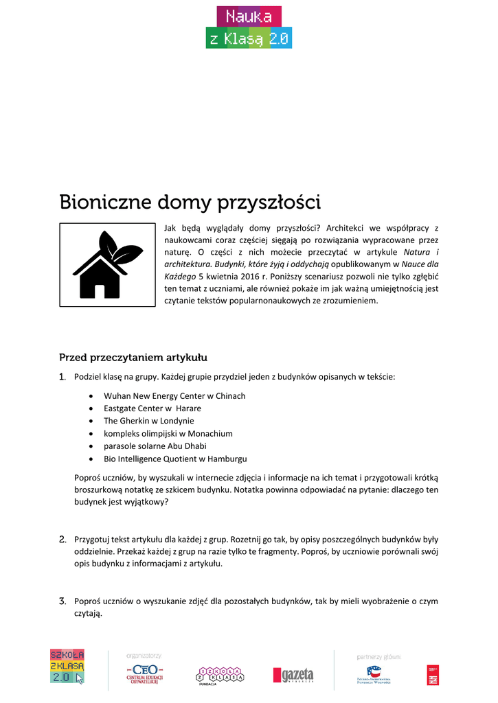 Jak będą wyglądały domy przyszłości? Architekci we współpracy z naukowcami coraz częściej sięgają po rozwiązania wypracowane przez naturę. O części z nich możecie przeczytać w artykule Natura i architektura. Budynki, które żyją i oddychają opublikowanym w Nauce dla Każdego 5 kwietnia 2016 r. Poniższy scenariusz pozwoli nie tylko zgłębić ten temat z uczniami, ale również pokaże im jak ważną umiejętnością jest czytanie tekstów popularnonaukowych ze zrozumieniem. Podziel klasę na grupy. Każdej grupie przydziel jeden z budynków opisanych w tekście: Wuhan New Energy Center w Chinach Eastgate Center w Harare The Gherkin w Londynie kompleks olimpijski w Monachium parasole solarne Abu Dhabi Bio Intelligence Quotient w Hamburgu Poproś uczniów, by wyszukali w internecie zdjęcia i informacje na ich temat i przygotowali krótką broszurkową notatkę ze szkicem budynku. Notatka powinna odpowiadać na pytanie: dlaczego ten budynek jest wyjątkowy? Przygotuj tekst artykułu dla każdej z grup. Rozetnij go tak, by opisy poszczególnych budynków były oddzielnie. Przekaż każdej z grup na razie tylko te fragmenty. Poproś, by uczniowie porównali swój opis budynku z informacjami z artykułu. Poproś uczniów o wyszukanie zdjęć dla pozostałych budynków, tak by mieli wyobrażenie o czym czytają. Rozdaj grupom brakujące fragmenty tekstu. Wyznacz czas na indywidualne czytanie fragmentów. Zadaniem każdej grupy jest złożenie artykułu z otrzymanych elementów. Odtworzony artykuł nie musi być dokładnie taki sam jak oryginalny. Po ułożeniu całości tekstu każda grupa czyta swój artykuł raz jeszcze, by upewnić się, że dobór fragmentów ma sens. Kiedy tekst zostanie już ukończony, rozdaj oryginalna wersje artykułu do porównania. Zastanów się z każdą z grup, jakie są różnice i dlaczego autor wybrał inna konstrukcje niż uczniowie. Czy taka zmiana powoduje, ze inaczej rozumiemy tekst? Poproś uczniów, by do tekstu dopisali jeden lub dwa dodatkowe przykłady budynków lub projektów naśladujących naturę. Wspólnie zastanówcie się, jak najskuteczniej można wyszukać je przy pomocy wyszukiwarki. Dopisywana informacja powinna skupiać się na tym, jaki proces lub element natury był inspiracja dla projektantów i jakie problemy rozwiązuje (przykłady budynków: DragonFly w Nowym Yorku, Mountain Band-Aid). Po co to wszystko? Stwórzcie wspólnie listę argumentów za i przeciw stosowaniu biomimikry w architekturze. Rozważcie aspekty finansowe, techniczne, estetyczne, moralne. Architektów inspirują głównie rozwiązania stosowane przez owady, bo owady, tak jak ludzie, żyją w wielkich skupiskach. Zastanówcie się wspólnie, jakie procesy lub „wynalazki” z owadzich społeczności można przenieść do świata ludzi. Wyszukajcie dwa takie rozwiązania. Kolejny krok po biomimikrze w architekturze to projektowanie całych miast jako ekosystemów. Przypomnij lub zapoznaj uczniów z pojęciami: biomimikra, ekosystem, inżynieria bioniczna. Finalnym zadaniem uczniów jest zaprojektowanie miasta, które będzie samowystarczalne – produkuje dla siebie żywność i energię, korzysta z transportu zasilanego własnymi zasobami, pozyskuje wodę i oczyszcza ścieki, utylizuje odpady. Projekty miast powstają w grupach, na papierze, w postaci planu miasta z opisami zastosowanych technologii. Można wykorzystać technologie opisane w artykule, ale warto też włączyć wyobraźnię i wymyślić własne rozwiązania. Magdalena Wojtaś W materiale wykorzystano następujące ikony z portalu thenounproject.com (data dostępu: 04.04.2016 r.): 1. Green House, sagit milshtein, CC BY 3.0 US