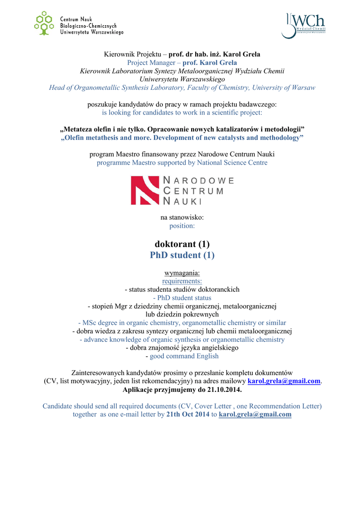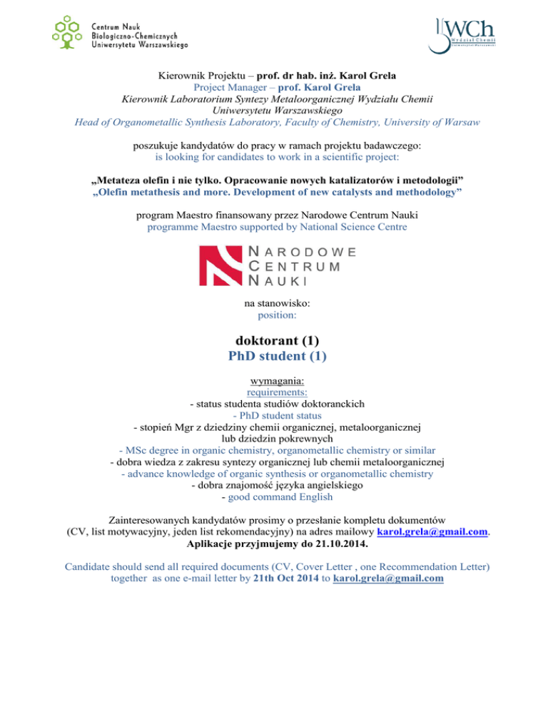 Kierownik Projektu – prof. dr hab. inż. Karol Grela Project Manager – prof. Karol Grela Kierownik Laboratorium Syntezy Metaloorganicznej Wydziału Chemii Uniwersytetu Warszawskiego Head of Organometallic Synthesis Laboratory, Faculty of Chemistry, University of Warsaw poszukuje kandydatów do pracy w ramach projektu badawczego: is looking for candidates to work in a scientific project: „Metateza olefin i nie tylko. Opracowanie nowych katalizatorów i metodologii” „Olefin metathesis and more. Development of new catalysts and methodology” program Maestro finansowany przez Narodowe Centrum Nauki programme Maestro supported by National Science Centre na stanowisko: position: doktorant (1) PhD student (1) wymagania: requirements: - status studenta studiów doktoranckich - PhD student status - stopień Mgr z dziedziny chemii organicznej, metaloorganicznej lub dziedzin pokrewnych - MSc degree in organic chemistry, organometallic chemistry or similar - dobra wiedza z zakresu syntezy organicznej lub chemii metaloorganicznej - advance knowledge of organic synthesis or organometallic chemistry - dobra znajomość języka angielskiego - good command English Zainteresowanych kandydatów prosimy o przesłanie kompletu dokumentów (CV, list motywacyjny, jeden list rekomendacyjny) na adres mailowy [email protected]. Aplikacje przyjmujemy do 21.10.2014. Candidate should send all required documents (CV, Cover Letter , one Recommendation Letter) together as one e-mail letter by 21th Oct 2014 to [email protected]
