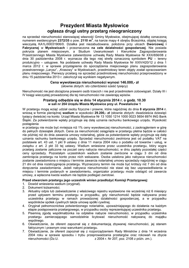 Prezydent Miasta Mysłowice ogłasza drugi ustny przetarg nieograniczony na sprzedaŜ nieruchomości stanowiącej własność Gminy Mysłowice, obejmującej działkę oznaczoną 2 numerem ewidencyjnym 2372/35 o pow. 2110 m , na karcie mapy 4 obrębu Brzezinka, objętej księgą wieczystą KA1L/00031906/0. Działka jest niezabudowana. połoŜona przy ulicach Dworcowej i Fabrycznej w Mysłowicach i przeznaczona na cele działalności gospodarczej. Nie posiada pokrycia planem miejscowym, a Studium Uwarunkowań i Kierunków Zagospodarowania Przestrzennego Miasta Mysłowice zatwierdzone uchwałą Rady Miasta Mysłowice Nr XXX/656/08 z dnia 30 października 2008 r. wyznacza dla tego niej strefę oznaczoną symbolem PU – tereny produkcyjno – usługowe. Na podstawie uchwały Rady Miasta Mysłowice Nr XXIV/420/12 z dnia 1 marca 2012 r. w sprawie przystąpienia do sporządzenia miejscowego planu zagospodarowania przestrzennego „Larysz”, „Krasowy” w Mysłowicach, przedmiotowy teren objęty został opracowaniem planu miejscowego. Pierwszy przetarg na sprzedaŜ przedmiotowej nieruchomości przeprowadzony w dniu 15 października 2013 r. zakończył się wynikiem negatywnym. Cena wywoławcza nieruchomości wynosi 146.000,- zł (słownie złotych: sto czterdzieści sześć tysięcy) Nieruchomość nie jest obciąŜona prawami osób trzecich i nie jest przedmiotem zobowiązań. Działy III i IV księgi wieczystej prowadzonej dla tej nieruchomości nie zawierają wpisów. Przetarg odbędzie się w dniu 14 stycznia 2014 r. o godz. 10.30 w sali nr 204 Urzędu Miasta Mysłowice przy ul. Powstańców 1 W przetargu mogą wziąć udział osoby fizyczne i prawne, które najpóźniej do dnia 8 stycznia 2014 r. wniosą w formie pienięŜnej wadium w wysokości 29.200,- zł (słownie złotych: dwadzieścia dziewięć tysięcy dwieście) na konto: Urząd Miasta Mysłowice Nr 13 1050 1214 1000 0023 5654 6974 ING Bank Śląski. Za potwierdzenie wpłaty przyjmuje się datę uznania rachunku bankowego urzędu. Wysokość postąpienia w przetargu nie moŜe być mniejsza niŜ 1% ceny wywoławczej nieruchomości, z zaokrągleniem w górę do pełnych dziesiątek złotych. Cena za nieruchomość osiągnięta w przetargu płatna będzie w całości nie później niŜ do dnia zawarcia umowy notarialnej, gdzie za potwierdzenie wpłaty przyjmuje się datę uznania rachunku bankowego urzędu. SprzedaŜ nieruchomości zwolniona jest od podatku VAT na podstawie art. 43 ust. 1 pkt 9 ustawy z dnia 11 marca 2004 roku o podatku od towarów i usług, w związku z art. 2 pkt 33 tej ustawy. Wadium wniesione przez uczestnika przetargu, który wygra przetarg zostanie zaliczone na poczet ceny nabycia nieruchomości, w dniu zapłaty pozostałej części ceny sprzedaŜy. Pozostałym uczestnikom wadium zostanie zwrócone w ciągu 3 dni od dnia zamknięcia przetargu na konto przez nich wskazane. Osoba ustalona jako nabywca nieruchomości zostanie zawiadomiona o miejscu i terminie zawarcia notarialnej umowy sprzedaŜy najpóźniej w ciągu 21 dni od dnia rozstrzygnięcia przetargu. Wyznaczony termin nie moŜe być krótszy niŜ 7 dni od dnia doręczenia zawiadomienia. JeŜeli nabywca nieruchomości nie stawi się bez usprawiedliwienia w miejscu i terminie podanych w zawiadomieniu, organizator przetargu moŜe odstąpić od zawarcia umowy, a wpłacona kwota wadium nie będzie podlegać zwrotowi. Przed otwarciem przetargu jego uczestnik winien przedłoŜyć Komisji Przetargowej: 1. Dowód wniesienia wadium (oryginał). 2. Dokument toŜsamości. 3. Aktualny odpis lub zaświadczenie z właściwego rejestru wystawione nie wcześniej niŜ 6 miesięcy przed upływem terminu przetargu w przypadku, gdy nieruchomość będzie nabywana przez uczestnika przetargu w ramach prowadzonej działalności gospodarczej, a w przypadku wspólników spółek cywilnych takŜe umowę spółki cywilnej. 4. Oryginał pełnomocnictwa potwierdzonego notarialnie, upowaŜniającego do działania na kaŜdym etapie postępowania przetargowego, w przypadku osoby reprezentującej uczestnika przetargu. 5. Pisemną zgodę współmałŜonka na odpłatne nabycie nieruchomości, w przypadku uczestnika przetargu zamierzającego samodzielnie licytować nieruchomość nabywaną do majątku wspólnego. 6. Oświadczenie, Ŝe oferent zapoznał się z dokumentacją zbywanej nieruchomości, jej stanem faktycznym i prawnym oraz warunkami przetargu. 7. Oświadczenie, Ŝe oferent zapoznał się z rozporządzeniem Rady Ministrów z dnia 14 września 2004 roku w sprawie sposobu i trybu przeprowadzania przetargów oraz rokowań na zbycie nieruchomości (Dz.U. z 2004 r. Nr 207, poz. 2108 z późn. zm.). 8. Numer rachunku bankowego, na które zostanie zwrócone wadium, w przypadku nie wygrania przetargu. Cudzoziemcy mogą nabywać nieruchomości zgodnie z obowiązującymi przepisami ustawy o nabywaniu nieruchomości przez cudzoziemców Informacje dotyczące zbywanej nieruchomości oraz warunki realizacji zamierzeń inwestycyjnych: • Nieruchomość usytuowana jest na południe od centrum miasta, w dzielnicy Brzezinka, w sąsiedztwie znajduje się zabudowa przemysłowa. Posiada nieregularny kształt, jest niezabudowana, w całości porośnięta trawą oraz samosiejkami drzew i krzewów, a przez jej środek przechodzi skarpa. Obsługa komunikacyjna nieruchomości moŜe odbywać się z drogi publicznej ulicy Fabrycznej po uzgodnieniu zjazdu z zarządcą drogi w odrębnym postępowaniu. • Teren, zgodnie z zapisami w obowiązującym studium, przeznaczony jest pod zabudowę na cele działalności gospodarczej. Szczegółowe zagospodarowanie nieruchomości i jej zabudowa nastąpi na podstawie decyzji o warunkach zabudowy, wydanej na wniosek nabywcy. • W zakresie niezbędnym do prawidłowego funkcjonowania i zagospodarowania nieruchomości jej nabywca własnym staraniem i na własny koszt, zobowiązany będzie do: - uzyskania zapewnienia dostawy mediów, zrealizowania uzbrojenia technicznego 