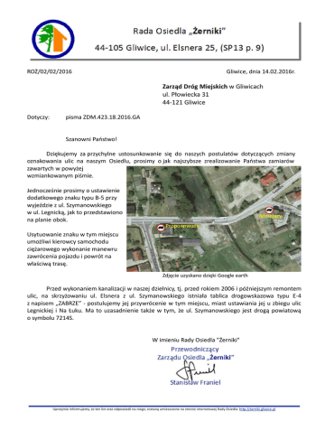 ROŻ/02/02/2016 Gliwice, dnia 14.02.2016r. Zarząd Dróg Miejskich w Gliwicach ul. Płowiecka 31 44-121 Gliwice Dotyczy: pisma ZDM.423.18.2016.GA Szanowni Państwo! Dziękujemy za przychylne ustosunkowanie się do naszych postulatów dotyczących zmiany oznakowania ulic na naszym Osiedlu, prosimy o jak najszybsze zrealizowanie Państwa zamiarów zawartych w powyżej wzmiankowanym piśmie. Jednocześnie prosimy o ustawienie dodatkowego znaku typu B-5 przy wyjeździe z ul. Szymanowskiego w ul. Legnicką, jak to przedstawiono na planie obok. Usytuowanie znaku w tym miejscu umożliwi kierowcy samochodu ciężarowego wykonanie manewru zawrócenia pojazdu i powrót na właściwą trasę. Zdjęcie uzyskano dzięki Google earth Przed wykonaniem kanalizacji w naszej dzielnicy, tj. przed rokiem 2006 i późniejszym remontem ulic, na skrzyżowaniu ul. Elsnera z ul. Szymanowskiego istniała tablica drogowskazowa typu E-4 z napisem „ZABRZE” - postulujemy jej przywrócenie w tym miejscu, miast ustawiania jej u zbiegu ulic Legnickiej i Na Łuku. Ma to uzasadnienie także w tym, że ul. Szymanowskiego jest drogą powiatową o symbolu 7214S. W imieniu Rady Osiedla "Żerniki" Uprzejmie informujemy, że ten list oraz odpowiedź na niego, zostaną umieszczone na stronie internetowej Rady Osiedla: http://zerniki.gliwice.pl