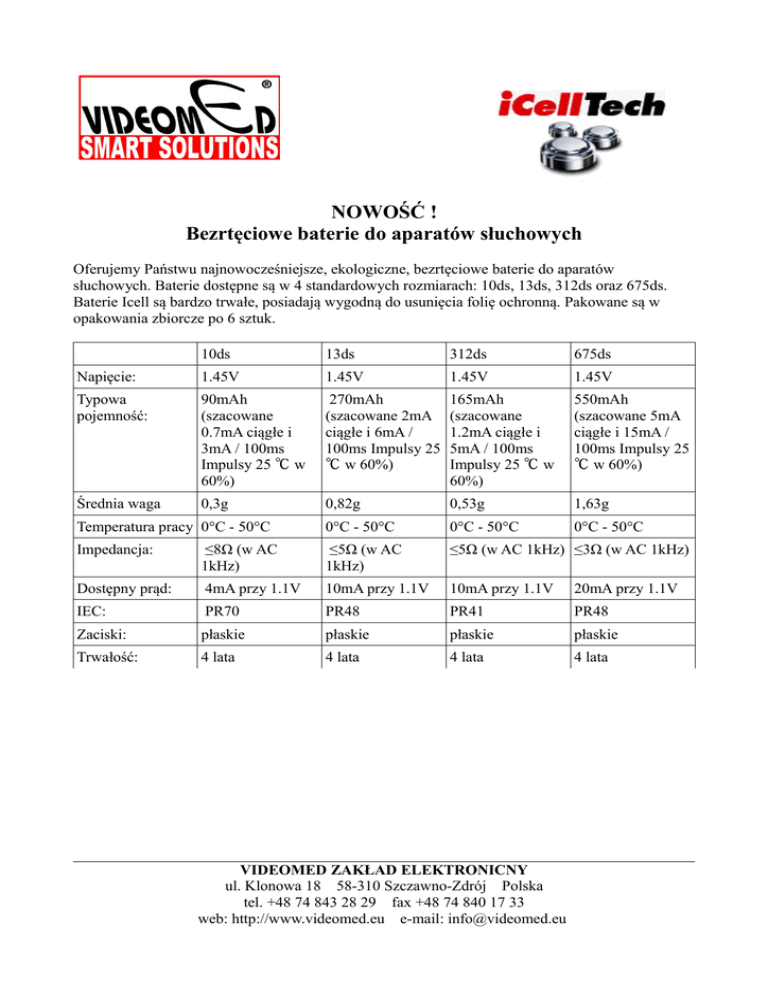NOWOŚĆ ! Bezrtęciowe baterie do aparatów słuchowych Oferujemy Państwu najnowocześniejsze, ekologiczne, bezrtęciowe baterie do aparatów słuchowych. Baterie dostępne są w 4 standardowych rozmiarach: 10ds, 13ds, 312ds oraz 675ds. Baterie Icell są bardzo trwałe, posiadają wygodną do usunięcia folię ochronną. Pakowane są w opakowania zbiorcze po 6 sztuk. 10ds 13ds 312ds 675ds Napięcie: 1.45V 1.45V 1.45V 1.45V Typowa pojemność: 90mAh (szacowane 0.7mA ciągłe i 3mA / 100ms Impulsy 25 ℃ w 60%) 270mAh (szacowane 2mA ciągłe i 6mA / 100ms Impulsy 25 ℃ w 60%) 165mAh (szacowane 1.2mA ciągłe i 5mA / 100ms Impulsy 25 ℃ w 60%) 550mAh (szacowane 5mA ciągłe i 15mA / 100ms Impulsy 25 ℃ w 60%) Średnia waga 0,3g 0,82g 0,53g 1,63g Temperatura pracy 0°C - 50°C 0°C - 50°C 0°C - 50°C 0°C - 50°C Impedancja: ≤8Ω (w AC 1kHz) ≤5Ω (w AC 1kHz) ≤5Ω (w AC 1kHz) ≤3Ω (w AC 1kHz) Dostępny prąd: 4mA przy 1.1V 10mA przy 1.1V 10mA przy 1.1V 20mA przy 1.1V IEC: PR70 PR48 PR41 PR48 Zaciski: płaskie płaskie płaskie płaskie Trwałość: 4 lata 4 lata 4 lata 4 lata VIDEOMED ZAKŁAD ELEKTRONICNY ul. Klonowa 18 58-310 Szczawno-Zdrój Polska tel. +48 74 843 28 29 fax +48 74 840 17 33 web: http://www.videomed.eu e-mail: [email protected]