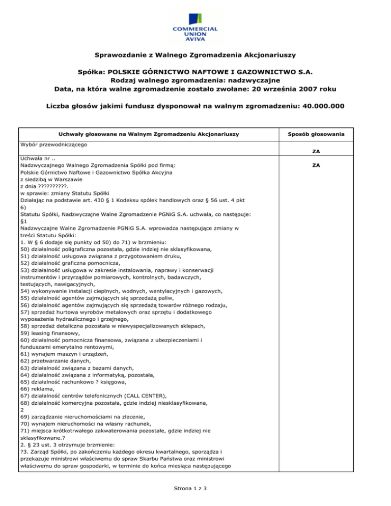 Sprawozdanie z Walnego Zgromadzenia Akcjonariuszy Spółka: POLSKIE GÓRNICTWO NAFTOWE I GAZOWNICTWO S.A. Rodzaj walnego zgromadzenia: nadzwyczajne Data, na która walne zgromadzenie zostało zwołane: 20 września 2007 roku Liczba głosów jakimi fundusz dysponował na walnym zgromadzeniu: 40.000.000 Uchwały głosowane na Walnym Zgromadzeniu Akcjonariuszy Sposób głosowania Wybór przewodniczącego ZA Uchwała nr .. Nadzwyczajnego Walnego Zgromadzenia Spółki pod firmą: Polskie Górnictwo Naftowe i Gazownictwo Spółka Akcyjna z siedzibą w Warszawie z dnia ??????????. w sprawie: zmiany Statutu Spółki Działając na podstawie art. 430 § 1 Kodeksu spółek handlowych oraz § 56 ust. 4 pkt 6) Statutu Spółki, Nadzwyczajne Walne Zgromadzenie PGNiG S.A. uchwala, co następuje: §1 Nadzwyczajne Walne Zgromadzenie PGNiG S.A. wprowadza następujące zmiany w treści Statutu Spółki: 1. W § 6 dodaje się punkty od 50) do 71) w brzmieniu: 50) działalność poligraficzna pozostała, gdzie indziej nie sklasyfikowana, 51) działalność usługowa związana z przygotowaniem druku, 52) działalność graficzna pomocnicza, 53) działalność usługowa w zakresie instalowania, naprawy i konserwacji instrumentów i przyrządów pomiarowych, kontrolnych, badawczych, testujących, nawigacyjnych, 54) wykonywanie instalacji cieplnych, wodnych, wentylacyjnych i gazowych, 55) działalność agentów zajmujących się sprzedażą paliw, 56) działalność agentów zajmujących się sprzedażą towarów różnego rodzaju, 57) sprzedaż hurtowa wyrobów metalowych oraz sprzętu i dodatkowego wyposażenia hydraulicznego i grzejnego, 58) sprzedaż detaliczna pozostała w niewyspecjalizowanych sklepach, 59) leasing finansowy, 60) działalność pomocnicza finansowa, związana z ubezpieczeniami i funduszami emerytalno rentowymi, 61) wynajem maszyn i urządzeń, 62) przetwarzanie danych, 63) działalność związana z bazami danych, 64) działalność związana z informatyką, pozostała, 65) działalność rachunkowo ? księgowa, 66) reklama, 67) działalność centrów telefonicznych (CALL CENTER), 68) działalność komercyjna pozostała, gdzie indziej niesklasyfikowana, 2 69) zarządzanie nieruchomościami na zlecenie, 70) wynajem nieruchomości na własny rachunek, 71) miejsca krótkotrwałego zakwaterowania pozostałe, gdzie indziej nie sklasyfikowane.? 2. § 23 ust. 3 otrzymuje brzmienie: ?3. Zarząd Spółki, po zakończeniu każdego okresu kwartalnego, sporządza i przekazuje ministrowi właściwemu do spraw Skarbu Państwa oraz ministrowi właściwemu do spraw gospodarki, w terminie do końca miesiąca następującego Strona 1 z 3 ZA po okresie rozliczeniowym, analizę ekonomiczno-finansową Spółki oraz operatorów systemu dystrybucyjnego, w formie określonej przez ministra właściwego do spraw Skarbu Państwa.? 3. W § 33 ust. 1 punkt 4) wyraz ?Spółki? zastępuje się wyrazami ?grupy kapitałowej?. 4. Użyte w § 33 ust. 3 punkty od 12) do 14) w różnej liczbie i przypadku, wyrazy ?spółka dystrybucyjna? zastępuje się użytymi w odpowiedniej liczbie i przypadku wyrazami ?operator systemu dystrybucyjnego?. 5. W § 56 ust. 1 po wyrazie ?jest? dodaje się wyrażenie ?w szczególności?. 6. W § 65 dodaje się ust. 6 w brzmieniu: ?6. Ilekroć w Statucie jest mowa o wartości składników aktywów trwałych, w tym nieruchomości, użytkowania wieczystego lub udziałów w nieruchomości, ustalenia tej wartości dokonuje się zgodnie z przepisami ustawy z dnia 30 sierpnia 1996 r. o komercjalizacji i prywatyzacji (Dz. U. z 2002 r. Nr 171, poz. 1397 ze zm.) oraz aktami wykonawczymi do tej ustawy?. 7. W § 66 ust. 1 otrzymuje następujące brzmienie: ?1. Operatorem systemu dystrybucyjnego, w rozumieniu niniejszego statutu, jest spółka zależna Polskiego Górnictwa Naftowego i Gazownictwa S.A. stanowiąca przedsiębiorstwo energetyczne zajmujące się dystrybucją paliw gazowych, odpowiedzialne za ruch sieciowy w systemie dystrybucyjnym gazowym, bieżące i długookresowe bezpieczeństwo funkcjonowania tego systemu, eksploatacje, konserwację, remonty oraz niezbędną rozbudowę sieci dystrybucyjnej, w tym połączeń z innymi systemami gazowymi.? §2 Uchwała wchodzi w życie z dniem podjęcia. Uchwała nr .. Nadzwyczajnego Walnego Zgromadzenia Spółki pod firmą: Polskie Górnictwo Naftowe i Gazownictwo Spółka Akcyjna z siedzibą w Warszawie z dnia ??????????. w sprawie: użycia kapitału rezerwowego pn. ?Centralny Fundusz Restrukturyzacji na lata 2005?2007? na jednorazowe wypłaty (osłony) dla byłych pracowników ZUN Naftomet Sp. z o.o. w Krośnie. 3 Działając na podstawie § 56 ust 3 pkt 9 Statutu Spółki oraz uwzględniając pozytywną opinię Rady Nadzorczej PGNiG S.A. wyrażoną w Uchwale Nr 71/IV/07 z dnia 27.06.2007r. uchwala się, co następuje: §1 Walne Zgromadzenie Spółki PGNiG S.A. postanawia użyć środki z kapitału rezerwowego pn. ?Centralny Fundusz Restrukturyzacji na lata 2005?2007? w kwocie: 1 070 000 zł na jednorazowe wypłaty (osłony) dla 26 byłych pracowników ZUN Naftomet Sp. z o.o. w Krośnie. Uchwała nr .. Nadzwyczajnego Walnego Zgromadzenia Spółki pod firmą: Polskie Górnictwo Naftowe i Gazownictwo Spółka Akcyjna z siedzibą w Warszawie z dnia ??????????. w sprawie: określenia warunków i trybu sprzedaży udziałów PP-UiH ?TURGAZ? Sp. z o.o. §1 Nadzwyczajne Walne Zgromadzenie, działając na podstawie § 27 pkt 1 Rozporządzenia Rady Ministrów w sprawie określenia sposobu i trybu organizowania przetargu na sprzedaż składników aktywów trwałych przez spółkę powstałą w wyniku komercjalizacji z dnia 13.02.2007 r. (Dz. U. z 2007 r. nr 27 poz. 177), uwzględniając wniosek Zarządu złożony zgodnie z Uchwałą nr 564/2007 z dnia 09.08.2007r. oraz pozytywną opinię Rady Nadzorczej zwartą w Uchwale nr ?. z dnia ?.., określa następujące warunki i tryb sprzedaży posiadanych przez PGNiG Strona 2 z 3 WSTRZYMAŁ SIĘ WSTRZYMAŁ SIĘ S.A. u