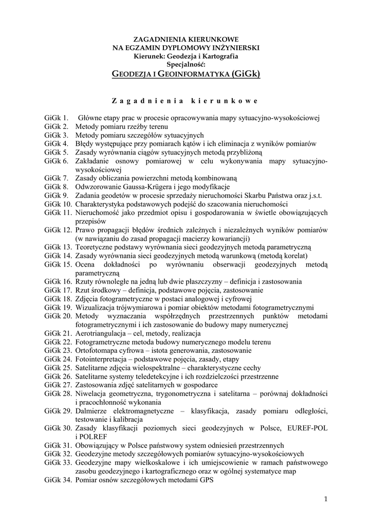 ZAGADNIENIA KIERUNKOWE NA EGZAMIN DYPLOMOWY INŻYNIERSKI Kierunek: Geodezja i Kartografia Specjalność: GEODEZJA I GEOINFORMATYKA (GiGk) Z a g a d n i e n i a GiGk 1. GiGk 2. GiGk 3. GiGk 4. GiGk 5. GiGk 6. GiGk 7. GiGk 8. GiGk 9. GiGk 10. GiGk 11. GiGk 12. GiGk 13. GiGk 14. GiGk 15. GiGk 16. GiGk 17. GiGk 18. GiGk 19. GiGk 20. GiGk 21. GiGk 22. GiGk 23. GiGk 24. GiGk 25. GiGk 26. GiGk 27. GiGk 28. GiGk 29. GiGk 30. GiGk 31. GiGk 32. GiGk 33. GiGk 34. k i e r u n k o w e Główne etapy prac w procesie opracowywania mapy sytuacyjno-wysokościowej Metody pomiaru rzeźby terenu Metody pomiaru szczegółów sytuacyjnych Błędy występujące przy pomiarach kątów i ich eliminacja z wyników pomiarów Zasady wyrównania ciągów sytuacyjnych metodą przybliżoną Zakładanie osnowy pomiarowej w celu wykonywania mapy sytuacyjnowysokościowej Zasady obliczania powierzchni metodą kombinowaną Odwzorowanie Gaussa-Krügera i jego modyfikacje Zadania geodetów w procesie sprzedaży nieruchomości Skarbu Państwa oraz j.s.t. Charakterystyka podstawowych podejść do szacowania nieruchomości Nieruchomość jako przedmiot opisu i gospodarowania w świetle obowiązujących przepisów Prawo propagacji błędów średnich zależnych i niezależnych wyników pomiarów (w nawiązaniu do zasad propagacji macierzy kowariancji) Teoretyczne podstawy wyrównania sieci geodezyjnych metodą parametryczną Zasady wyrównania sieci geodezyjnych metodą warunkową (metodą korelat) Ocena dokładności po wyrównaniu obserwacji geodezyjnych metodą parametryczną Rzuty równoległe na jedną lub dwie płaszczyzny – definicja i zastosowania Rzut środkowy – definicja, podstawowe pojęcia, zastosowanie Zdjęcia fotogrametryczne w postaci analogowej i cyfrowej Wizualizacja trójwymiarowa i pomiar obiektów metodami fotogrametrycznymi Metody wyznaczania współrzędnych przestrzennych punktów metodami fotogrametrycznymi i ich zastosowanie do budowy mapy numerycznej Aerotriangulacja – cel, metody, realizacja Fotogrametryczne metoda budowy numerycznego modelu terenu Ortofotomapa cyfrowa – istota generowania, zastosowanie Fotointerpretacja – podstawowe pojęcia, zasady, etapy Satelitarne zdjęcia wielospektralne – charakterystyczne cechy Satelitarne systemy teledetekcyjne i ich rozdzielczości przestrzenne Zastosowania zdjęć satelitarnych w gospodarce Niwelacja geometryczna, trygonometryczna i satelitarna – porównaj dokładności i pracochłonność wykonania Dalmierze elektromagnetyczne – klasyfikacja, zasady pomiaru odległości, testowanie i kalibracja Zasady klasyfikacji poziomych sieci geodezyjnych w Polsce, EUREF-POL i POLREF Obowiązujący w Polsce państwowy system odniesień przestrzennych Geodezyjne metody szczegółowych pomiarów sytuacyjno-wysokościowych Geodezyjne mapy wielkoskalowe i ich umiejscowienie w ramach państwowego zasobu geodezyjnego i kartograficznego oraz w ogólnej systematyce map Pomiar osnów szczegółowych metodami GPS 1 GiGk 35. Wykorzystanie serwisów systemu ASG-EUPOS w pomiarach geodezyjnych GiGk 36. Zasady wykonywania pomiarów metodą RTK GiGk 37. Możliwości wykorzystania technik GNSS w procesie inwentaryzacji obiektów terenowych GiGk 38. Układy współrzędnych stosowane w geodezji GiGk 39. Systemy wysokości stosowane w geodezji GiGk 40. Opracowanie osnowy realizacyjnej w układzie lokalnym GiGk 41. Zakres opracowania geodezyjnego projektu inwestycji GiGk 42. GESUT cel prowadzenia, zakres GiGk 43. Pomiary deformacji i przemieszczeń GiGk 44. Geodezyjne opracowanie planu realizacyjnego GiGk 45. Wysokościowe opracowanie odcinka trasy drogowej GiGk 46. Metoda fazowa i impulsowa pomiaru odległości dalmierzem elektronicznym GiGk 47. Metody pomiarów geodezyjnych GPS GiGk 48. Metoda względnego wyznaczania pozycji z zastosowaniem systemów nawigacyjnych GiGk 49. Działanie i wykorzystanie systemu stacji referencyjnych w geodezji GiGk 50. Metody przeliczeń współrzędnych od układu satelitarnego WGS84 do układów państwowych 1965 i 2000 GiGk 51. Modele danych stosowanych w Systemach Informacji Przestrzennej GiGk 52. Relacyjny model danych GiGk 53. Źródła pozyskiwania danych dla systemów informacji geograficznej GiGk 54. Państwowe układy współrzędnych płaskich GiGk 55. Charakterystyka polskich map topograficznych 2 ZAGADNIENIA SPECJALNOŚCIOWE NA EGZAMIN DYPLOMOWY INŻYNIERSKI Kierunek: Geodezja i Kartografia Specjalność: GEODEZJA I GEOINFORMATYKA (GiGs) Z a g a d n i e n i a GiGs 1. GiGs 2. GiGs 3. GiGs 4. GiGs 5. GiGs 6. GiGs 7. GiGs 8. GiGs 9. GiGs 10. GiGs 11. GiGs 12. GiGs 13. GiGs 14. GiGs 15. GiGs 16. GiGs 17. GiGs 18. GiGs 19. GiGs 20. GiGs 21. GiGs 22. GiGs 23. GiGs 24. GiGs 25. GiGs 26. GiGs 27. GiGs 28. GiGs 29. GiGs 30. GiGs 31. GiGs 32. GiGs 33. GiGs 34. GiGs 35. s p e c j a l n o ś c i o w e Główne etapy proces inwestycyjny Konstrukcje stosowane w budownictwie Warunki techniczne, jakim powinny odpowiadać obiekty budowlane Zasady ogólne ustalania wartości katastralnej nieruchomości Mapa analogowa a mapa numeryczna – podobieństwa i różnice Zakres obligatoryjny i fakultatywny treści mapy zasadniczej Mapa wektorowa, rastrowa, hybrydowa – cechy, jakość i możliwości wykorzystania Scalenie gruntów jako element kształtujący obszary wiejskie Etapy scalenia gruntów Szacunek porównawczy gruntów z uwzględnieniem ich klasyfikacji Ocena oddziaływania projektu scalenia na środowisko Rodzaje i cel studiów sporządzanych w ramach scalenia gruntów Projekt szczegółowy scalenia – teść, zasady opracowania Treść map geologicznych Treść map glebowo-rolniczych Zasady gleboznawczej klasyfikacji gruntów w Polsce Podstawowe typy gleb Polski Rodzaje przestrzeni Cechy przestrzeni Koncepcja przestrzennego zagospodarowania kraju – zakres treści Dokumenty planistyczne na poziomie wojewódzkim Opracowania planistyczne występujące na obszarze gminy Główne ustalenia planów miejscowych Informacje z planu miejscowego w