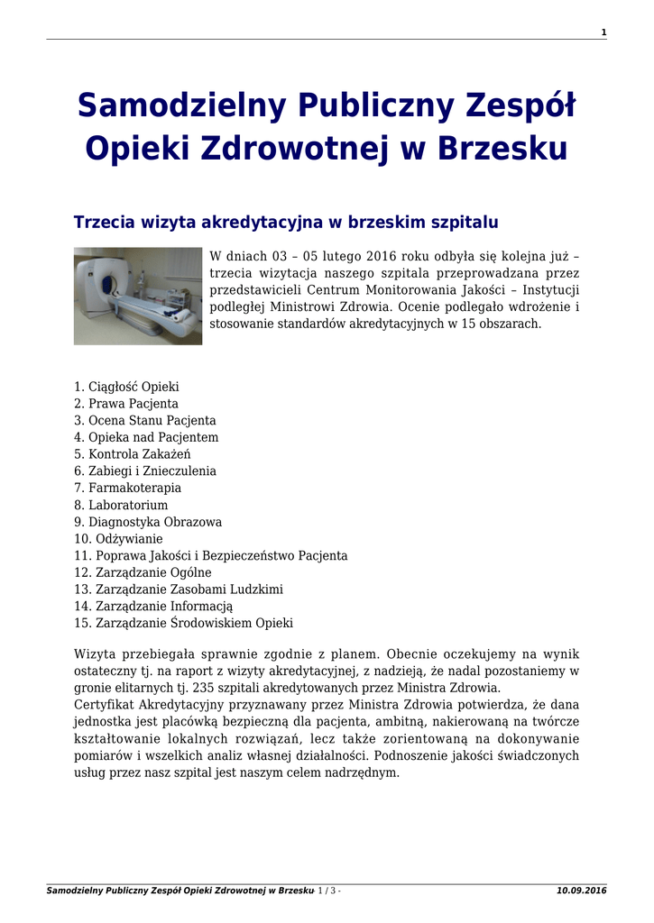 1 Samodzielny Publiczny Zespół Opieki Zdrowotnej w Brzesku Trzecia wizyta akredytacyjna w brzeskim szpitalu W dniach 03 – 05 lutego 2016 roku odbyła się kolejna już – trzecia wizytacja naszego szpitala przeprowadzana przez przedstawicieli Centrum Monitorowania Jakości – Instytucji podległej Ministrowi Zdrowia. Ocenie podlegało wdrożenie i stosowanie standardów akredytacyjnych w 15 obszarach. 1. Ciągłość Opieki 2. Prawa Pacjenta 3. Ocena Stanu Pacjenta 4. Opieka nad Pacjentem 5. Kontrola Zakażeń 6. Zabiegi i Znieczulenia 7. Farmakoterapia 8. Laboratorium 9. Diagnostyka Obrazowa 10. Odżywianie 11. Poprawa Jakości i Bezpieczeństwo Pacjenta 12. Zarządzanie Ogólne 13. Zarządzanie Zasobami Ludzkimi 14. Zarządzanie Informacją 15. Zarządzanie Środowiskiem Opieki Wizyta przebiegała sprawnie zgodnie z planem. Obecnie oczekujemy na wynik ostateczny tj. na raport z wizyty akredytacyjnej, z nadzieją, że nadal pozostaniemy w gronie elitarnych tj. 235 szpitali akredytowanych przez Ministra Zdrowia. Certyfikat Akredytacyjny przyznawany przez Ministra Zdrowia potwierdza, że dana jednostka jest placówką bezpieczną dla pacjenta, ambitną, nakierowaną na twórcze kształtowanie lokalnych rozwiązań, lecz także zorientowaną na dokonywanie pomiarów i wszelkich analiz własnej działalności. Podnoszenie jakości świadczonych usług przez nasz szpital jest naszym celem nadrzędnym. Samodzielny Publiczny Zespół Opieki Zdrowotnej w Brzesku- 1 / 3 - 10.09.2016 2 Samodzielny Publiczny Zespół Opieki Zdrowotnej w Brzesku- 2 / 3 - 10.09.2016 3 Samodzielny Publiczny Zespół Opieki Zdrowotnej w Brzesku- 3 / 3 - 10.09.2016