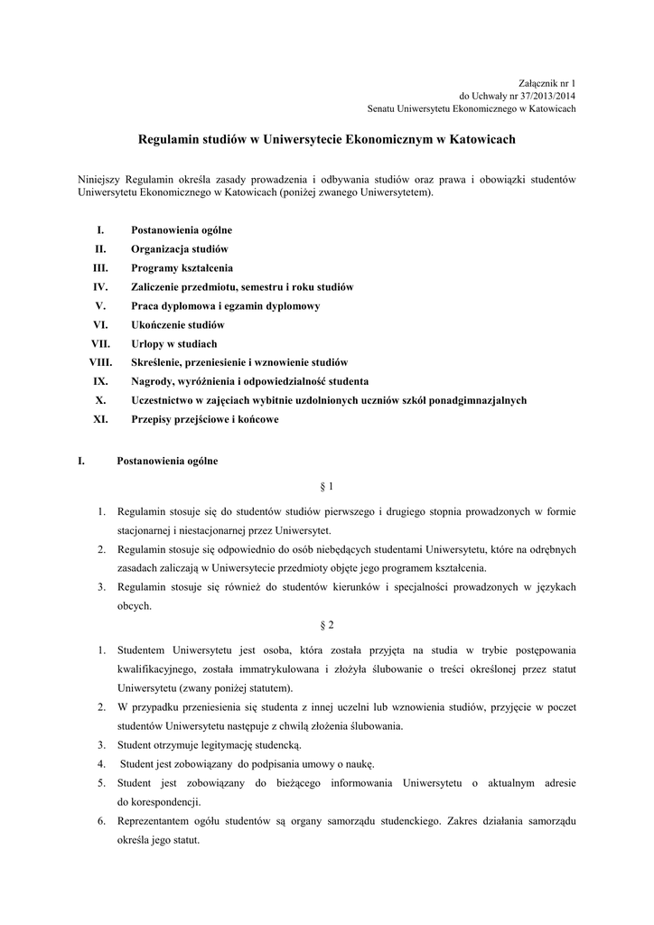 Załącznik nr 1 do Uchwały nr 37/2013/2014 Senatu Uniwersytetu Ekonomicznego w Katowicach Regulamin studiów w Uniwersytecie Ekonomicznym w Katowicach Niniejszy Regulamin określa zasady prowadzenia i odbywania studiów oraz prawa i obowiązki studentów Uniwersytetu Ekonomicznego w Katowicach (poniżej zwanego Uniwersytetem). I. Postanowienia ogólne II. Organizacja studiów III. Programy kształcenia IV. Zaliczenie przedmiotu, semestru i roku studiów V. Praca dyplomowa i egzamin dyplomowy VI. Ukończenie studiów VII. Urlopy w studiach VIII. Skreślenie, przeniesienie i wznowienie studiów IX. Nagrody, wyróżnienia i odpowiedzialność studenta X. Uczestnictwo w zajęciach wybitnie uzdolnionych uczniów szkół ponadgimnazjalnych XI. Przepisy przejściowe i końcowe I. Postanowienia ogólne §1 1. Regulamin stosuje się do studentów studiów pierwszego i drugiego stopnia prowadzonych w formie stacjonarnej i niestacjonarnej przez Uniwersytet. 2. Regulamin stosuje się odpowiednio do osób niebędących studentami Uniwersytetu, które na odrębnych zasadach zaliczają w Uniwersytecie przedmioty objęte jego programem kształcenia. 3. Regulamin stosuje się również do studentów kierunków i specjalności prowadzonych w językach obcych. §2 1. Studentem Uniwersytetu jest osoba, która została przyjęta na studia w trybie postępowania kwalifikacyjnego, została immatrykulowana i złożyła ślubowanie o treści określonej przez statut Uniwersytetu (zwany poniżej statutem). 2. W przypadku przeniesienia się studenta z innej uczelni lub wznowienia studiów, przyjęcie w poczet studentów Uniwersytetu następuje z chwilą złożenia ślubowania. 3. Student otrzymuje legitymację studencką. 4. Student jest zobowiązany do podpisania umowy o naukę. 5. Student jest zobowiązany do bieżącego informowania Uniwersytetu o aktualnym adresie do korespondencji. 6. Reprezentantem ogółu studentów są organy samorządu studenckiego. Zakres działania samorządu określa jego statut. §3 1. Przełożonym i opiekunem wszystkich studentów w Uniwersytecie jest rektor. 2. Rektor nadzoruje sprawy związane z rekrutacją, procesem dydaktycznym i tokiem studiów. 3. W zakresie spraw studenckich niezastrzeżonych przez Ustawę Prawo o szkolnictwie wyższym i statut dla kompetencji rektora, decyzje podejmuje dziekan w zakresie i trybie określonym w niniejszym Regulaminie. 4. W przypadku studiów realizowanych w ramach programów krajowych i międzynarodowych studentów obowiązują również postanowienia umów zawartych przez Uniwersytet z uczelniami partnerskimi. 5. Uniwersytet, w miarę możliwości, zapewnia studentom niepełnosprawnym odpowiednie warunki odbywania zajęć i ich zaliczania, uwzględniając stopień niepełnosprawności. §4 1. W sprawach niezastrzeżonych dla kompetencji rektora lub rady wydziału, dziekan właściwego wydziału sprawuje nadzór nad realizacją programu kształcenia oraz podejmuje decyzje we wszystkich sprawach związanych z przebiegiem studiów na wydziale. 2. W przypadku studentów studiów międzywydziałowych i studentów innych uczelni, w tym zagranicznych, odbywających część studiów w Uniwersytecie, rektor wskazuje wydział właściwy do prowadzenia ich spraw studenckich. 3. W Uniwersytecie mogą być prowadzone studia międzyobszarowe. Tryb i warunki ich realizacji określa uchwała rady wydziału. §5 1. Studia wyższe prowadzone przez Uniwersytet trwają: a. studia pierwszego stopnia stacjonarne i niestacjonarne - licencjackie - 6 semestrów, b. studia pierwszego stopnia stacjonarne i niestacjonarne - inżynierskie - 7 semestrów, c. studia drugiego stopnia stacjonarne i niestacjonarne - 4 semestry. 2. Na wniosek rady wydziału Senat Uniwersytetu może zmienić czas trwania studiów. 3. Studia w Uniwersytecie są prowadzone według ogólnoakademickiego lub praktycznego profilu kształcenia. II. Organizacja studiów §6 1. Rok akademicki podzielony jest na dwa semestry - semestr zimowy i semestr letni. Ramową organizację roku akademickiego, w tym terminy rozpoczęcia i zakończenia zajęć, określa rektor. Ramowa organizacja roku akademickiego jest publikowana na stronie internetowej Uniwersytetu. 2. Dni lub godziny wolne od zajęć dydaktycznych ustala rektor. 3. W ramach organizacji roku akademickiego obowiązują dni wolne w terminach ustawowo wolnych od pracy, a także wakacje w miesiącach letnich trwające nie krócej niż 8 tygodni. 4. Szczegółową organizację roku akademickiego na wydziale określa dziekan po zasięgnięciu opinii samorządu studenckiego i przy zachowaniu zasad określonych w ust. 1. 5. Szczegółowa organizacja roku akademickiego jest ogłoszona przez dziekana na stronie internetowej Uniwersytetu nie później niż na dwa miesiące przed rozpoczęciem roku akademickiego. §7 1. Program studiów może, o ile przepis szczególny nie stanowi inaczej, przewidywać obowiązek odbywania praktyk przez studenta. 2. Zaliczanie praktyk odbywa się na zasadach określonych w Regulaminie praktyk zatwierdzonym przez radę wydziału. 3. Dziekan może zwolnić studenta z odbywania praktyki lub jej części na zasadach określonych w Regulaminie praktyk. §8 1. Dziekan może, po zasięgnięciu opinii samorządu studenckiego, powołać opiekunów poszczególnych lat studiów lub grup studenckich. Dziekan w porozumieniu z samorządem studenckim ustala zakres, formy pracy opiekunów oraz nadzoruje i ocenia ich działalność. 2. Do prowadzenia wykładów oraz przeprowadzania egzaminów są uprawnieni nauczyciele akademiccy posiadający tytuł naukowy lub stopień naukowy doktora habilitowanego, a także upoważnieni przez radę wydziału nauczyciele akademiccy posiadający stopień naukowy doktora. 3. Dziekan, w przypadku dłuższej nieobecności prowadzącego zajęcia, po zasięgnięciu opinii kierownika właściwej jednostki organizacyjnej, może upoważnić innego nauczyciela akademickiego do przejęcia jego obowiązków. 4. O z