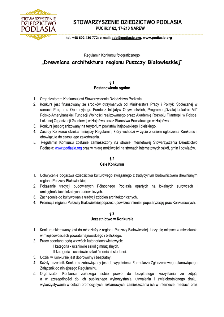 STOWARZYSZENIE DZIEDZICTWO PODLASIA PUCHŁY 62, 17-210 NAREW tel. +48 602 430 772; e-mail: [email protected], www.podlasie.org Regulamin Konkursu fotograficznego „Drewniana architektura regionu Puszczy Białowieskiej” §1 Postanowienia ogólne 1. Organizatorem Konkursu jest Stowarzyszenie Dziedzictwo Podlasia. 2. Konkurs jest finansowany ze środków otrzymanych od Ministerstwa Pracy i Polityki Społecznej w ramach Programu Operacyjnego Fundusz Inicjatyw Obywatelskich, Programu „Działaj Lokalnie VII” Polsko-Amerykańskiej Fundacji Wolności realizowanego przez Akademię Rozwoju Filantropii w Polsce, Lokalnej Organizacji Grantowej w Hajnówce oraz Starostwa Powiatowego w Hajnówce. 3. Konkurs jest organizowany na terytorium powiatów hajnowskiego i bielskiego. 4. Zasady Konkursu określa niniejszy Regulamin, który wchodzi w Ŝycie z dniem ogłoszenia Konkursu i obowiązuje do czasu jego zakończenia. 5. Regulamin Konkursu zostanie zamieszczony na stronie internetowej Stowarzyszenia Dziedzictwo Podlasia: www.podlasie.org oraz w miarę moŜliwości na stronach internetowych szkół, gmin i powiatów. §2 Cele Konkursu Uchwycenie bogactwa dziedzictwa kulturowego związanego z tradycyjnym budownictwem drewnianym regionu Puszczy Białowieskiej. 2. Pokazanie tradycji budowlanych Północnego Podlasia opartych na lokalnych surowcach i umiejętnościach lokalnych budowniczych. 3. Zachęcenie do kultywowania tradycji zdobień architektonicznych, 4. Promocja regionu Puszczy Białowieskiej poprzez upowszechnienie i popularyzację prac Konkursowych. 1. §3 Uczestnictwo w Konkursie 1. Konkurs skierowany jest do młodzieŜy z regionu Puszczy Białowieskiej. Liczy się miejsce zamieszkania w miejscowościach powiatu hajnowskiego i bielskiego. 2. Prace oceniane będą w dwóch kategoriach wiekowych: I kategoria - uczniowie szkół gimnazjalnych, II kategoria - uczniowie szkół średnich i studenci. 3. Udział w Konkursie jest dobrowolny i bezpłatny. 4. KaŜdy uczestnik Konkursu zobowiązany jest do wypełnienia Formularza Zgłoszeniowego stanowiącego Załącznik do niniejszego Regulaminu. 5. Organizator Konkursu zastrzega sobie prawo do bezpłatnego korzystania ze zdjęć, a w szczególności do ich publicznego wykorzystania, utrwalenia i zwielokrotnionego druku, wykorzystywania w celach promocyjnych, reklamowych, zamieszczania ich w Internecie, mediach oraz 6. 7. 8. 9. w innych formach utrwaleń nadających się do rozpowszechniania (np. nośniki magnetyczne, elektroniczne, optyczne, CD-ROM), wprowadzania do pamięci komputera, publicznego odtwarzania bez ograniczeń ilościowych, czasowych i terytorialnych. Przystąpienie do Konkursu jest równoznaczne z akceptacją przez uczestnika Regulaminu w całości. Uczestnik zobowiązuje się do przestrzegania określonych w nim zasad, jak równieŜ potwierdza, iŜ spełnia wszystkie warunki, które uprawniają go do udziału w Konkursie. Ostateczna interpretacja niniejszego Regulaminu naleŜy do Organizatora Konkursu. Sytuacje nieobjęte niniejszym regulaminem rozstrzyga Organizator Konkursu. Wszelkich informacji na temat Konkursu moŜna zasięgać pod numerem telefonu – 602 430 772 lub pisząc na adres mailowy - [email protected]. §4 Zasady Konkursu 1. Zdjęcia na Konkurs naleŜy przesłać pocztą na adres siedziby Stowarzyszenia Dziedzictwo Podlasia: Puchły 62, 17-210 Narew, w terminie do 15 listopada 2010r. Decydować będzie data stempla pocztowego. 2. Do złoŜonych prac naleŜy dołączyć wypełnioną Kartę Zgłoszenia, stanowiącą Załącznik do niniejszego Regulaminu. 3. Na Konkurs moŜna nadesłać maksymalnie 5 zdjęć w formie elektronicznej na płycie CD lub DVD w formacie JPG. DłuŜszy bok zdjęcia powinien mieć nie mniej niŜ 2400 pixeli. 4. Organizator ma prawo nie przyjąć do Konkursu prac nieujmujących tematu, zdjęć o niskiej jakości technicznej, przesłanych w złym formacie, oraz fotografii, które w inny sposób naruszają niniejszy Regulamin. 5. Do kaŜdej fotografii uczestnik zobowiązany jest dołączyć w formie pliku tekstowego następujące informacje: imię, nazwisko, wiek, adres zamieszkania, telefon kontaktowy, e-mail oraz tytuł fotografii. 6. Nadesłanie prac następuje na koszt uczestnika Konkursu. 7. Organizator nie zwraca nadesłanych prac. 8. Organizator nie ponosi odpowiedzialności za ewentualne zaginięcie lub uszkodzenie przesyłki. 9. Nie dopuszcza się prac będących efektem obróbki cyfrowej. 10. Do Konkursu nie mogą zostać zgłoszone fotografie, które zostały uprzednio nagrodzone w ramach innego Konkursu. §5 Komisja Konkursowa 1. Oceny nadesłanych prac dokona powołana przez Organizatora Komisja Konkursowa 2. Zadaniem Komisji Konkursowej jest: 1) kwalifikacja zgłoszonych fotografii do oceny , 2) ocena zgłoszonych fotografii, 3) przyznanie nagród. 3. Kryteriami oceny będą: 1) zgodność tematu pracy z tematyką Konkursu, 2) wartość artystyczna i techniczna wykonania zdjęć, 3) oryginalność podejścia do tematu, 4) kreatywność pracy. 2 §6 Laureaci i nagrody 1. W Konkursie w kaŜdej z dwóch kategorii wyłoniony zostanie laureat pierwszego, drugiego i trzeciego miejsca oraz po trzech wyróŜnionych. 2. Zwycięzcy w dwóch kategoriach oraz osoby wyróŜnione otrzymają nagrody rzeczowe: 1) laureat pierwszego miejsca – aparat cyfrowy o wartości około 1000 zł, 2) laureat drugiego miejsca – sprzęt multimedialny o wartości około 500 zł, 3) laureat trzeciego miejsca – sprzęt multimedialny o wartości około 300 zł, 4) osoby wyróŜnione – upominki o wartości około 100 zł. 3. Laureaci Konkursu i osoby wyróŜnione otrzymają pamiątkowe dyplomy. 4. Lista nagrodzonych osób zostanie opublikowana na stronie internetowej Stowarzyszenia Dziedzictwo Podlasia. 5. Nagrodzone oraz wyróŜnione osoby zostaną powiadomione o wynikach Konkursu pocztą elektroniczną i/lub telefonicznie w terminie do dnia 3 grudnia 2010 roku. 6. Uroczyste wręczenie nagród Laureatom odbę