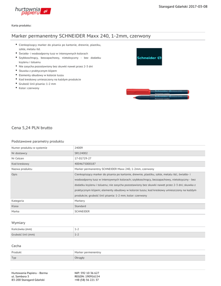 Starogard Gdański 2017-03-08 Karta produktu: Marker permanentny SCHNEIDER Maxx 240, 1-2mm, czerwony Cienkopiszący marker do pisania po kartonie, drewnie, plastiku, szkle, metalu itd. Światło- i wodoodporny tusz w intensywnych kolorach Szybkoschnący, bezzapachowy, nietoksyczny - bez dodatku ksylenu i toluenu Nie zasycha pozostawiony bez skuwki nawet przez 2-3 dni Skuwka z praktycznym klipem Elementy obudowy w kolorze tuszu Kod kreskowy umieszczony na każdym produkcie Grubość linii pisania: 1-2 mm Kolor: czerwony Cena 5,24 PLN brutto Podstawowe parametry produktu Numer produktu w systemie 24009 Nr dostawcy SR124002 Nr Celcen 17-01729-27 Kod kreskowy 4004675000187 Nazwa produktu Marker permanentny SCHNEIDER Maxx 240, 1-2mm, czerwony Opis Cienkopiszący marker do pisania po kartonie, drewnie, plastiku, szkle, metalu itd.; światło- i wodoodporny tusz w intensywnych kolorach; szybkoschnący, bezzapachowy, nietoksyczny - bez dodatku ksylenu i toluenu; nie zasycha pozostawiony bez skuwki nawet przez 2-3 dni; skuwka z praktycznym klipem; elementy obudowy w kolorze tuszu; kod kreskowy umieszczony na każdym produkcie; grubość linii pisania: 1-2 mm; kolor: czerwony Kategoria Markery Klasa Standard Marka SCHNEIDER Wymiary Końcówka (mm) 1-2 Grubość linii (mm) 1-2 Cecha Produkt Marker permenentny Typ Okrągły Hurtowania Papieru - Borma ul. Sambora 3 83-200 Starogard Gdański NIP: 592 10 36 627 REGON: 190916154 +48 (58) 56 221 37 Starogard Gdański 2017-03-08 Karta katalogowa produktu cd. Marker permanentny SCHNEIDER Maxx 240, 1-2mm, czerwony W ofercie od 2015-01 Rodzaj Do 72h bez skuwki Wspólny słownik zamówień CPV 30192125-3 Pisaki Certyfikaty Nowy produkt w ofercie Standard Hit Standard Kolor Kolor Czerwony Serdecznie zapraszamy do współpracy Hurtowania Papieru - Borma zespół. Hurtowania Papieru - Borma ul. Sambora 3 83-200 Starogard Gdański NIP: 592 10 36 627 REGON: 190916154 +48 (58) 56 221 37