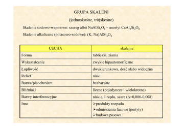 GRUPA SKALENI (jednoskośne, trójskośne) Skalenie sodowo-wapniowe: szereg albit NaAlSi3O8 – anortyt CaAl2Si2O8 Skalenie alkaliczne (potasowo-sodowe): (K, Na)AlSi3O8 CECHA skalenie Forma tabliczki, ziarna Wykształcenie zwykle hipautomorficzne Łupliwość dwukierunkowa, dość słabo widoczna Relief niski Barwa/pleochroizm bezbarwne Bliźniaki liczne (pojedyncze i wielokrotne) Barwy interferencyjne niskie, I rzędu, szare (Δ=0,006-0,008) Inne ¾produkty rozpadu ¾odmieszania fazowe (pertyty) ¾budowa pasowa GRUPA SKALENI (jednoskośne, trójskośne) Kryształ skalenia (bezbarwny), dwukierunkową łupliwością. z widoczna Kryształ skalenia (bezbarwny), z widoczna dwukierunkową łupliwością. Dwa polaryzatory, skrzyżowane. GRUPA SKALENI (jednoskośne, trójskośne) Przerosty pismowe w skaleniu. Dwa polaryzatory, skrzyżowane. Myrmekity. Dwa polaryzatory, skrzyżowane. GRUPA SKALENI (jednoskośne, trójskośne) Zbliźniaczenia polisyntetyczne w krysztale plagioklazu. Dwa polaryzatory, skrzyżowane. Zbliźniaczenie pojedyncze w krysztale skalenia alkalicznego. Dwa polaryzatory, skrzyżowane. GRUPA SKALENI (jednoskośne, trójskośne) Kryształ skalenia z przerostami pertytowymi. Dwa polaryzatory, skrzyżowane. Kryształy mikroklinu, z widoczną kratką bliźniaczą. Dwa polaryzatory, skrzyżowane. GRUPA SKALENI (jednoskośne, trójskośne) Budowa pasowa w krysztale plagioklazu. Dwa polaryzatory, skrzyżowane. GRUPA SKALENI (jednoskośne, trójskośne) Postępujący proces serycytyzacji skalenia. Postępujący proces serycytyzacji skalenia. Dwa polaryzatory, skrzyżowane. GRUPA SKALENI (jednoskośne, trójskośne) Postępujący proces serycytyzacji skalenia. Postępujący proces serycytyzacji skalenia. Dwa polaryzatory, skrzyżowane. MUSKOWIT - KAl2(Si3AlO10)(OH, F)2 (jednoskośny lub trygonalny) CECHA skalenie Forma blaszki, tabliczki (pseudoheksagonalne) Wykształcenie zwykle hipautomorficzny Łupliwość jednokierunkowa, doskonała Relief wysoki Barwa/pleochroizm bezbarwny Bliźniaki rzadkie Barwy interferencyjne II rzędu (Δ=0,036-0,049) Inne ¾serycyt-drobnołuseczkowa muskowitu odmiana MUSKOWIT - KAl2(Si3AlO10)(OH, F)2 (jednoskośny lub trygonalny) Blaszka bezbarwnego muskowitu (po lewej). Z prawej strony blaszka brunatnego biotytu. Blaszka bezbarwnego muskowitu (po lewej). Z prawej strony blaszka brunatnego biotytu. Dwa polaryzatory, skrzyżowane. MUSKOWIT - KAl2(Si3AlO10)(OH, F)2 (jednoskośny lub trygonalny) Blaszka bezbarwnego muskowitu. Blaszka bezbarwnego polaryzatory, skrzyżowane. muskowitu. Dwa