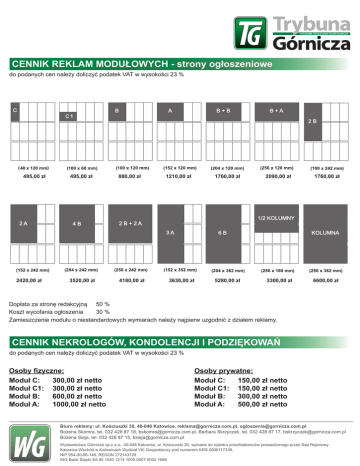 CENNIK REKLAM MODUŁOWYCH - strony ogłoszeniowe do podanych cen należy doliczyć podatek VAT w wysokości 23 % 1 495,00 zł 2420,00 zł 495,00 zł 880,00 zł 3520,00 zł 4180,00 zł 1210,00 zł 3630,00 zł 1760,00 zł 2090,00 zł 1760,00 zł 5280,00 zł 3300,00 zł 6600,00 zł Dopłata za stronę redakcyjną 50 % Koszt wycofania ogłoszenia 30 % Zamieszczenie modułu o niestandardowych wymiarach należy najpierw uzgodnić z działem reklamy. CENNIK NEKROLOGÓW, KONDOLENCJI I PODZIĘKOWAŃ do podanych cen należy doliczyć podatek VAT w wysokości 23 % Osoby fizyczne: Moduł C: 300,00 zł netto Moduł C1: 300,00 zł netto Moduł B: 600,00 zł netto Moduł A: 1000,00 zł netto Osoby prywatne: Moduł C: 150,00 zł netto Moduł C1: 150,00 zł netto Moduł B: 300,00 zł netto Moduł A: 500,00 zł netto Biuro reklamy: ul. Kościuszki 30, 40-048 Katowice, [email protected], [email protected] Bożena Skomra, tel. 032 428 87 18, [email protected], Barbara Skrzyczek, tel. 032 428 87 17, [email protected] Bożena Sieja, tel. 032 428 87 15, [email protected] Wydawnictwo Górnicze sp.z o.o., 40-048 Katowice, ul. Kościuszki 30, wpisane do rejestru przedsiębiorców prowadzonego przez Sąd Rejonowy Katowice-Wschód w Katowicach Wydział VIII Gospodarczy pod numerem KRS 0000117339, NIP 954-00-06-146, REGON 272143728 ING Bank Śląski SA 90 1050 1214 1000 0007 0002 1686 CENNIK OGŁOSZEŃ PRZETARGOWYCH CZARNO-BIAŁYCH do podanych cen należy doliczyć podatek VAT w wysokości 23 % Dopłata za stronę redakcyjną Dopłata za podmianę ogłoszenia wymagającego ponownego opracowania graficznego 50 % 30 % Koszt wycofania ogłoszenia 30 % Zamieszczenie modułu o niestandardowych wymiarach należy najpierw uzgodnić z działem reklamy. CENNIK REKLAM - strona pierwsza do podanych cen należy doliczyć podatek VAT w wysokości 23 % P1 P2 P3 P4 P5 (48 x 60 mm) 489,60 zł (100 x 60 mm) 1020,00 zł (152 x 60 mm) 1550,40 zł (204 x 60 mm) 2080,80 zł (256 x 60 mm) 2611,20 zł P6 P7 P8 P9 P10 (256 x 10 mm) 435,20 zł (256 x 20 mm) 870,40 zł (256 x 30 mm) 1305,60 zł (256 x 40 mm) 1740,80 zł (256 x 50 mm) 2176,00 zł Dopłata za reklamę pełnokolorową P11 (48 x 120 mm) 979,20 zł 30 % Biuro reklamy: ul. Kościuszki 30, 40-048 Katowice, [email protected], [email protected] Bożena Skomra, tel. 032 428 87 18, [email protected], Barbara Skrzyczek, tel. 032 428 87 17, [email protected] Bożena Sieja, tel. 032 428 87 15, [email protected] Wydawnictwo Górnicze sp.z o.o., 40-048 Katowice, ul. Kościuszki 30, wpisane do rejestru przedsiębiorców prowadzonego przez Sąd Rejonowy Katowice-Wschód w Katowicach Wydział VIII Gospodarczy pod numerem KRS 0000117339, NIP 954-00-06-146, REGON 272143728 ING Bank Śląski SA 90 1050 1214 1000 0007 0002 1686