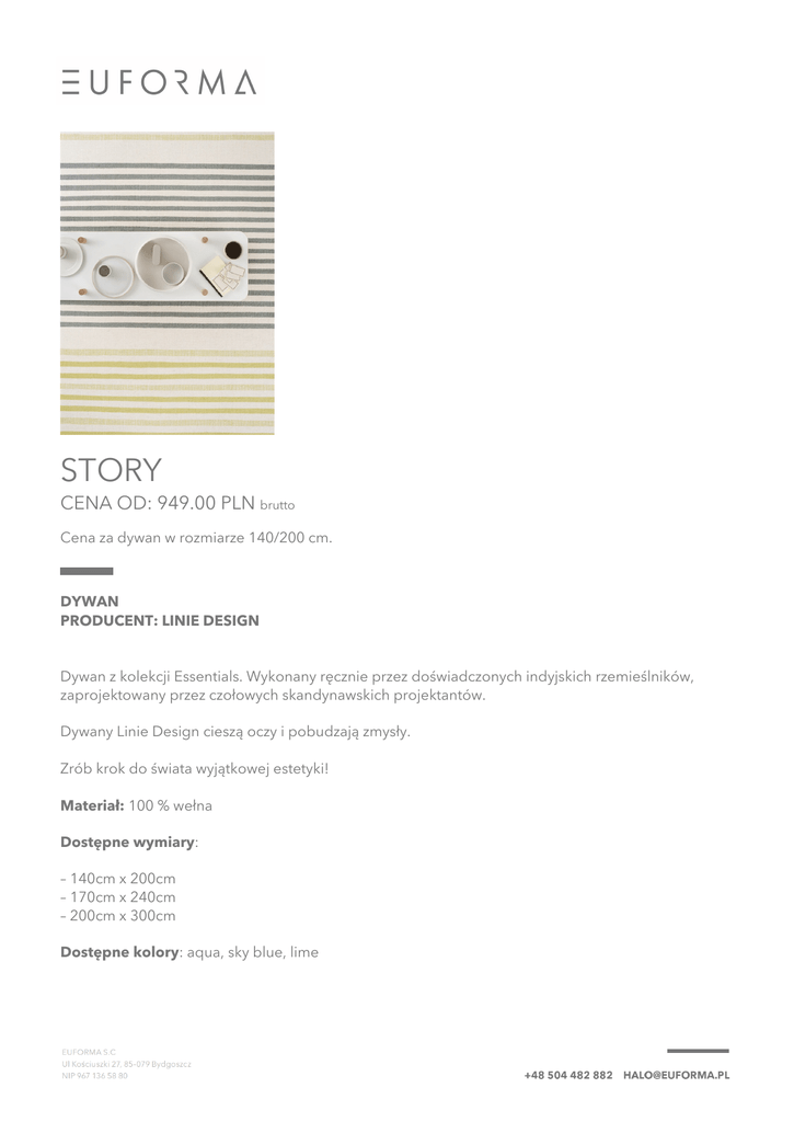STORY CENA OD: 949.00 PLN brutto Cena za dywan w rozmiarze 140/200 cm. DYWAN PRODUCENT: LINIE DESIGN Dywan z kolekcji Essentials. Wykonany ręcznie przez doświadczonych indyjskich rzemieślników, zaprojektowany przez czołowych skandynawskich projektantów. Dywany Linie Design cieszą oczy i pobudzają zmysły. Zrób krok do świata wyjątkowej estetyki! Materiał: 100 % wełna Dostępne wymiary: – 140cm x 200cm – 170cm x 240cm – 200cm x 300cm Dostępne kolory: aqua, sky blue, lime Powered by TCPDF (www.tcpdf.org)