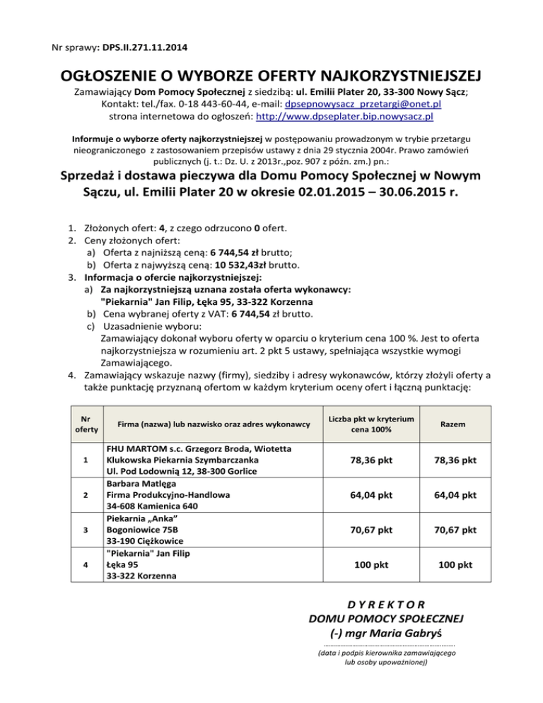 Nr sprawy: DPS.II.271.11.2014 OGŁOSZENIE O WYBORZE OFERTY NAJKORZYSTNIEJSZEJ Zamawiający Dom Pomocy Społecznej z siedzibą: ul. Emilii Plater 20, 33-300 Nowy Sącz; Kontakt: tel./fax. 0-18 443-60-44, e-mail: [email protected] strona internetowa do ogłoszeń: http://www.dpseplater.bip.nowysacz.pl Informuje o wyborze oferty najkorzystniejszej w postępowaniu prowadzonym w trybie przetargu nieograniczonego z zastosowaniem przepisów ustawy z dnia 29 stycznia 2004r. Prawo zamówień publicznych (j. t.: Dz. U. z 2013r.,poz. 907 z późn. zm.) pn.: Sprzedaż i dostawa pieczywa dla Domu Pomocy Społecznej w Nowym Sączu, ul. Emilii Plater 20 w okresie 02.01.2015 – 30.06.2015 r. 1. Złożonych ofert: 4, z czego odrzucono 0 ofert. 2. Ceny złożonych ofert: a) Oferta z najniższą ceną: 6 744,54 zł brutto; b) Oferta z najwyższą ceną: 10 532,43zł brutto. 3. Informacja o ofercie najkorzystniejszej: a) Za najkorzystniejszą uznana została oferta wykonawcy: "Piekarnia" Jan Filip, Łęka 95, 33-322 Korzenna b) Cena wybranej oferty z VAT: 6 744,54 zł brutto. c) Uzasadnienie wyboru: Zamawiający dokonał wyboru oferty w oparciu o kryterium cena 100 %. Jest to oferta najkorzystniejsza w rozumieniu art. 2 pkt 5 ustawy, spełniająca wszystkie wymogi Zamawiającego. 4. Zamawiający wskazuje nazwy (firmy), siedziby i adresy wykonawców, którzy złożyli oferty a także punktację przyznaną ofertom w każdym kryterium oceny ofert i łączną punktację: Nr oferty 1 2 3 4 Firma (nazwa) lub nazwisko oraz adres wykonawcy FHU MARTOM s.c. Grzegorz Broda, Wiotetta Klukowska Piekarnia Szymbarczanka Ul. Pod Lodownią 12, 38-300 Gorlice Barbara Matlęga Firma Produkcyjno-Handlowa 34-608 Kamienica 640 Piekarnia „Anka” Bogoniowice 75B 33-190 Ciężkowice "Piekarnia" Jan Filip Łęka 95 33-322 Korzenna Liczba pkt w kryterium cena 100% Razem 78,36 pkt 78,36 pkt 64,04 pkt 64,04 pkt 70,67 pkt 70,67 pkt 100 pkt 100 pkt DYREKTOR DOMU POMOCY SPOŁECZNEJ (-) mgr Maria Gabryś ……………………………………………………………..……. (data i podpis kierownika zamawiającego lub osoby upoważnionej)