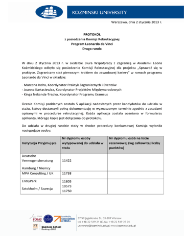 Warszawa, dnia 2 stycznia 2013 r. PROTOKÓŁ z posiedzenia Komisji Rekrutacyjnej Program Leonardo da Vinci Druga runda W dniu 2 stycznia 2013 r. w siedzibie Biura Współpracy z Zagranicą w Akademii Leona Koźmińskiego odbyło się posiedzenie Komisji Rekrutacyjnej dla projektu „Sprawdź się w praktyce. Zagraniczny staż pierwszym krokiem do zawodowej kariery” w ramach programu Leonardo da Vinci w składzie: - Marzena Indra, Koordynator Praktyk Zagranicznych i Eventów - Joanna Kartasiewicz, Koordynator Projektów Międzynarodowych - Kinga Nekanda-Trepka, Koordynator Programu Eramsus Ocenie Komisji poddanych zostało 5 aplikacji nadesłanych przez kandydatów do udziału w stażu, którzy dostarczyli pełną dokumentację w wyznaczonym terminie zgodnie z zasadami opisanymi w procedurze rekrutacyjnej. Każda aplikacja została oceniona w formularzu aplikanta, którego kopia jest dołączona do protokołu. Do udziału w drugiej rundzie staży w drodze procedury konkursowej Komisja wyłoniła następujące osoby: Instytucja Przyjmująca Deutsche Vermogensberatung Nr dyplomu osoby wytypowanej do udziału w stażu 11422 Hamburg / Niemcy MPA Consulting / UK 11738 EntryPark 11805 10573 11750 Sztokholm / Szwecja Nr dyplomu osób na liście rezerwowej (wg całkowitej liczby punktów) Aplikacje wytypowanych osób zostaną przekazane wybranym przez nie instytucjom przyjmującym. Ostateczna decyzja o przyjęciu na staż następuje po akceptacji kandydata przez partnerską instytucję przyjmującą, która w tym celu może wymagać udziału kandydata w rozmowie kwalifikacyjnej przeprowadzonej w drodze wideokonferencji w Akademii Leona Koźmińskiego. W przypadku odrzucenia przez instytucję oferującą staż kandydata wytypowanego w pierwszej kolejności, przekazane zostaną do oceny kandydatury osób z listy rezerwowej. Pełna lista rankingowa wraz z liczbą przyznanych punktów: Pozycja rankingowa Nr dyplomu Całkowita liczba punktów 1 11738 90 1 11805 90 2 11750 80 3 10573 70 4 11422 40 Instytucja przyjmująca wskazana w aplikacji