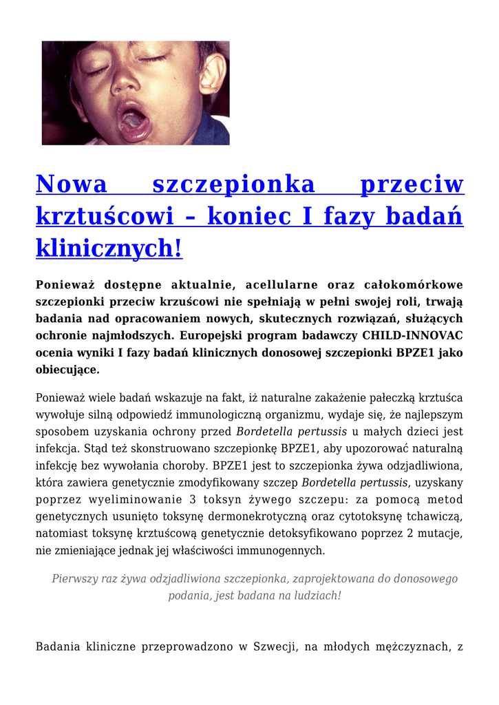Nowa szczepionka przeciw krztuścowi – koniec I fazy badań klinicznych! Ponieważ dostępne aktualnie, acellularne oraz całokomórkowe szczepionki przeciw krzuścowi nie spełniają w pełni swojej roli, trwają badania nad opracowaniem nowych, skutecznych rozwiązań, służących ochronie najmłodszych. Europejski program badawczy CHILD-INNOVAC ocenia wyniki I fazy badań klinicznych donosowej szczepionki BPZE1 jako obiecujące. Ponieważ wiele badań wskazuje na fakt, iż naturalne zakażenie pałeczką krztuśca wywołuje silną odpowiedź immunologiczną organizmu, wydaje się, że najlepszym sposobem uzyskania ochrony przed Bordetella pertussis u małych dzieci jest infekcja. Stąd też skonstruowano szczepionkę BPZE1, aby upozorować naturalną infekcję bez wywołania choroby. BPZE1 jest to szczepionka żywa odzjadliwiona, która zawiera genetycznie zmodyfikowany szczep Bordetella pertussis, uzyskany poprzez wyeliminowanie 3 toksyn żywego szczepu: za pomocą metod genetycznych usunięto toksynę dermonekrotyczną oraz cytotoksynę tchawiczą, natomiast toksynę krztuścową genetycznie detoksyfikowano poprzez 2 mutacje, nie zmieniające jednak jej właściwości immunogennych. Pierwszy raz żywa odzjadliwiona szczepionka, zaprojektowana do donosowego podania, jest badana na ludziach! Badania kliniczne przeprowadzono w Szwecji, na młodych mężczyznach, z wykorzystaniem podwójnej ślepej i placebo. Osobom badanym podano do każdego nozdrza 10^ 3 , 10^ 5 lub 10^ 7 jednostek tworzących kolonie w kroplach. Odpowiedź immunologiczna została oceniona po 6 miesiącach, natomiast kolonizacja nosogardła po 4 tygodniach od podania specyfiku. Głównym celem I fazy badań było określenie możliwych objawów ubocznych szczepionki. Uzyskane rezultaty pozwalają na stwierdzenie, że BPZE1 może być bezpiecznie stosowana u zdrowych dorosłych. Jest także w stanie przejściowo skolonizować nosogardło oraz aktywować odpowiedź immunologiczną organizmu do wytwarzania IgG u wszystkich skolonizowanych osób. Pierwszy raz żywa odzjadliwiona szczepionka, zaprojektowana do donosowego podania, jest badana na ludziach! Źródło: Wikimedia Commons, licencja CC0 Dalsze próby kliniczne dążą ku ustaleniu optymalnej dawki BPZE1. Niezbędne są również badania w młodszych grupach wiekowych. ** Krztusiec często jest błędnie traktowany jako dawno ‘zapomniana’ choroba. Dotyka on dziesiątek tysięcy osób, zabijając rocznie 300 tysięcy dzieci na całym świecie. Projekt CHILD-INNOVAC skupia się na zwalczeniu zagrożeń mikrobiologicznych układu oddechowego u dzieci: Bordetella pertussis oraz RSV (ang. respiratory syncytuial virus; wywołuje zapalenie oskrzelików u dzieci). Piśmiennictwo: Thorstensson R. Trollfors B., Al-Tawil N. et al. A Phase I Clinical Study of a Live Attenuated Bordetella pertussis Vaccine – BPZE1; A Single Centre, Double-Blind, Placebo-Controlled, Dose-Escalating Study of BPZE1 Given Intranasally to Healthy Adult Male Volunteers. PLOS ONE, 8 Jan 2014. Uszkodzony gen cukrzycy typu 2 przyczyną Naukowcy z Uniwersytetu Illinois w Chicago odkryli mutację odpowiadającą za hiperglikemię na czczo – jeden z głównych objawów cukrzycy typu 2. Kierownik mikrobiologii i immunologii na UIC, profesor Bellur S. Prabhakar udowodnił w swojej pracy, że uszkodzenie genu MADD przyczynia się do nieprawidłowego wydzielania insuliny z komórek beta trzustki. Na cukrzycę typu 2 choruje około 8% Amerykanów i ponad 266 mln ludzi na całym świecie. U zdrowych osób utrzymuje się stan równowagi między uwalnianiem insuliny z komórek beta trzustki, a poziomem glukozy we krwi. Jednak u osób z cukrzycą poziom cukru we krwi jest zbyt wysoki z powodu niewystarczającej ilości uwalnianej insuliny lub z powodu insulinooporności. Wcześniej zespół profesora Prabhakara pracował nad wyizolowaniem genów z ludzkich komórek beta trzustki, w tym genu MADD. Przebadanie zmienności genetycznej wśród tysięcy Europejczyków i Chińczyków pozwoliło na dostrzeżenie silnego związku pomiędzy mutacją w obrębie genu MADD a cukrzycą typu 2. Dla naukowców nie było jasne w jaki sposób mutacja w genie MADD przyczynia się do hiperglikemii oraz czy w jej powstawanie są zaangażowane również inne geny. Aby zbadać rolę badanej mutacji w cukrzycy, stworzono szczep myszy, którym usunięto z komórek beta trzustki gen MADD. U wszystkich osobników pozbawionych genu MADD zaobserwowano podwyższony poziom glukozy we krwi. Komórki beta trzustki produkowały insulinę, ale nie wydzielały jej do krwioobiegu. Pierwszy raz żywa odzjadliwiona szczepionka, zaprojektowana do donosowego podania, jest badana na ludziach! Źródło: Wikimedia Commons, licencja CC0 Odkrycie może być milowym krokiem w leczeniu cukrzycy typu 2. Naukowcy mają nadzieję na stworzenie leku, który umożliwiałby wydzielanie insuliny z uszkodzonych komórek beta trzustki. Piśmiennictwo: 1. Parmet S. Loss of function of a single gene linked to diabetes in mice. University of Illinois at Chicago, News Center, 3 Jan 2014. 2. Prabhakar S., Wang Y., Carr R. IG20/MADD Plays a Critical Role in GlucoseInduced Insulin Secretion. Diabetes, 30 Dec 2013. Parmet Doczekaliśmy się aktualizacji ludzkiego genomu Minęło już 12 lat od zakończenia Human Genome Project i od publikacji pierwszej „wersji” sekwencji nukleotydowej referencyjnego ludzkiego genomu. Od tego czasu stale wnoszone były poprawki, które korygowały błędy i wnosiły nowe informacje. Dzięki rozwojowi technik sekwencjonowania nowej generacji najnowsza, grudniowa poprawka w końcu przybliża nas do pełnego poznania naszego własnego DNA. Jeżeli korzystamy z zasobów NCBI, UCSC czy Ensembla, niekoniecznie jesteśmy świadomi tego, jak dynamicznie zmieniają się obecnie genomowe bazy danych. Pierwszy „build”, czyli złożona dzięki Human Genome Project sekwencja ludzkiego „genomu referencyjnego” opatrzona była numerem G