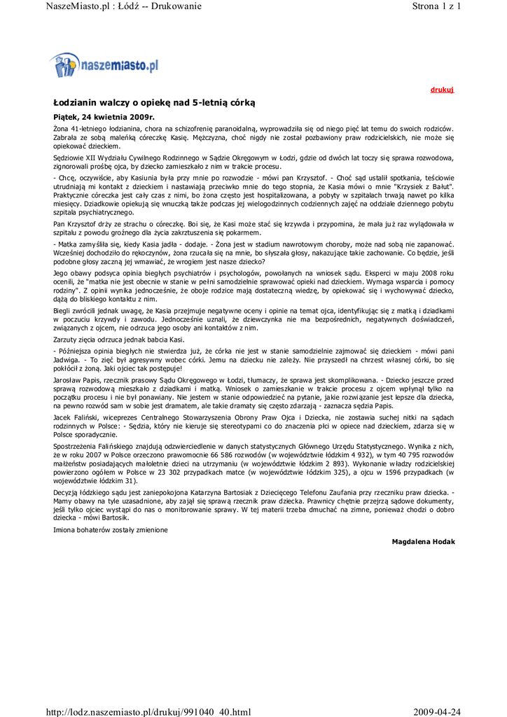 NaszeMiasto.pl : Łódź -- Drukowanie Strona 1 z 1 drukuj Łodzianin walczy o opiekę nad 5-letnią córką Piątek, 24 kwietnia 2009r. Żona 41-letniego łodzianina, chora na s chizofrenię paranoidalną, wyprowadziła się od nie go pięć lat temu do s woich rodziców. Zabrała ze sobą maleńką córeczkę Kasię. Mężczyzna, choć nigdy nie z ostał pozbawiony praw rodz icielskich, nie może się opiekowa ć dzieckiem. Sędziowie XII Wydzia łu Cywilnego R odzinnego w Sądzie Okręgowym w Łodzi, gdzie od dwóch lat toczy si ę sprawa rozwodowa, zignoro wali prośbę ojca, by dziecko zamieszkało z nim w trakcie procesu. - Chcę, oczywiście , aby Kasiunia by ła przy mnie po rozwodzie - mówi pan Krzysztof. - Choć sąd ustalił spotkania, teściowie utrudniają mi kontakt z dzieckiem i nastawiają przeciwko mnie do tego stopnia, że Kasia mówi o mnie "Krzysiek z Ba łut". Praktycznie córeczka jest ca ły czas z nimi, bo ż ona cz ęsto jest hospitalizowana, a pobyty w s zpitalach trwa ją nawet po kilka miesięcy. Dziadkowie opiekują się wnuczką tak że podczas jej wielogodzinnych codziennych zajęć na oddziale dziennego pobytu szpitala psychiatrycznego. Pan Krzysztof drży ze strachu o córeczkę. Boi się, że Kasi moż e stać się krz ywda i przypomina, że mała ju ż raz wylądowała w szpitalu z powodu groźnego dla życia zakrztusz enia się pokarmem. - Matka zamy śliła się, kiedy Kasia jadła - dodaje. - Żona jest w stadium nawrotowym choroby, może nad sobą nie zapanować. Wcze śniej dochodziło do rękoczynów, żona rzuca ła się na mnie, bo słysz ała głosy, nakazujące takie zachowanie. Co będzie, je śli podobne głosy zaczną jej wmawiać, że wrogiem jest nasze dziecko? Jego obawy podsyca opinia biegłych psychiatrów i psychologów, powołanych na wnios ek sądu. Eksperci w maju 2008 roku ocenili, że "matka nie jest obecnie w stanie w pe łni samodzielnie sprawować opieki nad dzieckiem. Wymaga wsparcia i pomocy rodziny". Z opinii wynika jednocze śnie, ż e oboje rodzice mają dostateczną wiedz ę, by opiekować się i wychowywa ć dziecko, dążą do bliskiego konta ktu z nim. Biegli zwrócili jednak uwagę, że Kasia przejmuje nega tywne oceny i opinie na temat ojca, identyfikując się z matk ą i dziadkami w poczuciu krzywdy i zawodu. Jednocze śnie uznali, że dziewczynka nie ma bezpośrednich, negatywnych doświadcz eń, związanych z ojcem, nie odrzuca jego os oby ani kontaktów z nim. Zarzuty zięcia odrzuca jednak babcia Kasi. - Późniejsza opinia biegłych nie stwierdza już, że córka nie jest w stanie samodzielnie zajmować się dzieckiem - mówi pani Jadwiga. - To zięć był agresywny wobe c córki. Jemu na dziecku nie zale ży. Nie przyszedł na chrz est własnej córki, bo się pokłócił z żoną. Jaki ojciec tak postępuje! Jarosław Pa pis, rze cznik prasowy Sądu Okręgowego w Łodzi, t łumaczy, że sprawa jest skomplikowana. - Dziecko jeszcze przed sprawą rozwodow ą mieszka ło z dziadkami i matką. Wniosek o zamies zkanie w trakcie procesu z ojcem wpłynął tylko na pocz ątku procesu i nie był ponawiany. Nie jestem w stanie odpowiedzie ć na pytanie, ja kie rozwi ązanie jes t lepsze dla dziecka, na pewno rozwód sam w sobie jest dramatem, ale takie dramaty się często zdarzają - zaznacza sędzia Papis. Jacek Faliński, wiceprezes Centralnego Stowarzyszenia Obrony Praw Ojca i Dziecka, nie zostawia suchej nitki na sądach rodzinnych w Polsce : - Sę dzia, który nie kieruje się stereotypami co do znaczenia płci w opiece nad dzieckiem, zdarza si ę w Polsce sporadycznie. Spostrzeżenia Fali ńskiego znajdują odzwie rciedlenie w danych statystycznych Głównego Urz ędu Statystycznego. Wynika z nich, że w roku 2007 w Polsce orzeczono prawomocnie 66 586 roz wodów (w województwie łódzkim 4 932), w tym 40 795 rozwodów ma łżeństw posiadających ma łoletnie dzieci na utrzymaniu (w województwie łódzkim 2 893). Wykonanie w ładzy rodzicielskiej powierzono ogółem w Polsce w 23 302 przypadkach matce (w województwie łódzkim 325), a ojcu w 1596 przypadkach (w województwie łódzkim 31). Decyz ją łódzkiego sądu jest zaniepokojona Kata rzyna Bartosiak z Dziecięcego Telefonu Zaufania przy rz eczniku praw dziecka. Mamy obawy na tyle uzasadnione, aby za jął się spraw ą rzecznik praw dziecka. Prawnicy chętnie przejrz ą sądowe dokumenty, jeśli tylko ojciec wyst ąpi do nas o monitorowanie sprawy. W tej materii trze ba dmuchać na zimne, poniewa ż chodzi o dobro dziecka - mówi Bartos ik. Imiona bohate rów zos ta ły zmienione Magdalena Hodak http://lodz.naszemiasto.pl/drukuj/991040_40.html 2009-04-24