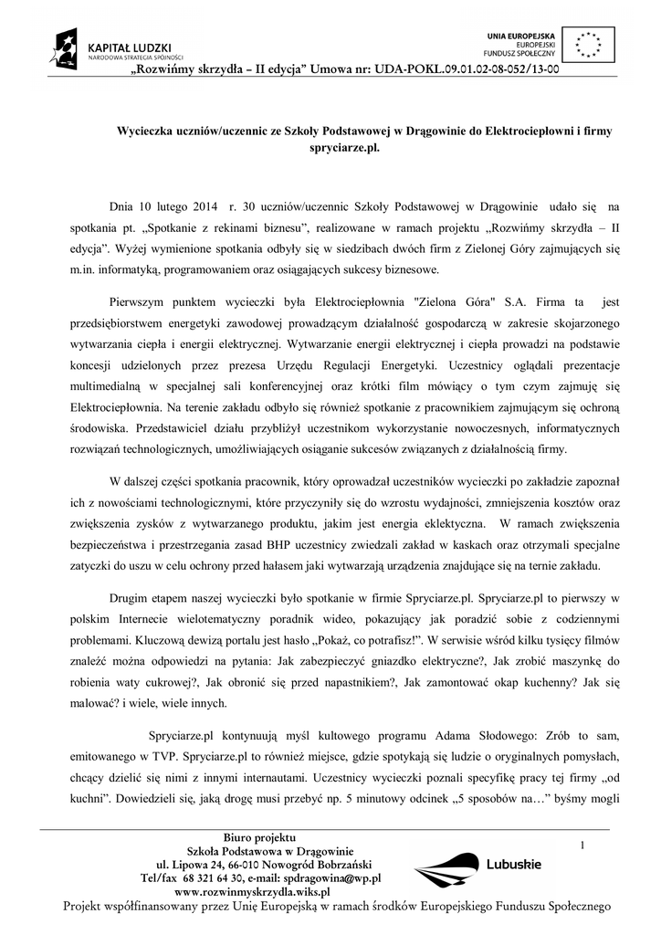 „Rozwińmy skrzydła – II edycja” Umowa nr: UDA-POKL.09.01.02-08-052/13-00 Wycieczka uczniów/uczennic ze Szkoły Podstawowej w Drągowinie do Elektrociepłowni i firmy spryciarze.pl. Dnia 10 lutego 2014 r. 30 uczniów/uczennic Szkoły Podstawowej w Drągowinie udało się na spotkania pt. „Spotkanie z rekinami biznesu”, realizowane w ramach projektu „Rozwińmy skrzydła – II edycja”. Wyżej wymienione spotkania odbyły się w siedzibach dwóch firm z Zielonej Góry zajmujących się m.in. informatyką, programowaniem oraz osiągających sukcesy biznesowe. Pierwszym punktem wycieczki była Elektrociepłownia "Zielona Góra" S.A. Firma ta jest przedsiębiorstwem energetyki zawodowej prowadzącym działalność gospodarczą w zakresie skojarzonego wytwarzania ciepła i energii elektrycznej. Wytwarzanie energii elektrycznej i ciepła prowadzi na podstawie koncesji udzielonych przez prezesa Urzędu Regulacji Energetyki. Uczestnicy oglądali prezentacje multimedialną w specjalnej sali konferencyjnej oraz krótki film mówiący o tym czym zajmuję się Elektrociepłownia. Na terenie zakładu odbyło się również spotkanie z pracownikiem zajmującym się ochroną środowiska. Przedstawiciel działu przybliżył uczestnikom wykorzystanie nowoczesnych, informatycznych rozwiązań technologicznych, umożliwiających osiąganie sukcesów związanych z działalnością firmy. W dalszej części spotkania pracownik, który oprowadzał uczestników wycieczki po zakładzie zapoznał ich z nowościami technologicznymi, które przyczyniły się do wzrostu wydajności, zmniejszenia kosztów oraz zwiększenia zysków z wytwarzanego produktu, jakim jest energia eklektyczna. W ramach zwiększenia bezpieczeństwa i przestrzegania zasad BHP uczestnicy zwiedzali zakład w kaskach oraz otrzymali specjalne zatyczki do uszu w celu ochrony przed hałasem jaki wytwarzają urządzenia znajdujące się na ternie zakładu. Drugim etapem naszej wycieczki było spotkanie w firmie Spryciarze.pl. Spryciarze.pl to pierwszy w polskim Internecie wielotematyczny poradnik wideo, pokazujący jak poradzić sobie z codziennymi problemami. Kluczową dewizą portalu jest hasło „Pokaż, co potrafisz!”. W serwisie wśród kilku tysięcy filmów znaleźć można odpowiedzi na pytania: Jak zabezpieczyć gniazdko elektryczne?, Jak zrobić maszynkę do robienia waty cukrowej?, Jak obronić się przed napastnikiem?, Jak zamontować okap kuchenny? Jak się malować? i wiele, wiele innych. Spryciarze.pl kontynuują myśl kultowego programu Adama Słodowego: Zrób to sam, emitowanego w TVP. Spryciarze.pl to również miejsce, gdzie spotykają się ludzie o oryginalnych pomysłach, chcący dzielić się nimi z innymi internautami. Uczestnicy wycieczki poznali specyfikę pracy tej firmy „od kuchni”. Dowiedzieli się, jaką drogę musi przebyć np. 5 minutowy odcinek „5 sposobów na…” byśmy mogli Biuro projektu Szkoła Podstawowa w Drągowinie ul. Lipowa 24, 66-010 Nowogród Bobrzański Tel/fax 68 321 64 30, e-mail: [email protected] www.rozwinmyskrzydla.wiks.pl 1 Projekt współfinansowany przez Unię Europejską w ramach środków Europejskiego Funduszu Społecznego „Rozwińmy skrzydła – II edycja” Umowa nr: UDA-POKL.09.01.02-08-052/13-00 oglądać go na portalu internetowym. Uczestnicy dowiedzieli się, że o wyjątkowości portalu Spryciarze.pl zadecydowali przede wszystkim internauci, których liczba stale rośnie. Statystyki wykazują spore zainteresowanie serwisem, długi czas spędzony w witrynie oraz bardzo satysfakcjonującą z perspektywy reklamowej liczbę odsłon. Pomysł na portal internetowy Spryciarze.pl określony został, jako „przełomowy” na łamach dziennika Rzeczpospolita, tuż po wygraniu dziesiątej edycji spotkania branży internetowej - Poznańskiego Barcampu. Zwycięstwo to oraz spore zainteresowanie ze strony mediów (Spryciarze.pl gościli m.in. w porannych programach TVP1 i TVP2 oraz w audycji Uwaga! TVN, w niedzielny wieczór, tuż przed samym Tańcem z gwiazdami, o portalu pisały również ogólnopolskie gazety: Gazeta Wyborcza, Polska The Times, Rzeczpospolita, Metro czy Polityka), przyczyniły się do pozyskania finansowania na dalszy rozwój projektu. Dzięki wiedzy informatycznej, zaangażowaniu oraz pomysłowi na życie założycieli twórców firmy spryciarze.pl, z dnia na dzień rozrasta się ona stosując coraz to nowsze technologie informatyczne przy tworzeniu kolejnych odcinków. Uczestnicy spotkań z zaciekawieniem słuchali informacji o osiągnięciach poszczególnych firm oraz o tym, że warto w życiu uczyć się i mieć jasno sprecyzowane plany, które należy kolejno realizować. Po dwóch spotkaniach uczestnicy wraz z opiekunami (30 uczestników i 3 opiekunów) udali się na posiłek. Transport, opiekę oraz posiłek uczestnicy spotkań otrzymali nieodpłatnie, bowiem są one finansowane z projektu „Rozwińmy skrzydła – II edycja”. Projekt jest współfinasowany przez Unię Europejską w ramach środków Europejskiego Funduszu Społecznego. Biuro projektu Szkoła Podstawowa w Drągowinie ul. Lipowa 24, 66-010 Nowogród Bobrzański Tel/fax 68 321 64 30, e-mail: [email protected] www.rozwinmyskrzydla.wiks.pl 2 Projekt współfinansowany przez Unię Europejską w ramach środków Europejskiego Funduszu Społecznego