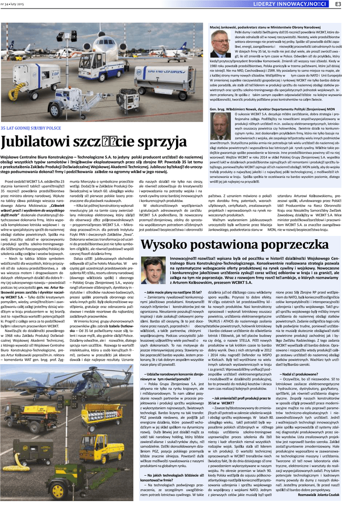 LIDERZY INNOWACYJNOŚCI nr 34•luty 2015 E3 Maciej Jankowski, podsekretarz stanu w Ministerstwie Obrony Narodowej Pełni dumy i radości świętujemy dziś 35 rocznicę powołania WCBKT, które doskonale odnalazło się w nowej rzeczywistości. Niestety, wiele przedsiębiorstw sektora obronnego nie przetrwało tej próby. Spółce się powiodło dzięki zapałowi, energii, zaangażowaniu i niezwykłej pracowitości zatrudnionych tu osób W dziejach frmy 35 lat, to może nie jest zbyt wiele, ale proszę zwrócić uwa gę, ile się zmieniło w tym czasie w Polsce. Odwołam się do przykładu, który kiedyś przytoczył prezydent Bronisław Komorowski. Zmienili się wszyscy nasi sąsiedzi. Kiedy w 1980 roku powstało przedsiębiorstwo, Polska graniczyła w trzema państwami, które już dzisiaj nie istnieją. Nie ma NRD, Czechosłowacji i ZSRR. My posiadamy to samo miejsce na mapie, ale z każdej strony mamy nowych sąsiadów. Wstąpiliśmy w tym czasie do NATO i Unii Europejskie W zmienionej zupełnie rzeczywistości gospodarczej i rynkowej WCBKT nie tylko bardzo dobrze sobie poradziło, ale stało się też liderem w produkcji sprzętu do naziemnej obsługi statków powietrznych oraz sprzętu szkolno-treningowego dla specjalistycznych jednostek wojskowych. Jestem przekonany, że spółka z takim samym zapałem odpowiadać będzie na kolejne wyzwania współczesności, tworząc produkty pożądane przez kontrahentów na całym świecie. 35 LAT GODNEJ SŁUŻBY POLSCE Jubilatowi szczęście sprzyja Wojskowe Centralne Biuro Konstrukcyjno – Technologiczne S.A. to jedyny polski producent urządzeń do naziemnej obsługi wszystkich typów samolotów i śmigłowców eksploatowanych przez siły zbrojne RP. Powstało 35 lat temu z przekształcenia Zakładu Produkcji Doświadczalnej Wojskowej Akademii Technicznej. Jubileusz był okazją do uroczystego podsumowania dokonań frmy i podziękowania załodze na ogromny wkład w jego rozwój. Przed siedzibą WCBKT S.A. odsłonięto 23 stycznia kamienną tablicę upamiętniającą 35 rocznicę powołania przedsiębiorstwa przez ministra obrony narodowej. Wykute na tablicy słowa polskiego wieszcza narodowego Adama Mickiewicza „Człowiek własną pracą i wysileniem do wszystkiego dojść może” doskonale charakteryzują dotychczasowe dokonania frmy, która wyposaża kompleksowo lotniska wojskowe i cywilne w specjalistyczny sprzęt do naziemnej obsługi statków powietrznych. Spółka ma swój znaczący udział w opracowywaniu i produkcji sprzętu szkolno-treningowego dla Sił Zbrojnych Rzeczpospolitej Polskiej do szkolenia załóg czołgów i wozów bojowych. – Niech ta tablica będzie symbolem wdzięczności dla wszystkich, którzy przyczynili się do sukcesu przedsiębiorstwa, a sło wa wieszcza motem i drogowskazem do dalszych efektywnych działań dla dobra fr my i jej sukcesywnego rozwoju – powiedział podczas tej uroczystości gen. rez. Artur Kołosowski prezes zarządu i dyrektor naczelny WCBKT S.A. – Tylko dzięki kreatywnym pomysłom, wiedzy, umiejętnościom i zaangażowaniu całej załogi jesteśmy dzisiaj wiodącym w kraju producentem w tej branży. Jest to największa wartość i potencjał spółki. Pragnę z całego serca za to podziękować byłym i obecnym pracownikom WCBKT. Nawiązując do działalności powołanego w 1968 roku Zakładu Produkcji Doświadczalnej Wojskowej Akademii Technicznej, z którego wywodzi się Wojskowe Centralne Biuro Konstrukcyjno-Technologiczne, prezes Artur Kołosowski poprosił m.in. rektora – komendanta WAT gen. bryg. prof. Zyg- munta Mierczyka o symboliczne przecięcie wstęgi. Dodał, że w Zakładzie Produkcji Doświadczalnej w latach 60. ubiegłego wieku narodziły się pierwsze polskie lasery przeznaczone dla placówek naukowych. – Kilka lat później konstruktorzy wykonali rewolucyjny jak na tamte czasy zwierciadlany mikroskop elektronowy, który służył do obserwacji złącz półprzewodnikowych – przypomniał prezes WCBKT S.A. – Mikroskop pracował m.in. dla potrzeb Instytutu Fizyki PAN i ówczesnych Zakładów „Tewa”. Dokonana wówczas transformacja od uczelni do przedsiębiorstwa jest nie tylko symbolem ciągłości, ale również podstawą współczesnej flozofi działania frmy. Dalsza część jubileuszowych obchodów odbywała się już w hotelu Mazurkas. W uro czystej gali uczestniczyli przedstawiciele prezydenta RP, rządu, resortu obrony narodowej (dawnego właściciela spółki) i obecnego – Polskiej Grupy Zbrojeniowej S.A., wysocy rangą ofcerowie sił zbrojnych, dyrektorzy in stytutów i ośrodków naukowo-badawczych, prezesi spółek przemysłu obronnego oraz wielu innych gości. Były okolicznościowe wystąpienia, gratulacje oraz odznaczenia państwowe i medale resortowe dla najbardziej zasłużonych pracowników. W imieniu licznej grupy uhonorowanych pracowników głos zabrała Izabela Dutkowska – Od 35 lat poświęcamy nasze siły, talent i nasze myśli, aby godnie służyć Polsce. Działamy odważnie, ale i rozważnie, dlatego sprzyja nam szczęście. Rozwaga to wartość intelektualna, która u osób kierujących fr mą, zarówno w przeszłości jak oibecnie dawała i daje najlepsze rezultaty. Uznanie dla naszych działań nie tylko nas cieszy, ale również zobowiązuje do kreatywności i wprowadzania na potrzeby wojska i na rynek cywilny coraz bardziej innowacyjnych i konkurencyjnych produktów. W okolicznościowych wystąpieniach i gratulacjach adresowanych do zarządu WCBKT S.A podkreślano, że nowoczesny przemysł zbrojeniowy, zdolny do sprostania współczesnym potrzebom sił zbrojnych jest podstawą bezpieczeństwa i obronności Gen. bryg. Włodzimierz Nowak, dyrektor Departamentu Polityki Zbrojeniowej MON O sukcesie WCBKT S.A. decyduje mądre zarządzanie, dobra strategia i profesjonalna załoga. Podążający na nowościami zespół wyspecjalizowany w produkcji różnych urządzeń m.in. zasilaczy elektroenergetycznych, lotniskowych osuszaczy 