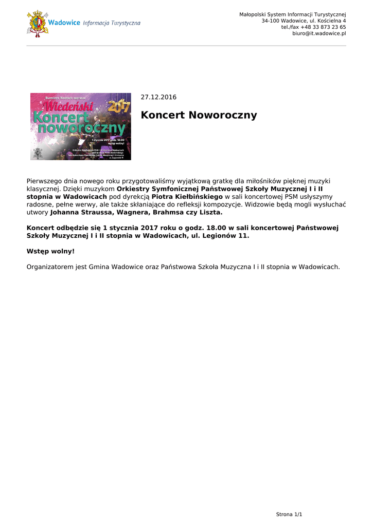 Małopolski System Informacji Turystycznej 34-100 Wadowice, ul. Kościelna 4 tel./fax +48 33 873 23 65 [email protected] 27.12.2016 Koncert Noworoczny Pierwszego dnia nowego roku przygotowaliśmy wyjątkową gratkę dla miłośników pięknej muzyki klasycznej. Dzięki muzykom Orkiestry Symfonicznej Państwowej Szkoły Muzycznej I i II stopnia w Wadowicach pod dyrekcją Piotra Kiełbińskiego w sali koncertowej PSM usłyszymy radosne, pełne werwy, ale także skłaniające do refleksji kompozycje. Widzowie będą mogli wysłuchać utwory Johanna Straussa, Wagnera, Brahmsa czy Liszta. Koncert odbędzie się 1 stycznia 2017 roku o godz. 18.00 w sali koncertowej Państwowej Szkoły Muzycznej I i II stopnia w Wadowicach, ul. Legionów 11. Wstęp wolny! Organizatorem jest Gmina Wadowice oraz Państwowa Szkoła Muzyczna I i II stopnia w Wadowicach. Strona 1/1 Powered by TCPDF (www.tcpdf.org)