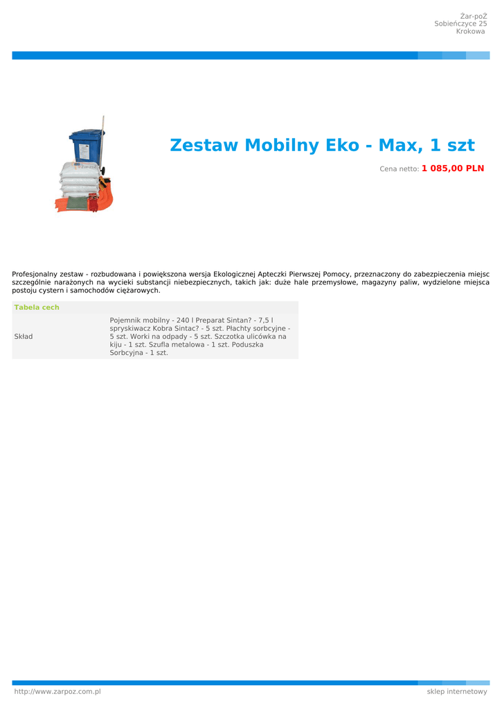 Żar-poŻ Sobieńczyce 25 Krokowa Zestaw Mobilny Eko - Max, 1 szt Cena netto: 1 085,00 PLN Profesjonalny zestaw - rozbudowana i powiększona wersja Ekologicznej Apteczki Pierwszej Pomocy, przeznaczony do zabezpieczenia miejsc szczególnie narażonych na wycieki substancji niebezpiecznych, takich jak: duże hale przemysłowe, magazyny paliw, wydzielone miejsca postoju cystern i samochodów ciężarowych. Tabela cech Skład http://www.zarpoz.com.pl Pojemnik mobilny - 240 l Preparat Sintan? - 7,5 l spryskiwacz Kobra Sintac? - 5 szt. Płachty sorbcyjne 5 szt. Worki na odpady - 5 szt. Szczotka ulicówka na kiju - 1 szt. Szufla metalowa - 1 szt. Poduszka Sorbcyjna - 1 szt. sklep internetowy