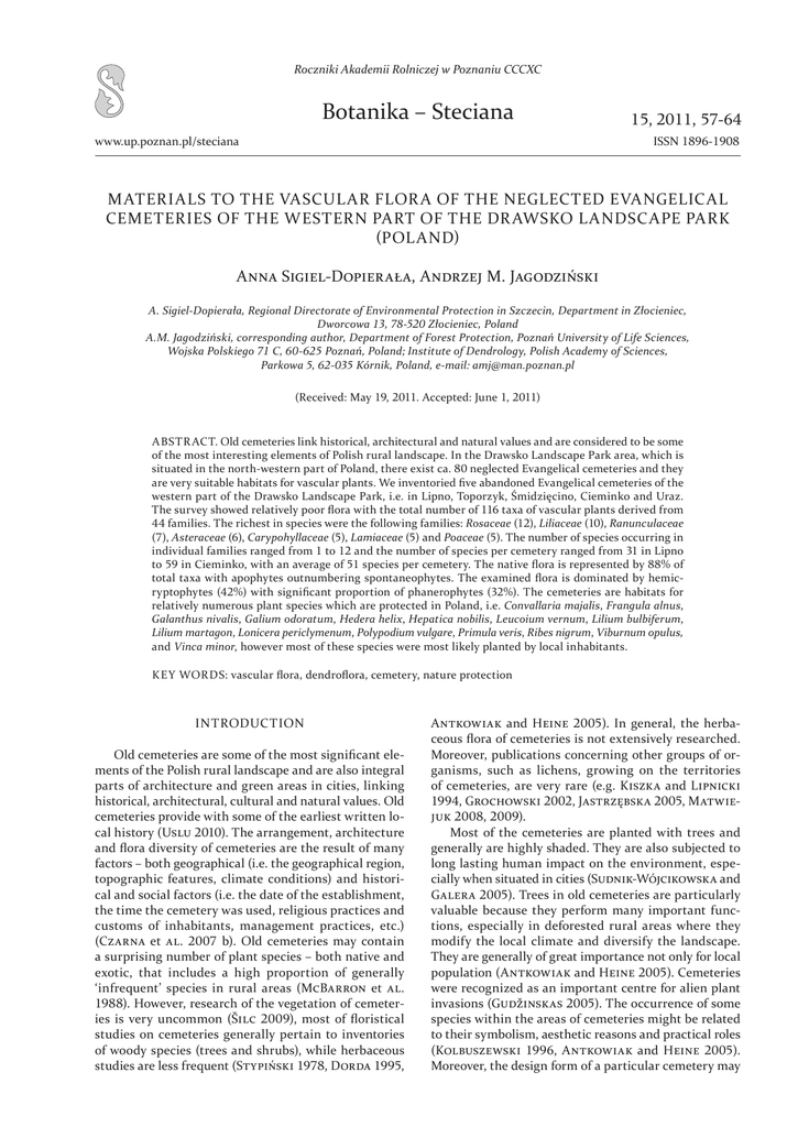 Roczniki Akademii Rolniczej w Poznaniu CCCXC Botanika – Steciana , www.up.poznan.pl/steciana , ISSN - MATERIALS TO THE VASCUL AR FLOR A OF THE NEGLECTED EVANGELICAL CEMETERIES OF THE WESTERN PART OF THE DR AWSKO L ANDSCAPE PARK POL AND ANNA SIGIEL-DOPIERAŁA, ANDRZEJ M. JAGODZIŃSKI A. Sigiel-Dopierała, Regional Directorate of Environmental Protection in Szczecin, Department in Złocieniec, Dworcowa , Złocieniec, Poland A.M. Jagodziński, corresponding author, Department of Forest Protection, Poznań University of Life Sciences, Wojska Polskiego C, Poznań, Poland; Institute of Dendrology, Polish Academy of Sciences, Parkowa , Kórnik, Poland, e-mail: [email protected] (Received: May , . Accepted: June , ) ABSTR ACT. Old cemeteries link historical, architectural and natural values and are considered to be some of the most interesting elements of Polish rural landscape. In the Drawsko Landscape Park area, which is situated in the north-western part of Poland, there exist ca. neglected Evangelical cemeteries and they are very suitable habitats for vascular plants. We inventoried five abandoned Evangelical cemeteries of the western part of the Drawsko Landscape Park, i.e. in Lipno, Toporzyk, Śmidzięcino, Cieminko and Uraz. The survey showed relatively poor flora with the total number of taxa of vascular plants derived from families. The richest in species were the following families: Rosaceae ( ), Liliaceae ( ), Ranunculaceae ( ), Asteraceae ( ), Carypohyllaceae ( ), Lamiaceae ( ) and Poaceae ( ). The number of species occurring in individual families ranged from to and the number of species per cemetery ranged from in Lipno to in Cieminko, with an average of species per cemetery. The native flora is represented by % of total taxa with apophytes outnumbering spontaneophytes. The examined flora is dominated by hemicryptophytes ( %) with significant proportion of phanerophytes ( %). The cemeteries are habitats for relatively numerous plant species which are protected in Poland, i.e. Convallaria majalis, Frangula alnus, Galanthus nivalis, Galium odoratum, Hedera helix, Hepatica nobilis, Leucoium vernum, Lilium bulbiferum, Lilium martagon, Lonicera periclymenum, Polypodium vulgare, Primula veris, Ribes nigrum, Viburnum opulus, and Vinca minor, however most of these species were most likely planted by local inhabitants. KE Y WOR DS: vascular flora, dendroflora, cemetery, nature protection INTRODUCTION Old cemeteries are some of the most significant elements of the Polish rural landscape and are also integral parts of architecture and green areas in cities, linking historical, architectural, cultural and natural values. Old cemeteries provide with some of the earliest written local history (USLU ). The arrangement, architecture and flora diversity of cemeteries are the result of many factors – both geographical (i.e. the geographical region, topographic features, climate conditions) and historical and social factors (i.e. the date of the establishment, the time the cemetery was used, religious practices and customs of inhabitants, management practices, etc.) (CZARNA et AL. b). Old cemeteries may contain a surprising number of plant species – both native and exotic, that includes a high proportion of generally ‘infrequent’ species in rural areas (MCBARRON et AL. ). However, research of the vegetation of cemeteries is very uncommon (ŠILC ), most of floristical studies on cemeteries generally pertain to inventories of woody species (trees and shrubs), while herbaceous studies are less frequent (STYPIŃSKI , DORDA , ANTKOWIAK and HEINE ). In general, the herbaceous flora of cemeteries is not extensively researched. Moreover, publications concerning other groups of organisms, such as lichens, growing on the territories of cemeteries, are very rare (e.g. KISZKA and LIPNICKI , GROCHOWSKI , JASTRZĘBSKA , MATWIEJUK , ). Most of the cemeteries are planted with trees and generally are highly shaded. They are also subjected to long lasting human impact on the environment, especially when situated in cities (SUDNIK-WÓJCIKOWSKA and GALERA ). Trees in old cemeteries are particularly valuable because they perform many important functions, especially in deforested rural areas where they modify the local climate and diversify the landscape. They are generally of great importance not only for local population (ANTKOWIAK and HEINE ). Cemeteries were recognized as an important centre for alien plant invasions (GUDŽINSKAS ). The occurrence of some species within the areas of cemeteries might be related to their symbolism, aesthetic reasons and practical roles (KOLBUSZEWSKI , ANTKOWIAK and HEINE ). Moreover, the design form of a particular cemetery may A. Sigiel-Dopierała, A.M. Jagodziński be also determined by the surface features of the surrounding area (CZARNA et AL. a). According to CZARNA ( ) cemeteries may also play an important role as refuge for native plant species. There are thousand cemeteries (both municipal and religious) in Poland and they cover from to thousands ha of land (SICIŃSKI ). After the Second World War some old Evangelical cemeteries, especially in the cities, were taken over by Catholics and converted into their own needs; however, some of them were destroyed and converted into green areas and parks. The cemeteries situated in small towns and villages or in their vicinities were often plundered for valuable objects. Moreover, elements of gravestones were sometimes used by local inhabitants as building material on farms. However, the old cemeteries, even when destroyed, are still very interesting from many points of view. In the Drawsko Landscape Park area, which is situated in the north-western part of Poland (West Pomeranian Voivodeship), there exist ca. abandoned cemeteries and most of them are Evangelical cemeteries. They have never been studied as habitats for vascular plants. Thus, the aim of our study was to determine the list of vascular plant species in the most va