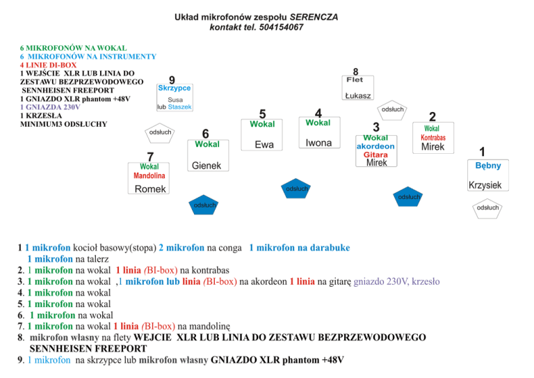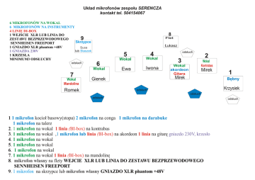 Uk³ad mikrofonów zespo³u SERENCZA kontakt tel. 504154067 6 MIKROFONÓW NA WOKAL 6 MIKROFONÓW NA INSTRUMENTY 4 LINIE DI-BOX 1 WEJŒCIE XLR LUB LINIA DO 9 ZESTAWU BEZPRZEWODOWEGO Skrzypce SENNHEISEN FREEPORT 1 GNIAZDO XLR phantom +48V Susa lub Staszek 1 GNIAZDA 230V 1 KRZES£A MINIMUM3 ODS£UCHY ods³uch 8 Flet £ukasz 5 Wokal 7 Wokal Mandolina Wokal Wokal Ewa Iwona 6 3 2 Wokal Kontrabas Wokal akordeon Gitara Mirek Mirek Gienek Romek ods³uch 4 1 Bêbny Krzysiek ods³uch ods³uch ods³uch 1 1 mikrofon kocio³ basowy(stopa) 2 mikrofon na conga 1 mikrofon na darabuke 1 mikrofon na talerz 2. 1 mikrofon na wokal 1 linia (BI-box) na kontrabas 3. 1 mikrofon na wokal ,1 mikrofon lub linia (BI-box) na akordeon 1 linia na gitarê gniazdo 230V, krzes³o 4. 1 mikrofon na wokal 5. 1 mikrofon na wokal 6. 1 mikrofon na wokal 7. 1 mikrofon na wokal 1 linia (BI-box) na mandolinê 8. mikrofon w³asny na flety WEJCIE XLR LUB LINIA DO ZESTAWU BEZPRZEWODOWEGO SENNHEISEN FREEPORT 9. 1 mikrofon na skrzypce lub mikrofon w³asny GNIAZDO XLR phantom +48V ods³uch