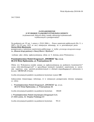 Wola Mysłowska 2010-06-30 341/7/2010 ZAWIADOMIENIE O WYBORZE NAJKORZYSTNIEJSZEJ OFERTY (wykonawcach, których oferty zostały odrzucone/wykonawcach wykluczonych z postępowania)* Na podstawie art. 92 ust. 1 ustawy z 29.01.2004 r. – Prawo zamówień publicznych (Dz. U. z 2007 r. Nr 223, poz. 1655 ze zm.) niniejszym informuję, że w prowadzonym przez Gminę Wola Mysłowska postępowaniu o udzielenie zamówienia publicznego w trybie przetargu nieograniczonego na „Remont drogi gminnej w Starej Hucie i Mysłowie”. wybrano jako ofertę najkorzystniejszą ofertę nr 1 złożoną przez Wykonawcę Przedsiębiorstwo Robót Drogowych „DROMOS” Sp. z o.o. 08-410 Wola Rębkowska, ul. Przemysłowa 45 Oferta ww. Wykonawcy została uznana za najkorzystniejszą na podstawie kryterium/ów* oceny ofert określonego/ych* w specyfikacji istotnych warunków zamówienia, tj. zawierała najniższa cenę spośród przedstawionych w ofertach niepodlegających odrzuceniu w kwocie 130 927,35 zł brutto Liczba otrzymanych punktów na podstawie kryterium wynosi 100 Jednocześnie Zamawiający informuje, iż w niniejszym postępowaniu złożono następujące oferty 1. Przedsiębiorstwo Robót Drogowych „DROMOS” sp. z o.o. 08-410 Wola Rębkowska, ul. Przemysłowa 45 Liczba otrzymanych punktów na podstawie kryterium 100,00 2. Przedsiębiorstwo Robót inżynieryjno-Drogowych S.A. 21-400 Łuków, Al. Wojska Polskiego 61 Liczba otrzymanych punktów na podstawie kryterium 99,14 Jednocześnie Zamawiający zawiadamia, że w trakcie niniejszego postępowania przetargowego żadna oferta nie została odrzucona oraz nie wykluczono żadnego Wykonawcy. ................................................................................................... (podpis Kierownika Zamawiającego lub osoby przez niego upoważnionej) Otrzymują: 1. Przeds. Robót Drogowych „DROMOS” sp. z o.o. 08-410 Wola Rębkowska, ul. Przemysłowa 45 2. Przedsiębiorstwo Robót inżynieryjno-Drogowych S.A. 21-400 Łuków, Al. Wojska Polskiego 61 3. BIP Gminy Wola Mysłowska 4. Tablica ogłoszeń. 5. a/a Sprawę prowadzi: Insp. R. Powalski, tel. 25/754-25-58