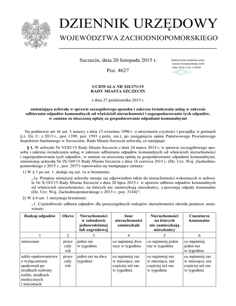 DZIENNIK URZĘDOWY WOJEWÓDZTWA ZACHODNIOPOMORSKIEGO Szczecin, dnia 20 listopada 2015 r. Elektronicznie podpisany przez: Kamilla Grobicka-Madej; ZUW Poz. 4627 Data: 2015-11-20 11:55:09 UCHWAŁA NR XII/271/15 RADY MIASTA SZCZECIN z dnia 27 października 2015 r. zmieniająca uchwałę w sprawie szczegółowego sposobu i zakresu świadczenia usług w zakresie odbierania odpadów komunalnych od właścicieli nieruchomości i zagospodarowania tych odpadów, w zamian za uiszczoną opłatę za gospodarowanie odpadami komunalnymi Na podstawie art. 6r ust. 3 ustawy z dnia 13 września 1996 r. o utrzymaniu czystości i porządku w gminach (j.t. Dz. U. z 2013 r., poz. 1399, poz. 1593 z późn. zm.), po zasięgnięciu opinii Państwowego Powiatowego Inspektora Sanitarnego w Szczecinie, Rada Miasta Szczecin uchwala, co następuje: § 1. W uchwale Nr VI/82/15 Rady Miasta Szczecin z dnia 24 marca 2015 r. w sprawie szczegółowego sposobu i zakresu świadczenia usług w zakresie odbierania odpadów komunalnych od właścicieli nieruchomości i zagospodarowania tych odpadów, w zamian za uiszczoną opłatę za gospodarowanie odpadami komunalnymi, zmienionej uchwałą Nr IX/169/15 Rady Miasta Szczecin z dnia 16 czerwca 2015 r. (Dz. Urz. Woj. Zachodniopomorskiego z 2015 r., poz. 2837) wprowadza się następujące zmiany: 1) W § 1 po ust. 1. dodaje się ust. 1a w brzmieniu: „1a. Przepisy niniejszej uchwały stosuje się odpowiednio także do nieruchomości wskazanych w uchwale Nr X/183/15 Rady Miasta Szczecin z dnia 28 lipca 2015 r. w sprawie odbioru odpadów komunalnych od właścicieli nieruchomości, na których nie zamieszkują mieszkańcy, a powstają odpady komunalne (Dz. Urz. Woj. Zachodniopomorskiego z 2015 r., poz. 3144)”; 2) W § 6 ust. 1 otrzymuje brzmienie: „1. Częstotliwość odbioru odpadów dla poszczególnych rodzajów nieruchomości określa poniższe zestawienie: Rodzaj odpadów 1 zmieszane szkło opakowaniowe z wyłączeniem opakowań po środkach ochrony roślin, środkach medycznych i truciznach Okres 2 przez cały rok przez cały rok Nieruchomości w zabudowie jednorodzinnej lub zagrodowej 3 jeden raz w tygodniu jeden raz na dwa tygodnie 4 co najmniej dwa razy w tygodniu Nieruchomości na których nie zamieszkują mieszkańcy 5 co najmniej jeden raz w tygodniu co najmniej raz w miesiącu, nie częściej niż raz w tygodniu co najmniej raz w miesiącu, nie częściej niż raz w tygodniu Inne nieruchomości zamieszkałe Cmentarze komunalne 6 co najmniej jeden raz w tygodniu co najmniej raz w miesiącu, nie częściej niż raz w tygodniu Dziennik Urzędowy Województwa Zachodniopomorskiego –2– opakowania z tworzyw sztucznych z wyłączeniem opakowań po środkach ochrony roślin, środkach medycznych i truciznach, metal, opakowania wielomateriałowe papier przez cały rok jeden raz na dwa tygodnie co najmniej raz w miesiącu, nie częściej niż raz w tygodniu co najmniej raz w miesiącu, nie częściej niż raz w tygodniu co najmniej raz w miesiącu, nie częściej niż raz w tygodniu przez cały rok jeden raz na dwa tygodnie odpady zielone 1.IV.- jeden raz 30.XI. w tygodniu co najmniej raz w miesiącu, nie częściej niż raz w tygodniu szesnaście razy w roku, w terminach uzgodnionych z podmiotem odbierającym odpady co najmniej raz w miesiącu, nie częściej niż raz w tygodniu co najmniej dwa razy w tygodniu 1.XII - jeden raz 31.III w miesiącu, w terminach uzgodnionych z podmiotem odbierającym odpady 1.I. - jeden raz 28.II. w tygodniu jeden raz w miesiącu, w terminach uzgodnionych z podmiotem odbierającym odpady dwa razy w tygodniu co najmniej raz w miesiącu, nie częściej niż raz w tygodniu - dla zabudowy jednorodzinnej: jeden raz w tygodniu, - dla zabudowy wielorodzinnej: szesnaście razy w roku, w terminach uzgodnionych z podmiotem odbierającym odpady jeden raz w miesiącu, w terminach uzgodnionych z podmiotem odbierającym odpady - dla zabudowy jednorodzinnej: jeden raz w tygodniu, - dla zabudowy wielorodzinnej: dwa razy w tygodniu cztery razy w roku w terminach uzgodnionych z podmiotem odbierającym odpady naturalne choinki odpady wielkogabarytowe „. przez cały rok cztery razy w roku dwadzieścia w terminach cztery razy uzgodnionych w roku z podmiotem odbierającym odpady Poz. 4627 co najmniej dwa razy w tygodniu _________ cztery razy w roku w terminach uzgodnionych z podmiotem odbierającym odpady Dziennik Urzędowy Województwa Zachodniopomorskiego –3– Poz. 4627 § 2. Wykonanie uchwały powierza się Prezydentowi Miasta Szczecin. § 3. Uchwała wchodzi w życie po upływie 14 dni od dnia ogłoszenia w Dzienniku Urzędowym Województwa Zachodniopomorskiego. Wiceprzewodniczący Rady Miasta Szczecin Tomasz Hinc