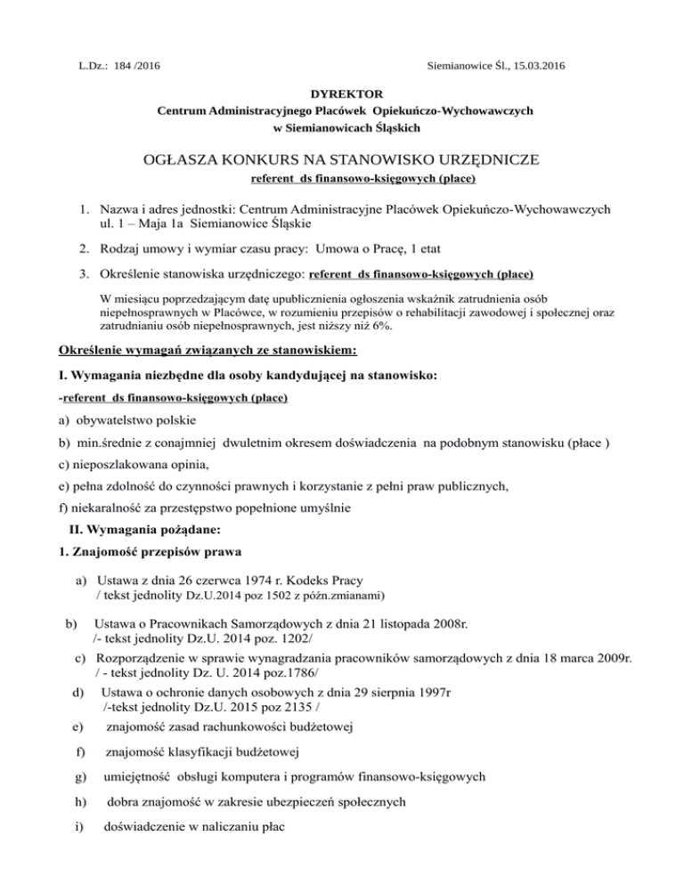 L.Dz.: 184 /2016 Siemianowice Śl., 15.03.2016 DYREKTOR Centrum Administracyjnego Placówek Opiekuńczo-Wychowawczych w Siemianowicach Śląskich OGŁASZA KONKURS NA STANOWISKO URZĘDNICZE referent ds finansowo-księgowych (płace) 1. Nazwa i adres jednostki: Centrum Administracyjne Placówek Opiekuńczo-Wychowawczych ul. 1 – Maja 1a Siemianowice Śląskie 2. Rodzaj umowy i wymiar czasu pracy: Umowa o Pracę, 1 etat 3. Określenie stanowiska urzędniczego: referent ds finansowo-księgowych (płace) W miesiącu poprzedzającym datę upublicznienia ogłoszenia wskaźnik zatrudnienia osób niepełnosprawnych w Placówce, w rozumieniu przepisów o rehabilitacji zawodowej i społecznej oraz zatrudnianiu osób niepełnosprawnych, jest niższy niż 6%. Określenie wymagań związanych ze stanowiskiem: I. Wymagania niezbędne dla osoby kandydującej na stanowisko: -referent ds finansowo-księgowych (płace) a) obywatelstwo polskie b) min.średnie z conajmniej dwuletnim okresem doświadczenia na podobnym stanowisku (płace ) c) nieposzlakowana opinia, e) pełna zdolność do czynności prawnych i korzystanie z pełni praw publicznych, f) niekaralność za przestępstwo popełnione umyślnie II. Wymagania pożądane: 1. Znajomość przepisów prawa a) Ustawa z dnia 26 czerwca 1974 r. Kodeks Pracy / tekst jednolity Dz.U.2014 poz 1502 z późn.zmianami) b) Ustawa o Pracownikach Samorządowych z dnia 21 listopada 2008r. /- tekst jednolity Dz.U. 2014 poz. 1202/ c) Rozporządzenie w sprawie wynagradzania pracowników samorządowych z dnia 18 marca 2009r. / - tekst jednolity Dz. U. 2014 poz.1786/ d) Ustawa o ochronie danych osobowych z dnia 29 sierpnia 1997r /-tekst jednolity Dz.U. 2015 poz 2135 / e) znajomość zasad rachunkowości budżetowej f) znajomość klasyfikacji budżetowej g) umiejętność obsługi komputera i programów finansowo-księgowych h) dobra znajomość w zakresie ubezpieczeń społecznych i) doświadczenie w naliczaniu płac i) umiejętność pracy w zespole j) obowiązkowość, dokładność, sumienność III. Zakres zadań na stanowisku: 1. Naliczanie i rozliczanie wynagrodzeń z umów o pracę oraz umów zleceń 2. Obsługa programu płacowego 3. Sporządzanie list płac 4. Sporządzanie zestawień płac dotyczących księgowań na kontach 5. Sporządzanie dokumentacji finansowej, deklaracji - rozliczenia z budżetem, ZUS, US i inne 6. Sporządzanie informacji i sprawozdawczości dotyczących zatrudnienia i płac dla GUS 7. Sporządzanie informacji sprawozdawczej dotyczącej PFRON 8. Obsługa programu Płatnik-terminowość przesyłania dokumentacji : - pracowników Centrum - wychowanków Centrum 9. Przygotowanie zestawień do sprawozdań finansowych 10. Prowadzenie dokumentacji i spraw związanych z ubezpieczeniem zdrowotnym wychowanków i pracowników. 11. Rozliczanie i sprawozdawczość z programów dostarczania żywności dla ubogich wg. potrzeb 12. Przygotowywanie dokumentów do zapłaty przelewem 13. Prowadzenie kasy Centrum i sporządzanie dokumentacji z tym związanej zgodnie z instrukcją kasową CAPOW. 14. Wykonywanie poleceń służbowych przełożonych IV. Wymagane dokumenty i oświadczenia 1. CV i list motywacyjny. 2. Kopie dokumentów potwierdzających posiadanie wymaganego wykształcenia, kopie dokumentów o ukończonych kursach podnoszących kwalifikacje. 3. Kopie dokumentów potwierdzających staż pracy, 4. Posiadane referencje, opinie o pracy wydane przez poprzednich pracodawców. 5. Oświadczenie, że kandydat ma pełną zdolność do czynności prawnych oraz korzysta z pełni praw publicznych, 6. Oświadczenie, że kandydat nie był prawomocnie skazany za przestępstwo przeciwko mieniu, przeciwko obrotowi gospodarczemu, przeciwko działalności instytucji państwowych oraz samorządu terytorialnego, przeciwko wiarygodności dokumentów lub za przestępstwo skarbowe. 7. Oświadczenie o wyrażeniu zgody na przetwarzanie danych osobowych zawartych w podaniu o pracę w zakresie niezbędnym do realizacji procesu rekrutacji - zgodnie z ustawą o ochronie danych osobowych /t.j. Dz.U. 2015 poz. 2135 / Wymagane dokumenty aplikacyjne należy składać osobiście w zamkniętej kopercie lub wysłać za pośrednictwem poczty listem poleconym. Koperta z ofertą powinna być opatrzona adnotacją : Nabór na wolne stanowisko: referent ds finansowo-księgowych (płace) w Centrum Administracyjnym Placówek Opiekuńczo-Wychowawczych w Siemianowicach Śląskich” oraz swoim imieniem, nazwiskiem, adresem do korespondencji, numerem telefonu. Dokumenty należy dostarczyć w terminie do dnia 30.03.2016 (decyduje data stempla pocztowego nadania listu do Centrum Administracyjnego Placówek Opiekuńczo -Wychowawczych w Siemianowicach Śląskich) na adres: Centrum Administracyjne Placówek Opiekuńczo-Wychowawczych w Siemianowicach Śląskich 41–100 Siemianowice Śląskie, ul. 1 Maja 1a II piętro - sekretariat CAPOW Aplikacje, dostarczone do CAPOW lub nadane pocztą po wyżej wyznaczonym terminie nie będą rozpatrywane. Rozstrzygnięcie naboru nastąpi na zasadach określonych w ustawie o pracownikach samorządowych Etap I - sprawdzenie kompletności dokumentacji zawartej w ofercie i jej zgodności z pod względem formalnym z wymaganiami Etap II -test wiedzy i umiejętności praktycznych Etap III - rozmowa kwalifikacyjna. Kandydat wybrany w naborze będzie zobowiązany przedłożyć, najpóźniej w dniu zawarcia z nim umowy o pracę, oryginał zaświadczenia o braku prawomocnego skazania za przestępstwo umyślne, uzyskanego na swój koszt z Krajowego Rejestru Karnego. Oferty odrzucone w poszczególnych etapach rekrutacji zostaną komisyjnie zniszczone prosimy nie załączać oryginałów dokumentów do oferty pracy, a jedynie kserokopie. O terminie i miejscu Etapu II i III naboru zakwalifikowani kandydaci zostaną powiadomieni telefonicznie. Dyrektor CAPOW w Siemianowicach Śląskich mgr Katarzyna Stawik