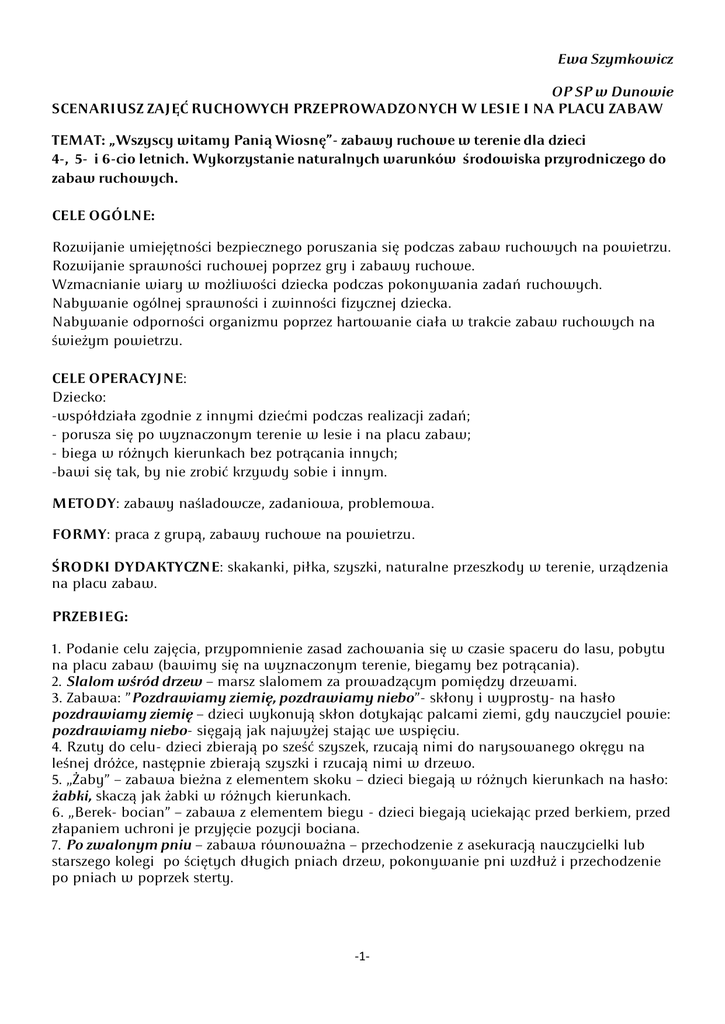 Ewa Szymkowicz OP SP w Dunowie SCENARIUSZ ZAJĘĆ RUCHOWYCH PRZEPROWADZONYCH W LESIE I NA PLACU ZABAW TEMAT: „Wszyscy witamy Panią Wiosnę”- zabawy ruchowe w terenie dla dzieci 4-, 5- i 6-cio letnich. Wykorzystanie naturalnych warunków środowiska przyrodniczego do zabaw ruchowych. CELE OGÓLNE: Rozwijanie umiejętności bezpiecznego poruszania się podczas zabaw ruchowych na powietrzu. Rozwijanie sprawności ruchowej poprzez gry i zabawy ruchowe. Wzmacnianie wiary w możliwości dziecka podczas pokonywania zadań ruchowych. Nabywanie ogólnej sprawności i zwinności fizycznej dziecka. Nabywanie odporności organizmu poprzez hartowanie ciała w trakcie zabaw ruchowych na świeżym powietrzu. CELE OPERACYJNE: Dziecko: -współdziała zgodnie z innymi dziećmi podczas realizacji zadań; - porusza się po wyznaczonym terenie w lesie i na placu zabaw; - biega w różnych kierunkach bez potrącania innych; -bawi się tak, by nie zrobić krzywdy sobie i innym. METODY: zabawy naśladowcze, zadaniowa, problemowa. FORMY: praca z grupą, zabawy ruchowe na powietrzu. ŚRODKI DYDAKTYCZNE: skakanki, piłka, szyszki, naturalne przeszkody w terenie, urządzenia na placu zabaw. PRZEBIEG: 1. Podanie celu zajęcia, przypomnienie zasad zachowania się w czasie spaceru do lasu, pobytu na placu zabaw (bawimy się na wyznaczonym terenie, biegamy bez potrącania). 2. Slalom wśród drzew – marsz slalomem za prowadzącym pomiędzy drzewami. 3. Zabawa: ”Pozdrawiamy ziemię, pozdrawiamy niebo”- skłony i wyprosty- na hasło pozdrawiamy ziemię – dzieci wykonują skłon dotykając palcami ziemi, gdy nauczyciel powie: pozdrawiamy niebo- sięgają jak najwyżej stając we wspięciu. 4. Rzuty do celu- dzieci zbierają po sześć szyszek, rzucają nimi do narysowanego okręgu na leśnej dróżce, następnie zbierają szyszki i rzucają nimi w drzewo. 5. „Żaby” – zabawa bieżna z elementem skoku – dzieci biegają w różnych kierunkach na hasło: żabki, skaczą jak żabki w różnych kierunkach. 6. „Berek- bocian” – zabawa z elementem biegu - dzieci biegają uciekając przed berkiem, przed złapaniem uchroni je przyjęcie pozycji bociana. 7. Po zwalonym pniu – zabawa równoważna – przechodzenie z asekuracją nauczycielki lub starszego kolegi po ściętych długich pniach drzew, pokonywanie pni wzdłuż i przechodzenie po pniach w poprzek sterty. -1- 8.Bieg do celu parami’’ -upatrzenie sobie jakiegoś punktu odległego i zdążanie do niego po linii krzywej, klucząc przez dłuższy czas, zanim dobiegną do celu. 9.Bieg parami- na sygnał dzieci , parami biegną w kierunku nauczycielki. Wygrywa para, która pierwsza dobiegnie. Na placu zabaw: 10. Zabawy na urządzeniach terenowych- wspinanie się, korzystanie z huśtawek, zjeżdżalni, równoważni. 11. Rzuty i chwyty piłki. 12. Zabawy ze skakankami: skoki przez skakankę, koniki, złap węża – berek. 13.Ewaluacja – rundka- rozmowa z dziećmi na temat tego, która z zabaw była najbardziej atrakcyjna, co było łatwe, trudne, itp. -2-